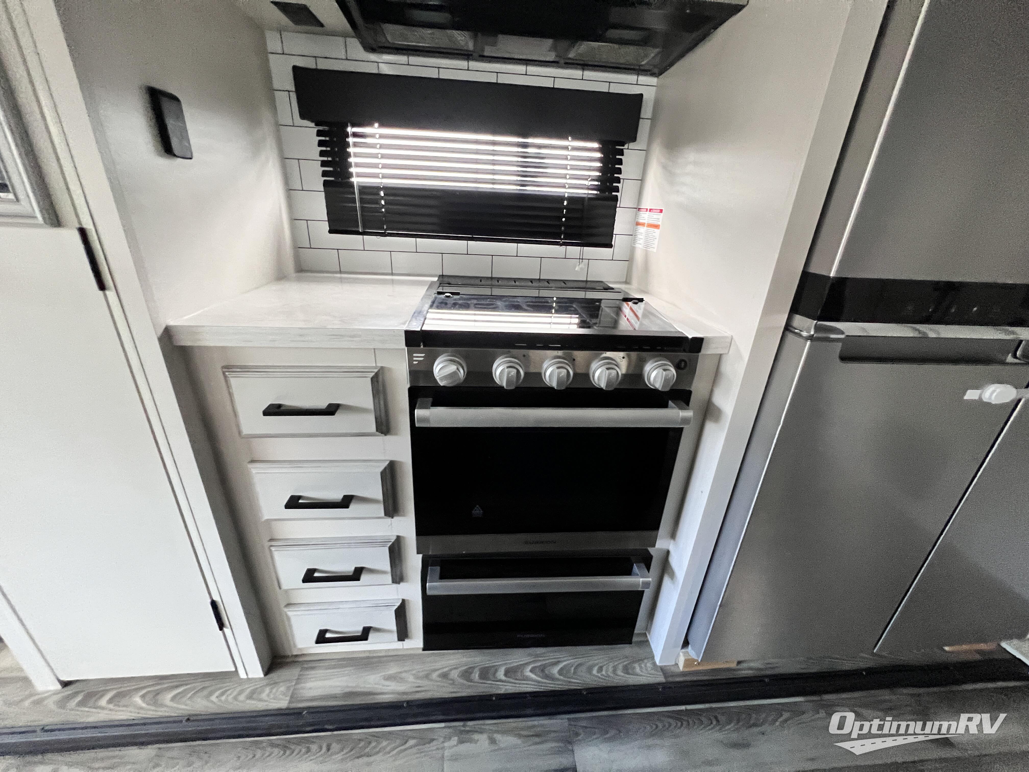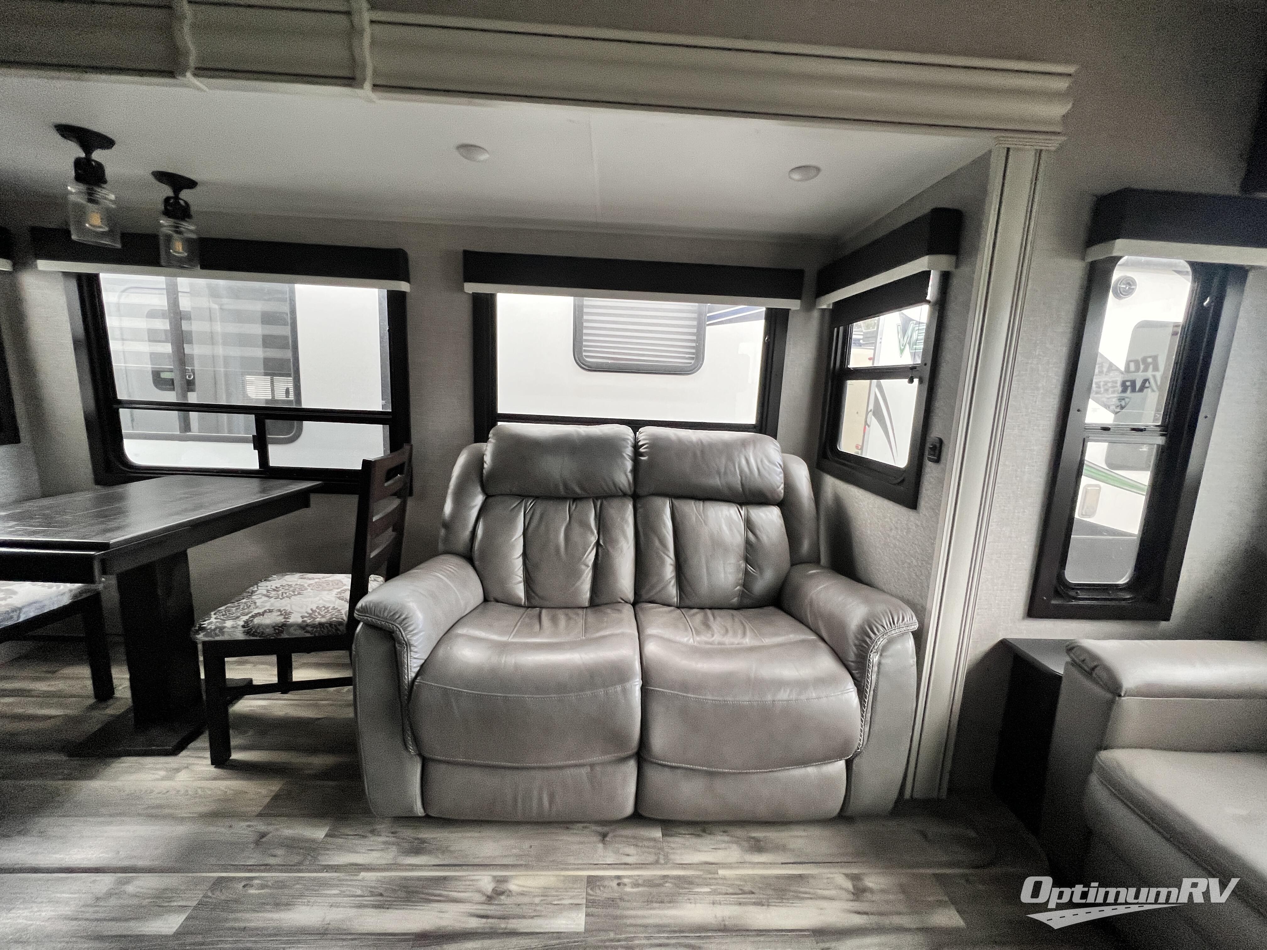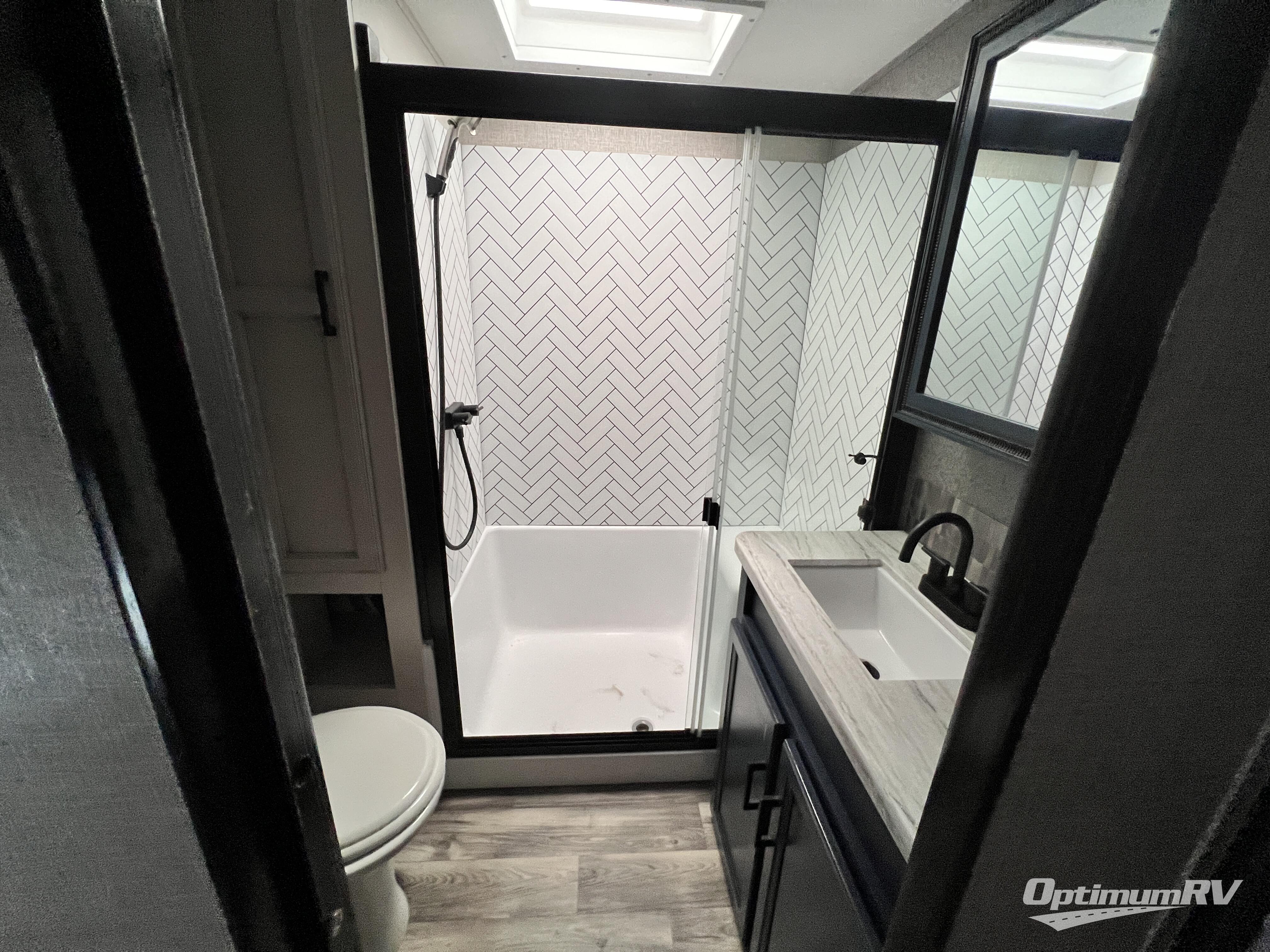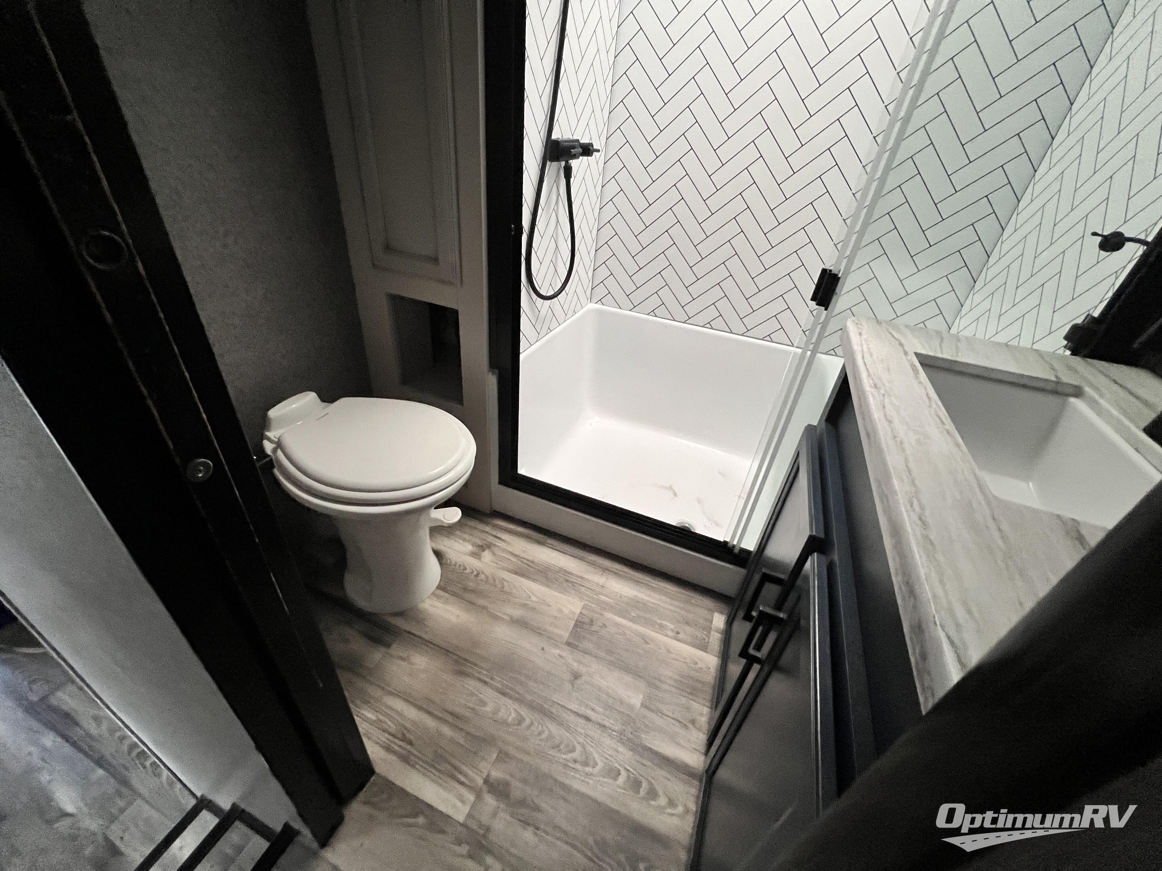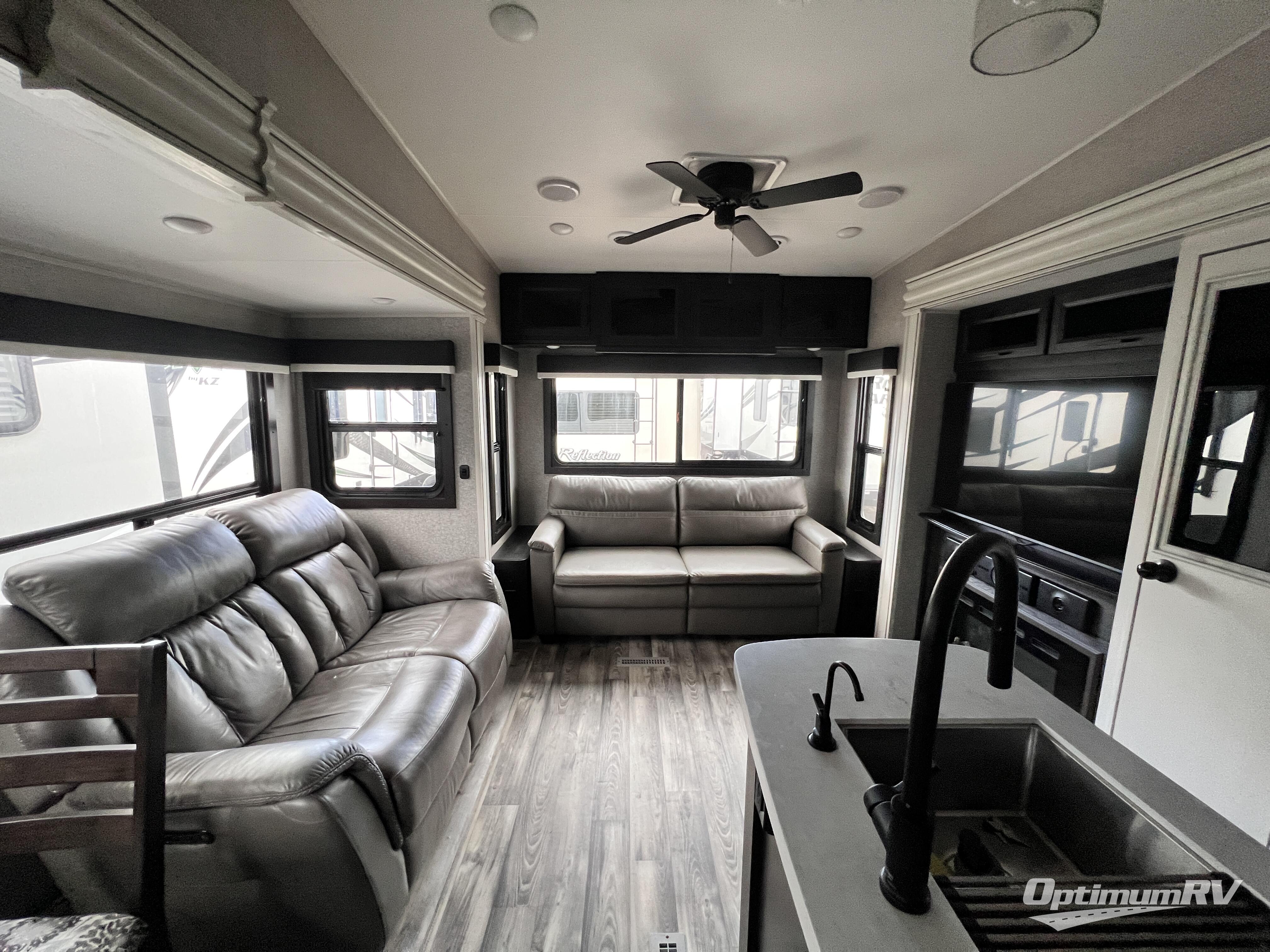 Triple slides for space, plenty of seating spaces, plus a spacious private bedroom make this fifth wheel one you won't want to pass up! You can freshen up each day in the full bath that includes a shower with a seat, a bathroom skylight, plus blue LED nightlights the little ones are sure to love. Once you've cut up some fresh fruit at the kitchen island, whip up some eggs and bacon for breakfast, or just grab the cereal from the walk-in pantry. There is a spacious 21 cu. ft. residential refrigerator, plus a hutch where you can store your own coffee machine. Relax on the tri-fold sofa, theater seat, or free-standing table before heading out for the day. The queen bed slide out in the front private bedroom will be waiting for you when you return, or you can choose the optional king bed for more space to stretch out!