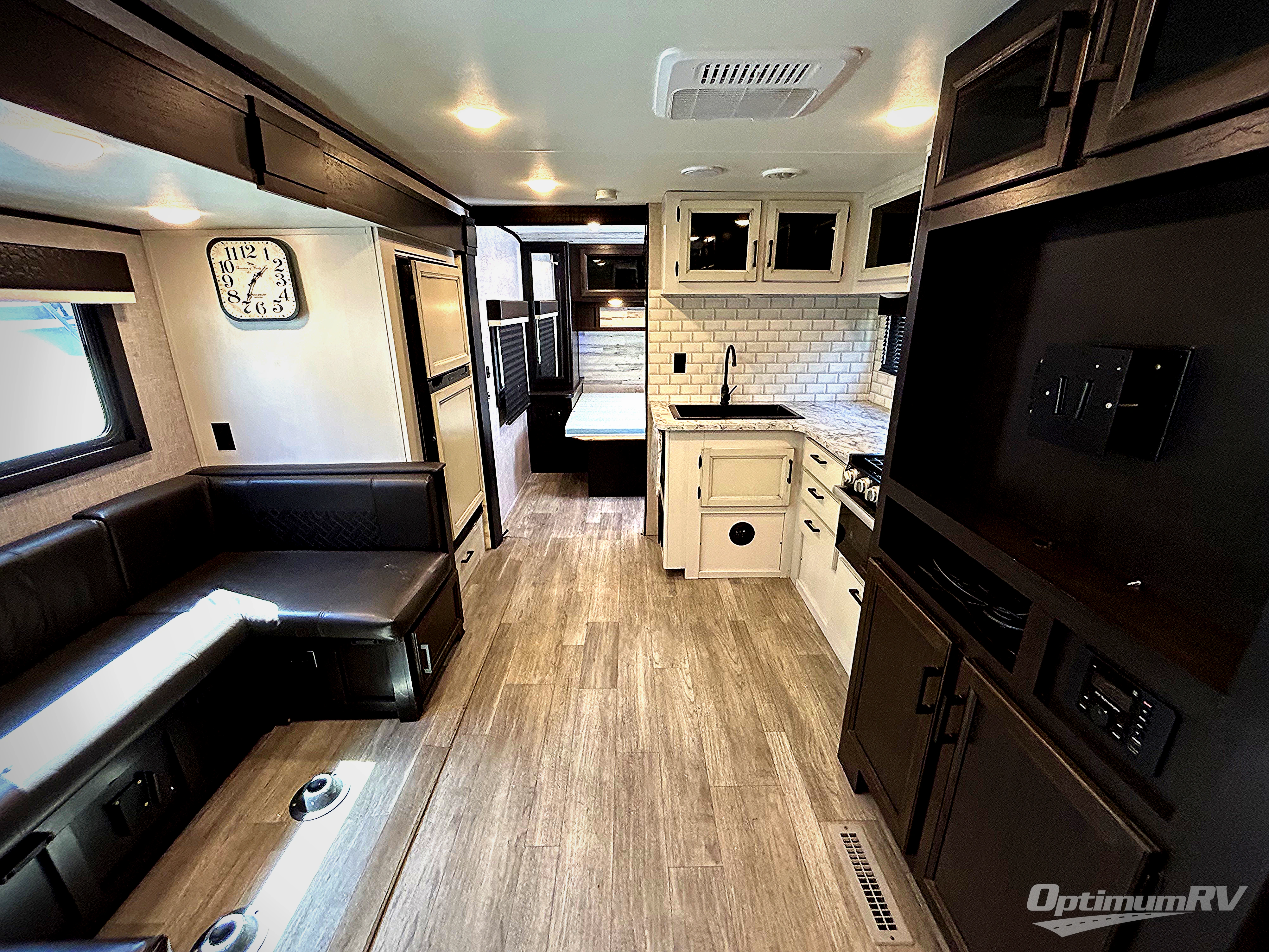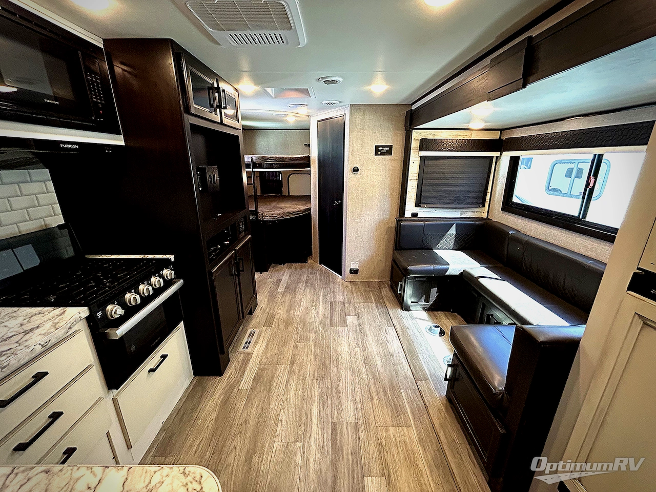 There is so much to love about this trailer from the double-size bunks in the rear with a ladder for easy access, plus the cargo door that allows you to stow larger items from the exterior to the interior underneath the bunks. You also have exterior storage compartments for outdoor gear. And the cook can choose to make meals using the outside kitchen including a fridge to store some cold items or the inside kitchen with full amenities including a 6 cu. ft. refrigerator and a flip-up counter for more space to prepare meals and dry the dishes. The walk-in pantry is a nice feature as well especially when you have a big crew. There is a private bedroom up front with the second exterior entry and a queen bed, plus the main area offers a U-shaped dinette and LED TV to watch. And you might like to add a few options such as an L-lounge or theater seats in place of the dinette, 12V heated tank pads if you plan to camp often in the cold weather, and/or the Solar Power package if you like staying off-grid.