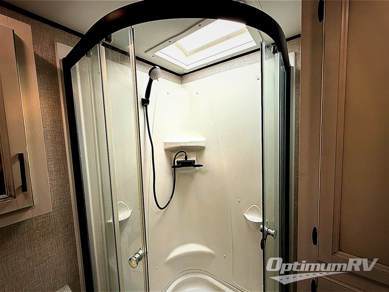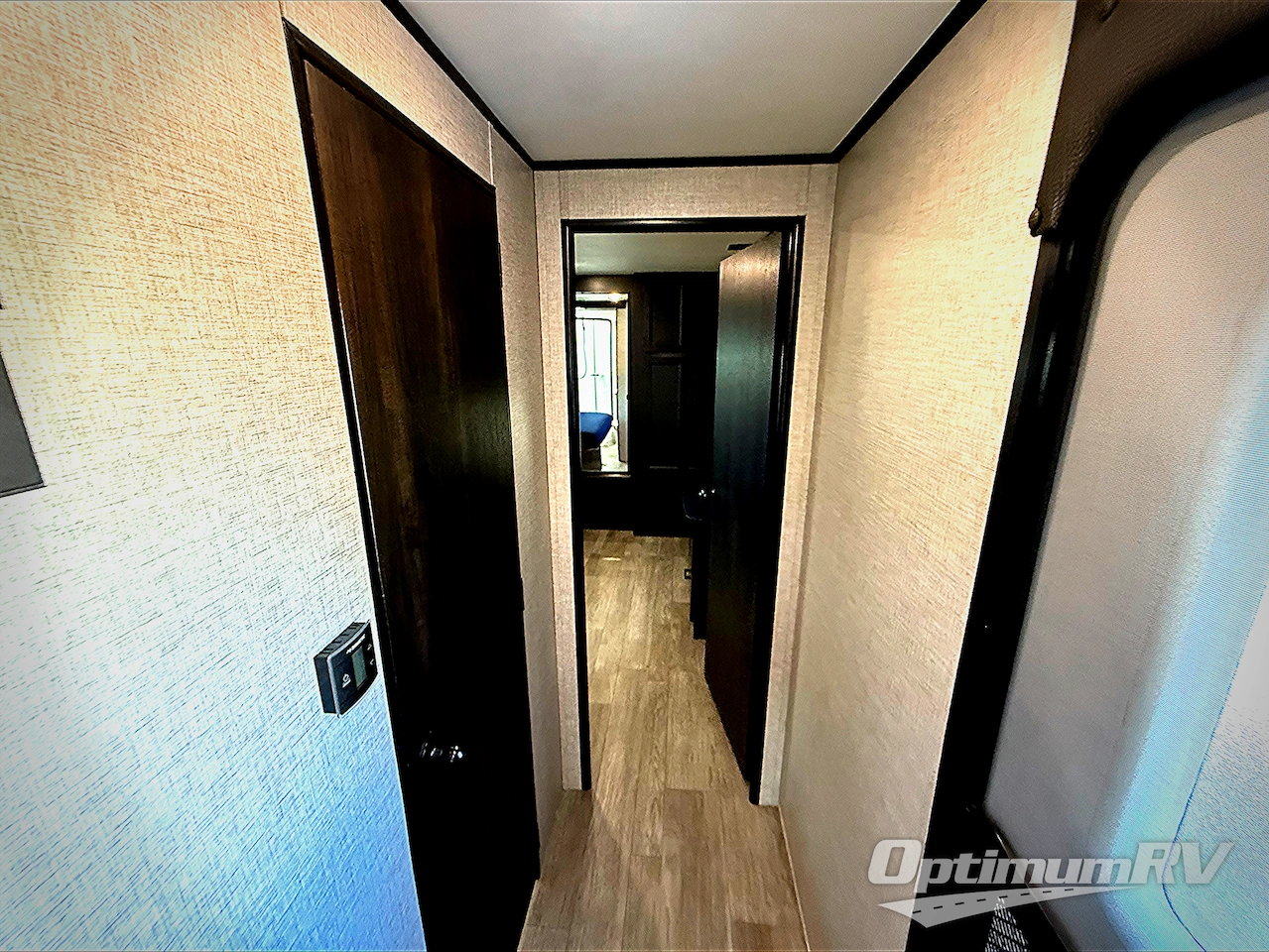 This Jay Flight travel trailer is very similar to model 34RLOK with just a few tweaks! The fireplace sits below the entertainment center, and both items are across from the theater seating. You'll also have a jackknife sofa right there so that others can join in on the relaxation, and the booth dinette is situated next to the theater seating so that it can also be used as seating during movie nights. A kitchen island adds function to the kitchen, and it also serves as a great dishwashing station. You can cook just about anything on the three-burner range, and the pantry will help you store your snacks. You'll also be able to access the dual-entry bathroom from the main hallway or the front bedroom.