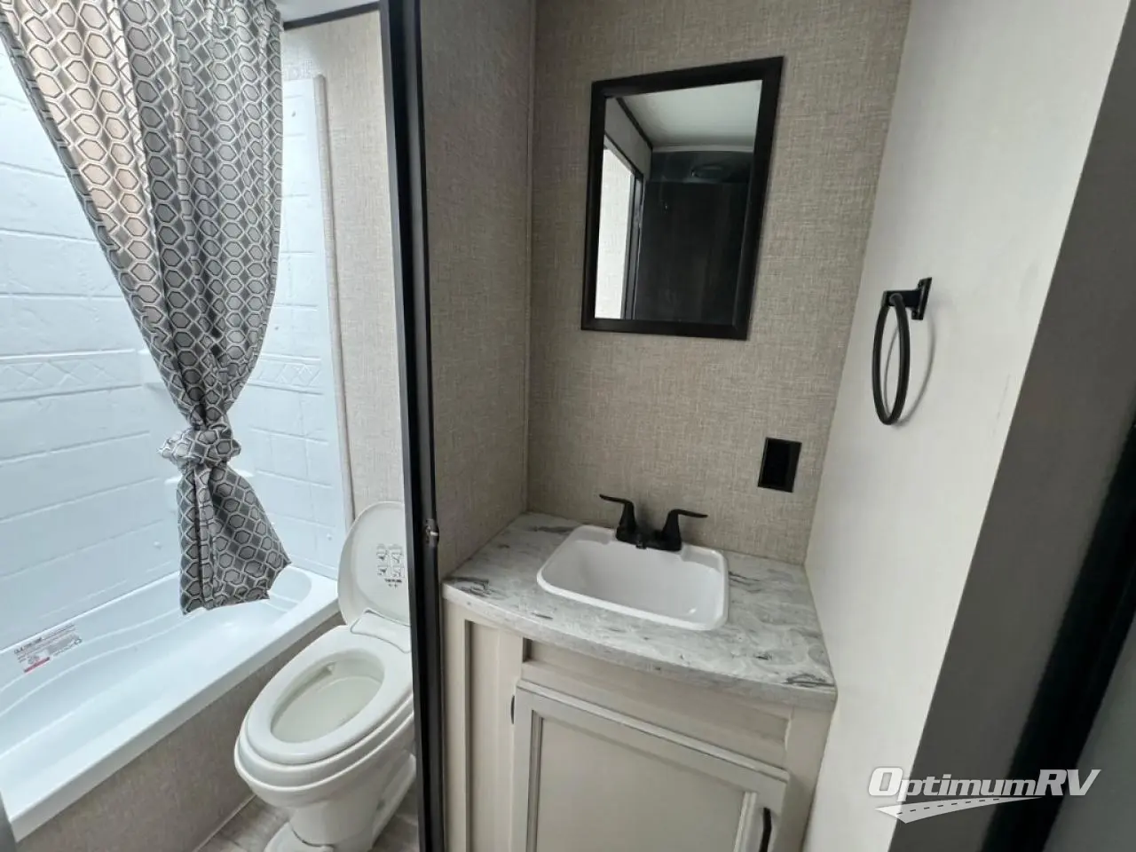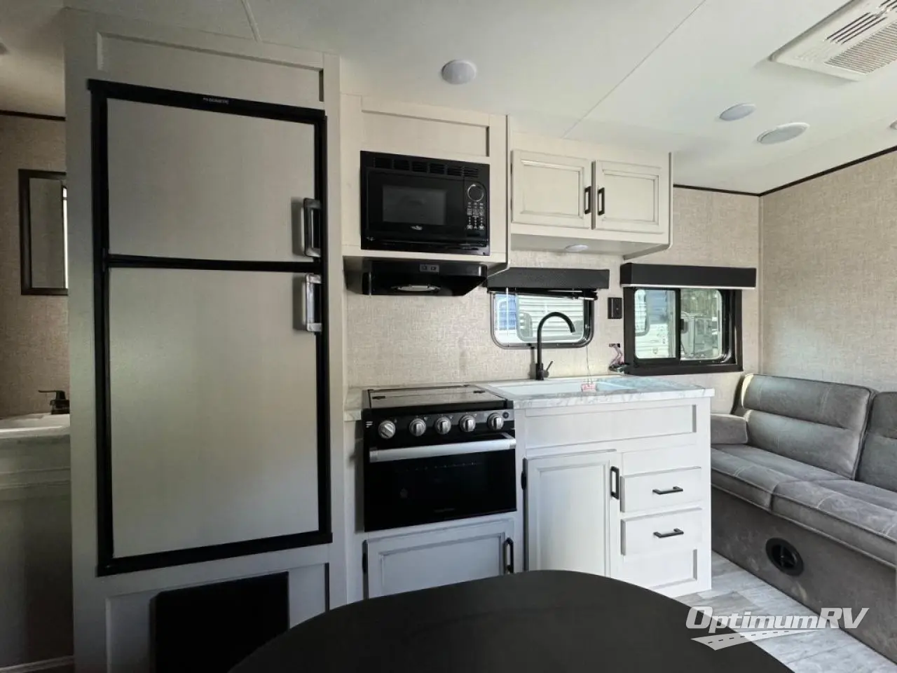 This easy to setup trailer offers a semi-private bedroom up front with a queen bed, semi-private double size bunks in the rear thanks to the curtains, and a private toilet and tub/shower room. The bathroom sink is just outside the door allowing two people to get ready for bed at once. The galley kitchen offers full amenities, and two can dine at the booth dinette and some can relax on the jack-knife sofa. Both furnishings offer extra sleeping space. And you might like to add the Chil N' Stor option which adds a fridge and counter space along the exterior to serve meals outside and store extra beverages.