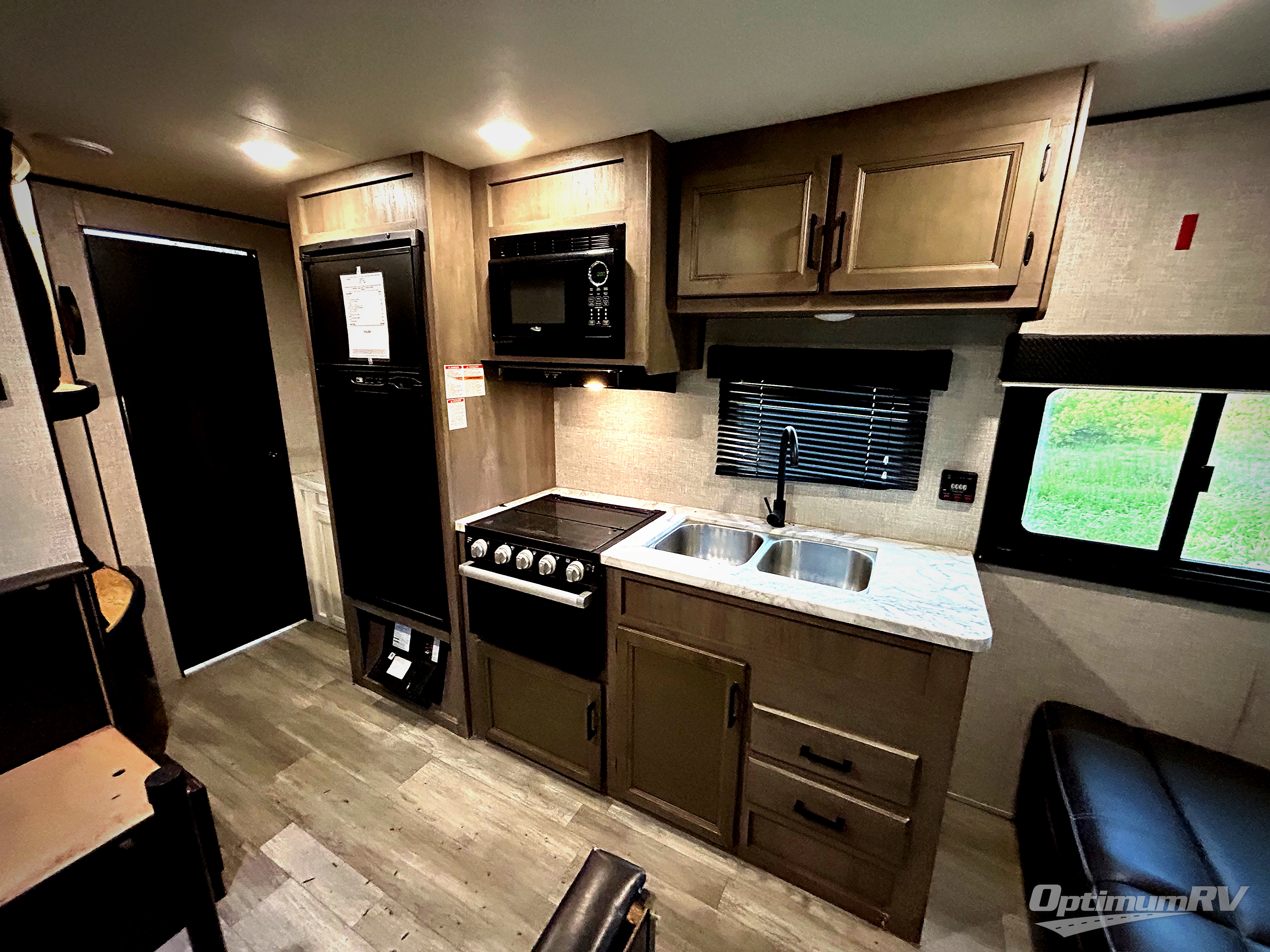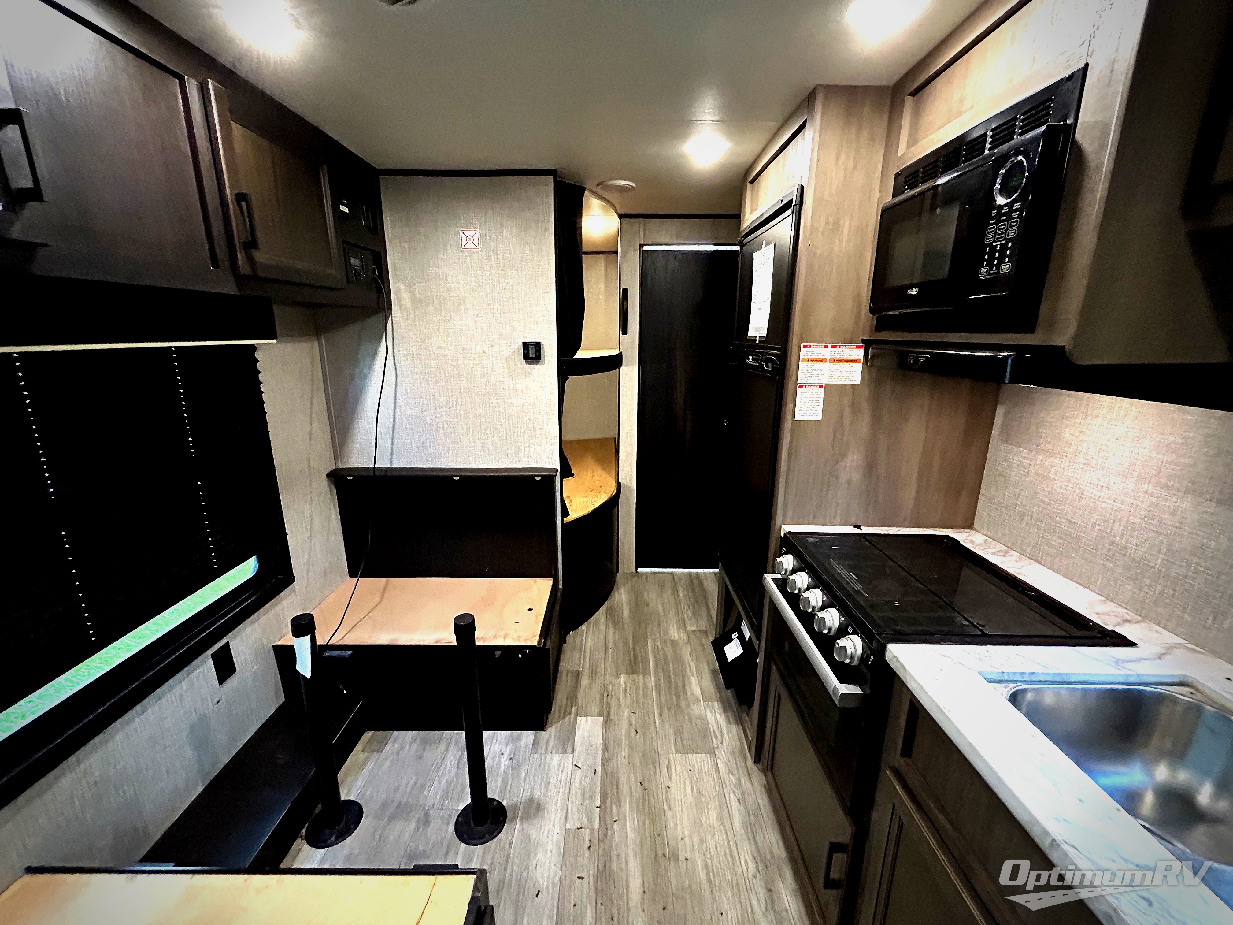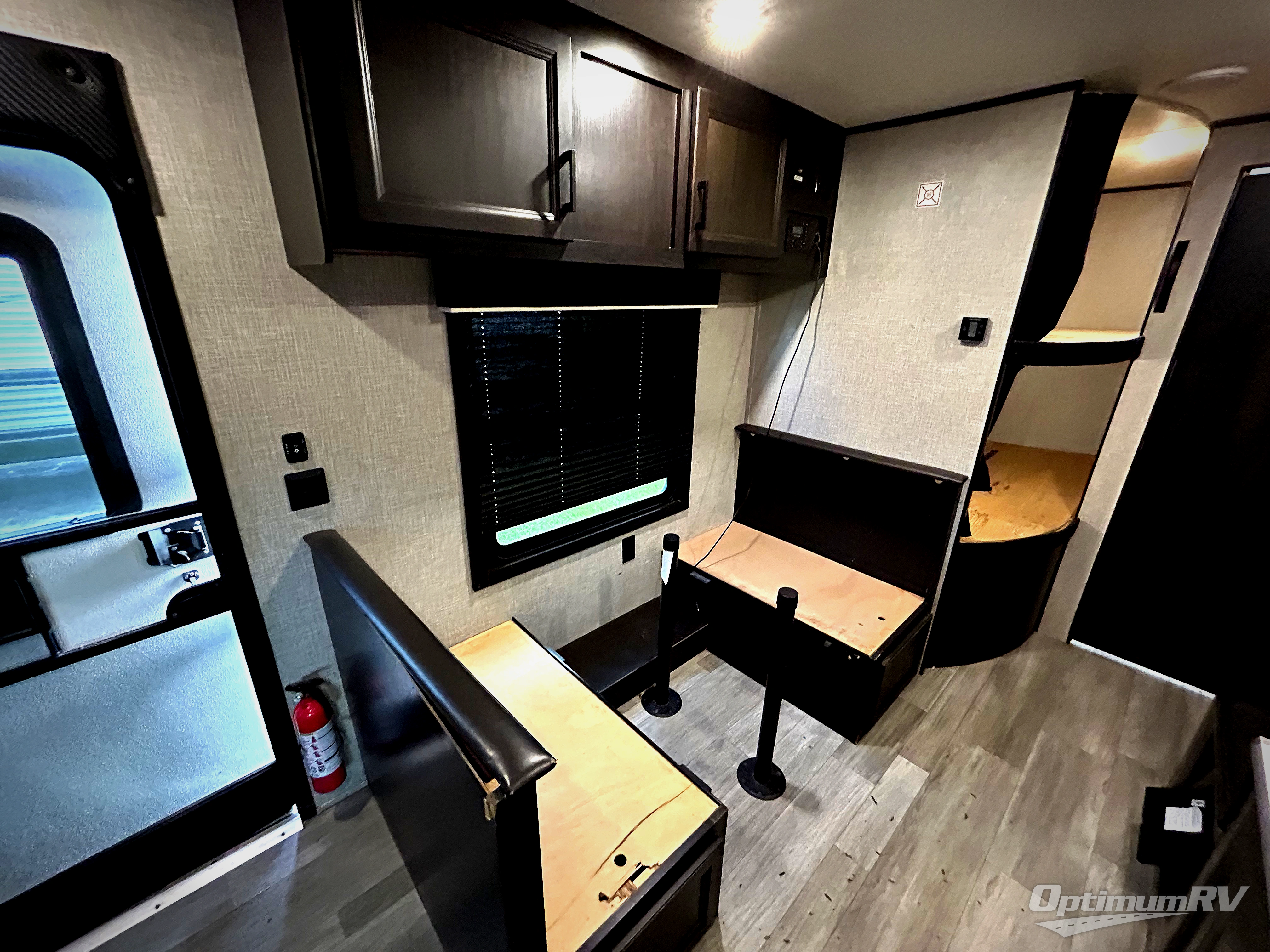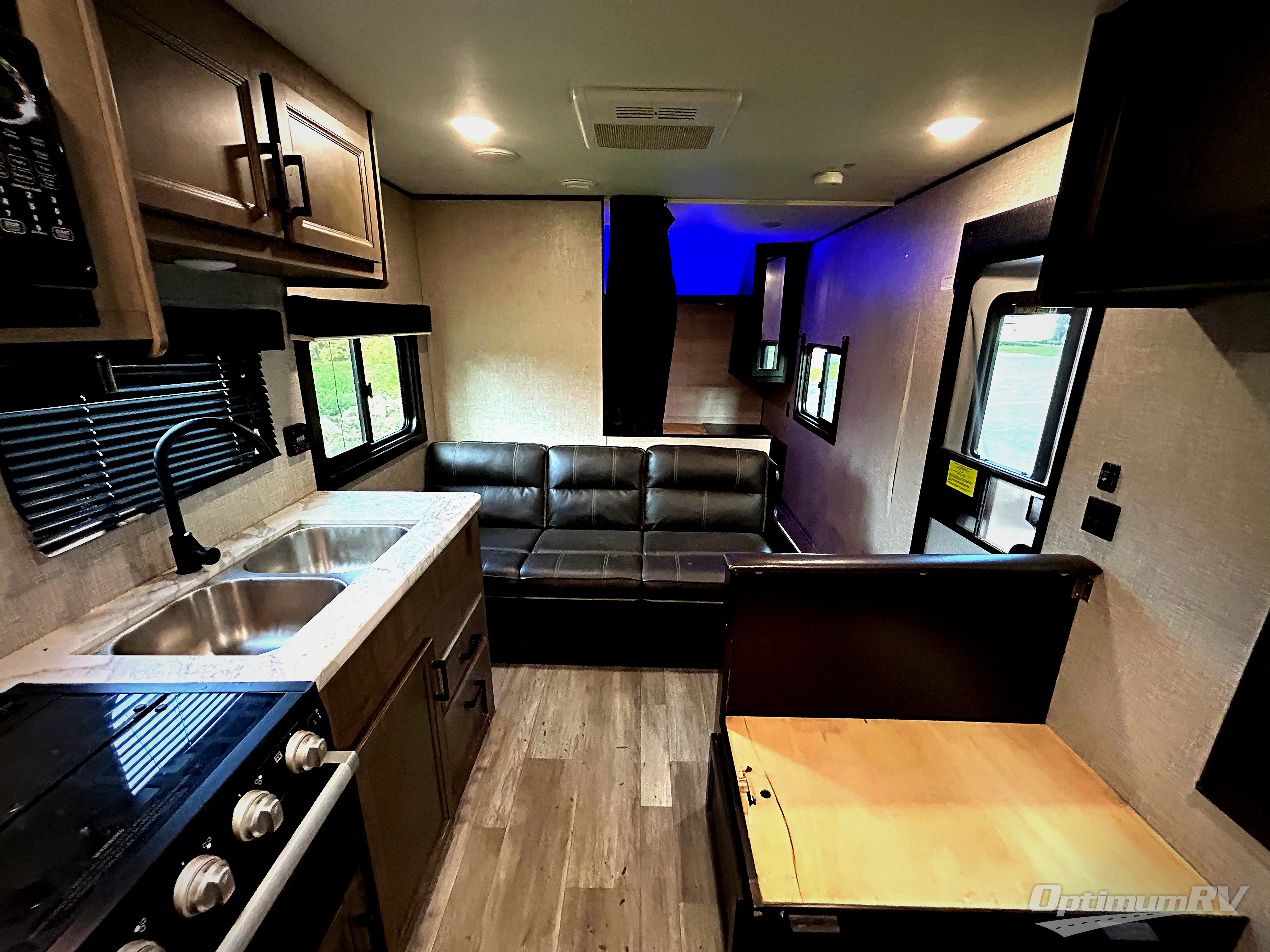 This easy to setup trailer offers a semi-private bedroom up front with a queen bed, semi-private double size bunks in the rear thanks to the curtains, and a private toilet and tub/shower room. The bathroom sink is just outside the door allowing two people to get ready for bed at once. The galley kitchen offers full amenities, and two can dine at the booth dinette and some can relax on the jack-knife sofa. Both furnishings offer extra sleeping space. And you might like to add the Chil N' Stor option which adds a fridge and counter space along the exterior to serve meals outside and store extra beverages.
