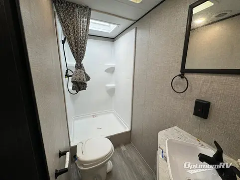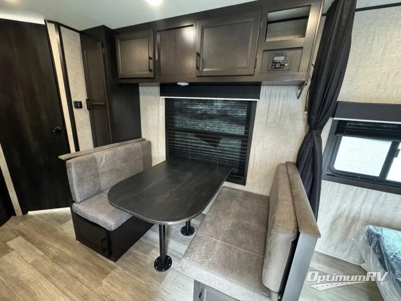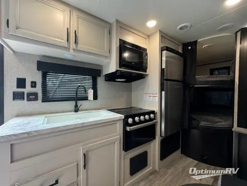 This easy to setup trailer offers a semi-private bedroom up front with a queen bed, semi-private double size bunks in the rear thanks to the curtains, and a private toilet and tub/shower room. The bathroom sink is just outside the door allowing two people to get ready for bed at once. The galley kitchen offers full amenities, and two can dine at the booth dinette and some can relax on the jack-knife sofa. Both furnishings offer extra sleeping space. And you might like to add the Chil N' Stor option which adds a fridge and counter space along the exterior to serve meals outside and store extra beverages.