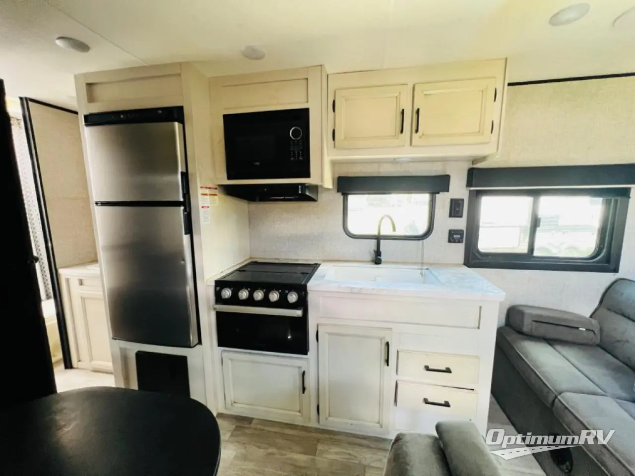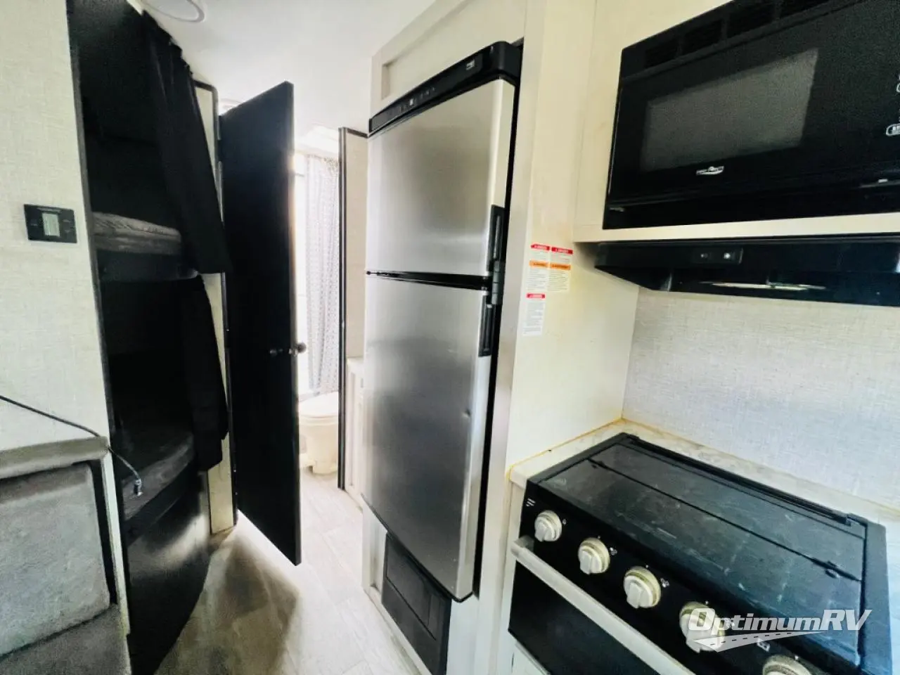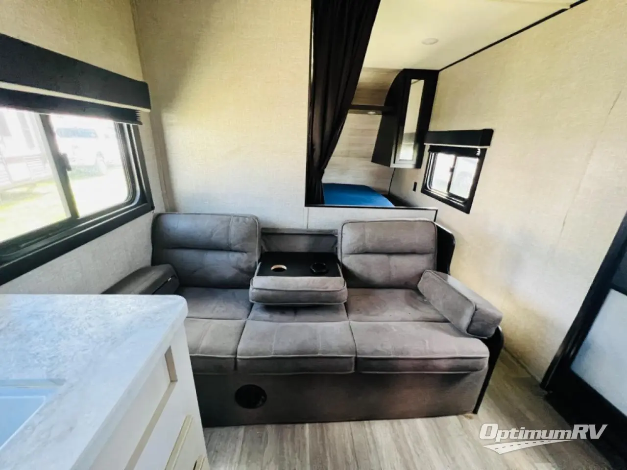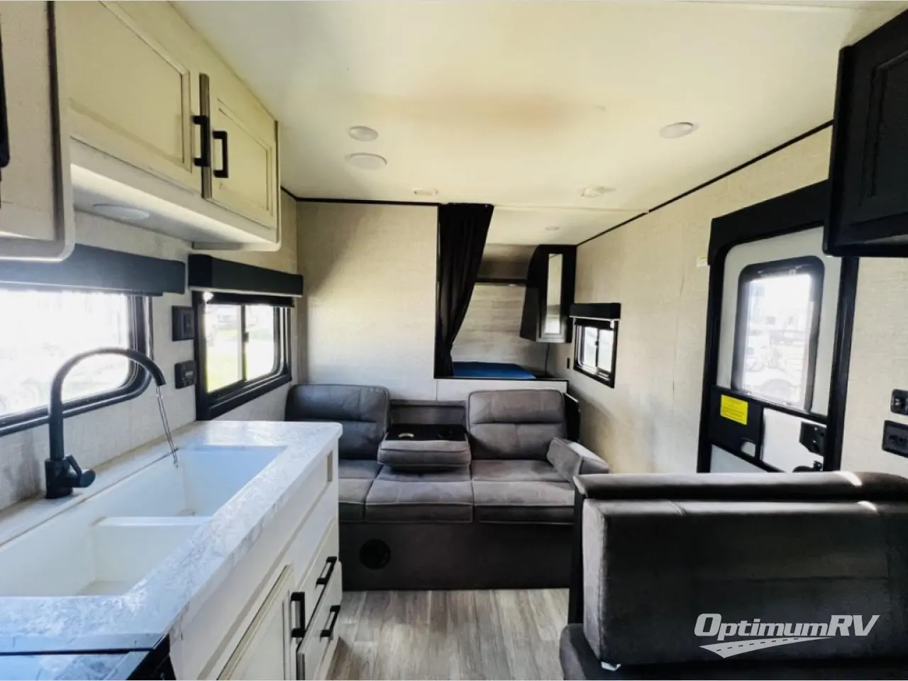 This easy to setup trailer offers a semi-private bedroom up front with a queen bed, semi-private double size bunks in the rear thanks to the curtains, and a private toilet and tub/shower room. The bathroom sink is just outside the door allowing two people to get ready for bed at once. The galley kitchen offers full amenities, and two can dine at the booth dinette and some can relax on the jack-knife sofa. Both furnishings offer extra sleeping space. And you might like to add the Chil N' Stor option which adds a fridge and counter space along the exterior to serve meals outside and store extra beverages.