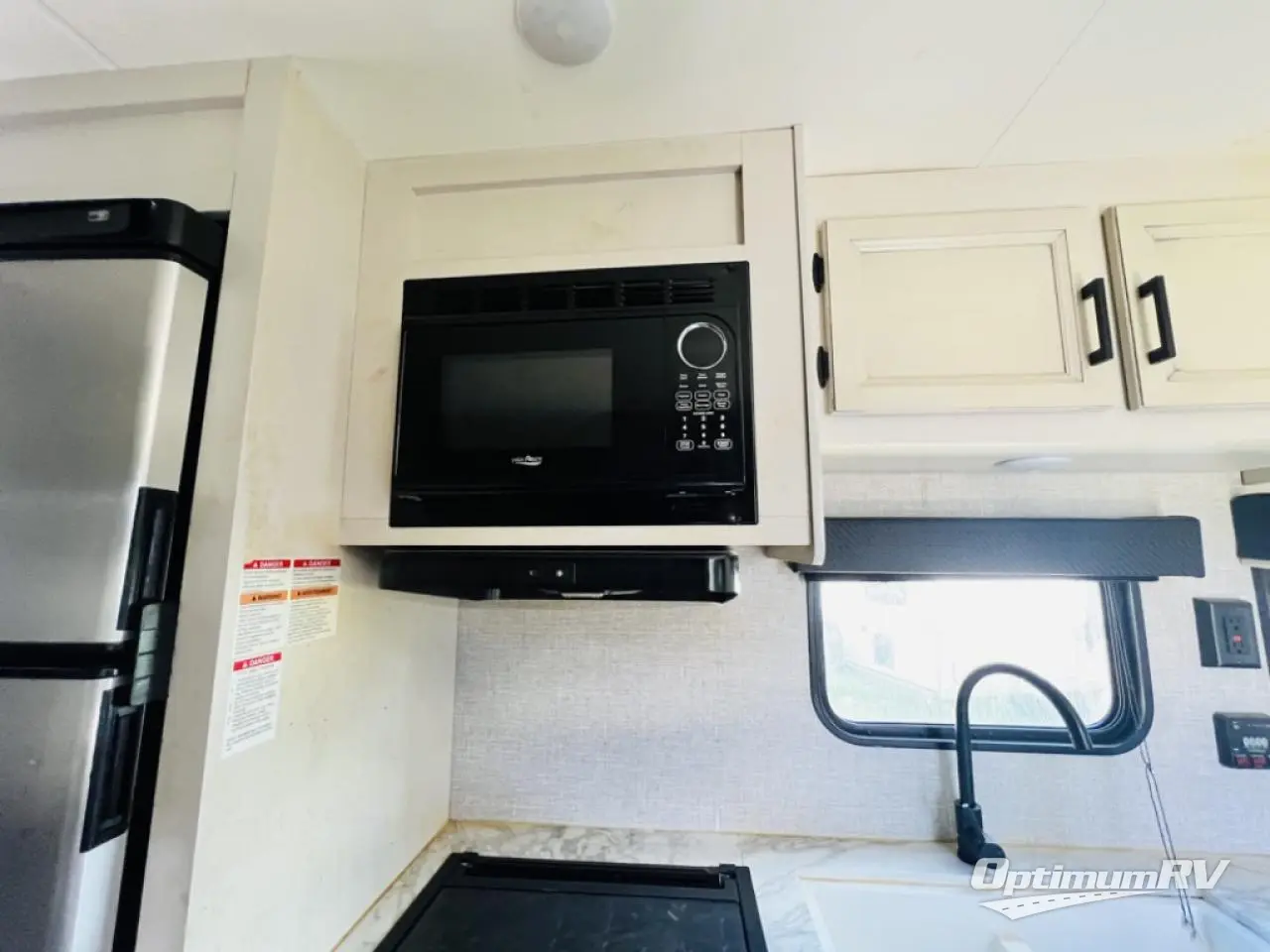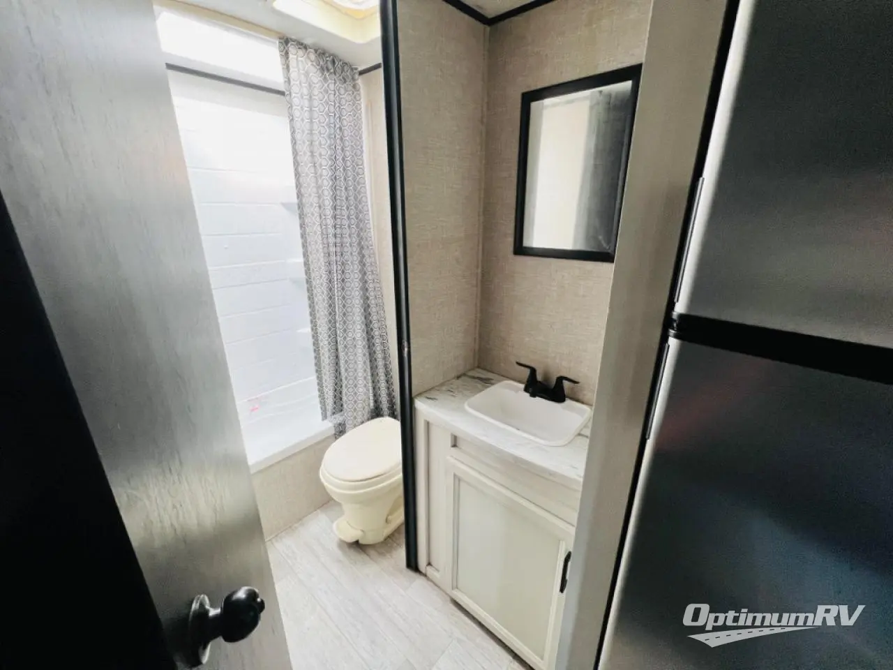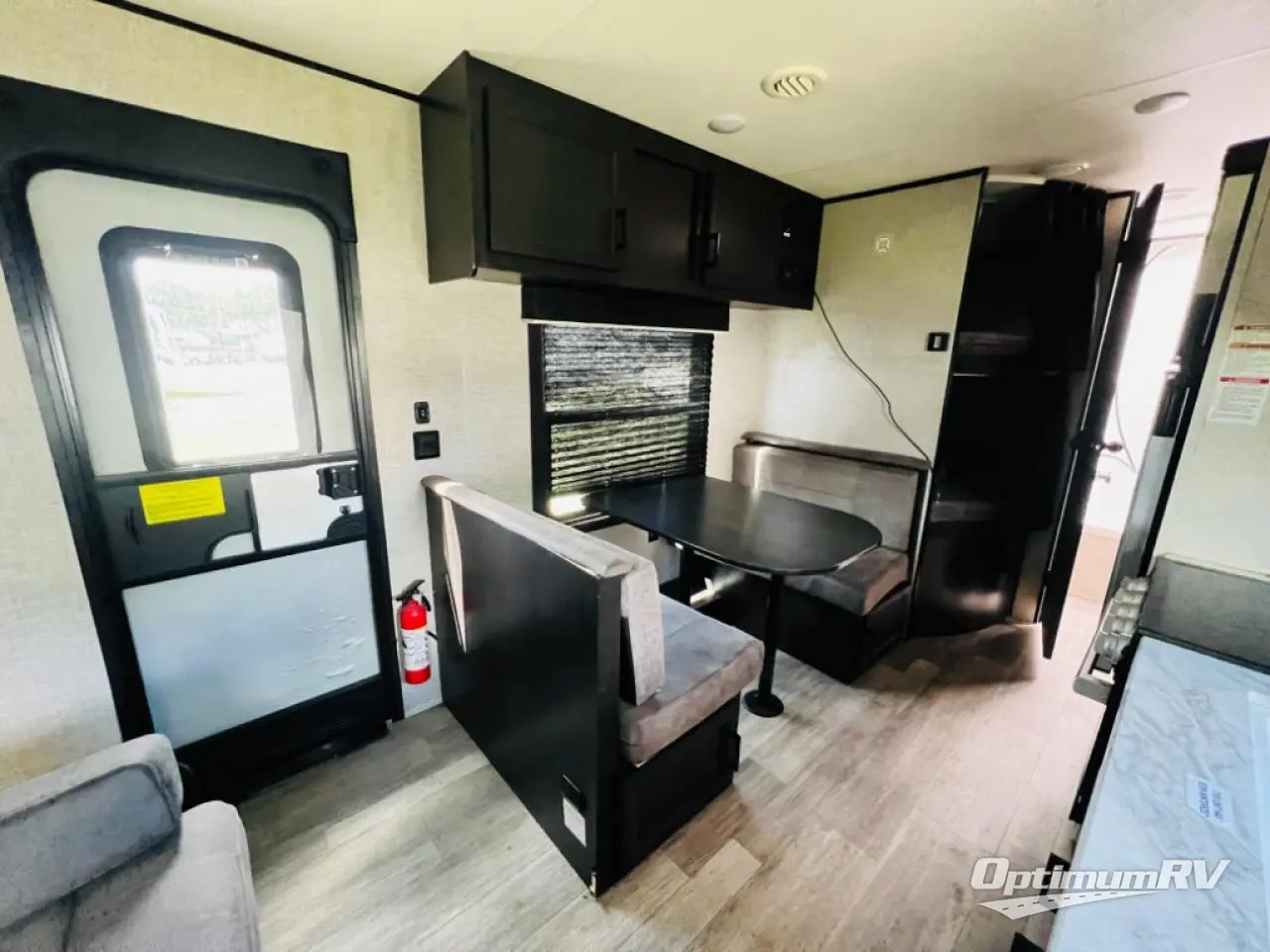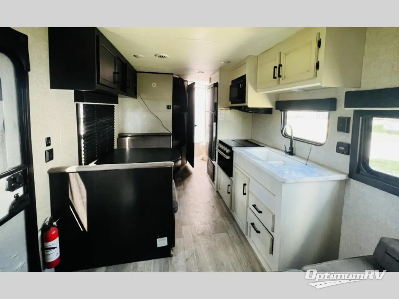 This easy to setup trailer offers a semi-private bedroom up front with a queen bed, semi-private double size bunks in the rear thanks to the curtains, and a private toilet and tub/shower room. The bathroom sink is just outside the door allowing two people to get ready for bed at once. The galley kitchen offers full amenities, and two can dine at the booth dinette and some can relax on the jack-knife sofa. Both furnishings offer extra sleeping space. And you might like to add the Chil N' Stor option which adds a fridge and counter space along the exterior to serve meals outside and store extra beverages.