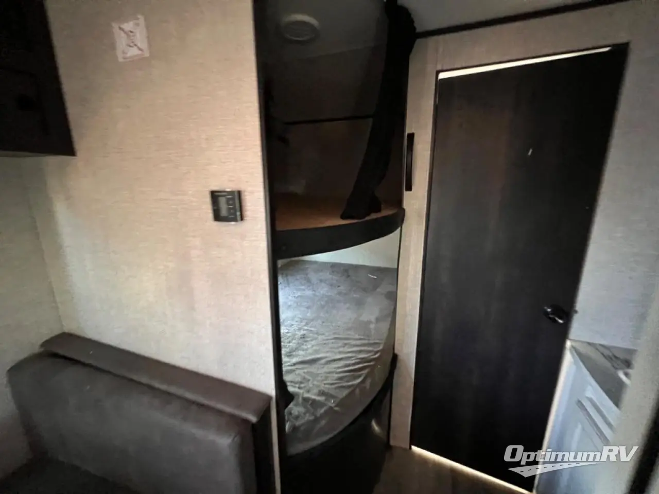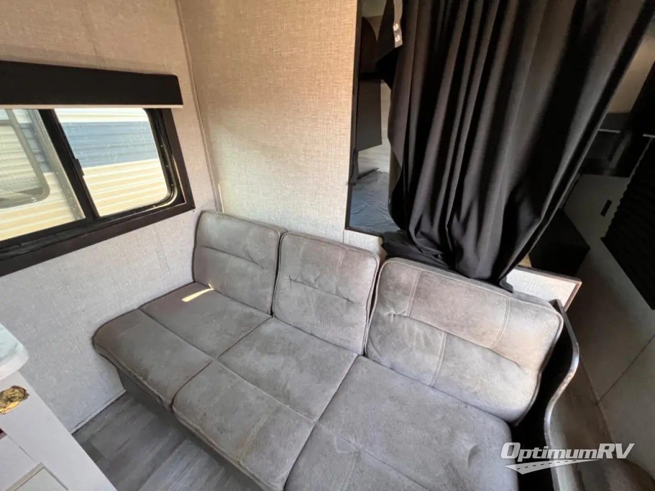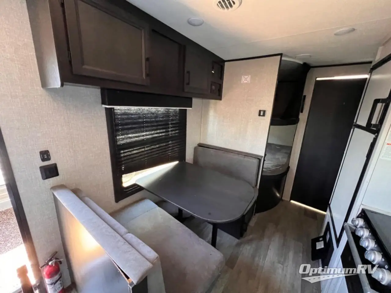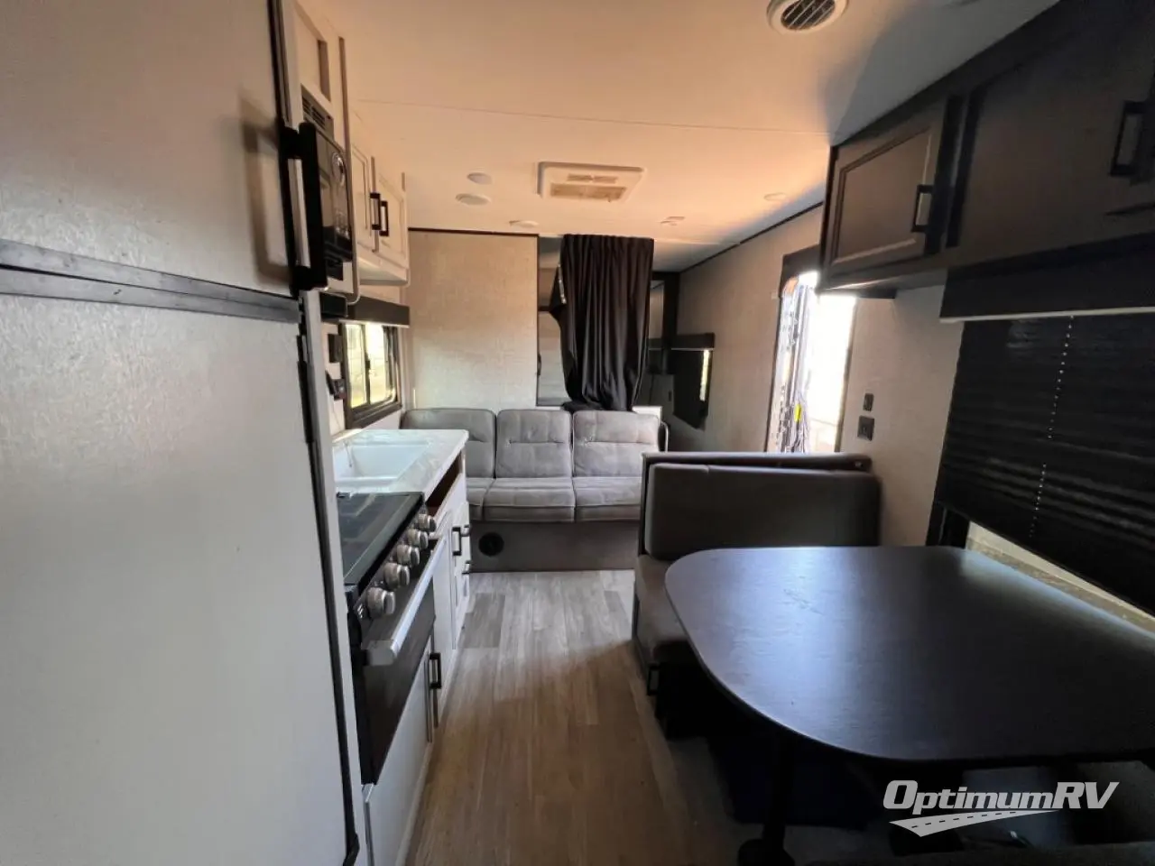 This easy to setup trailer offers a semi-private bedroom up front with a queen bed, semi-private double size bunks in the rear thanks to the curtains, and a private toilet and tub/shower room. The bathroom sink is just outside the door allowing two people to get ready for bed at once. The galley kitchen offers full amenities, and two can dine at the booth dinette and some can relax on the jack-knife sofa. Both furnishings offer extra sleeping space. And you might like to add the Chil N' Stor option which adds a fridge and counter space along the exterior to serve meals outside and store extra beverages.