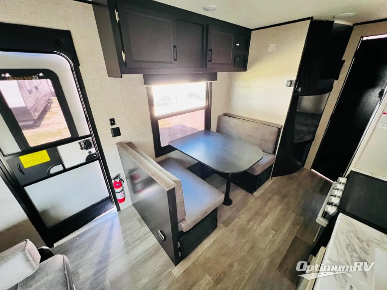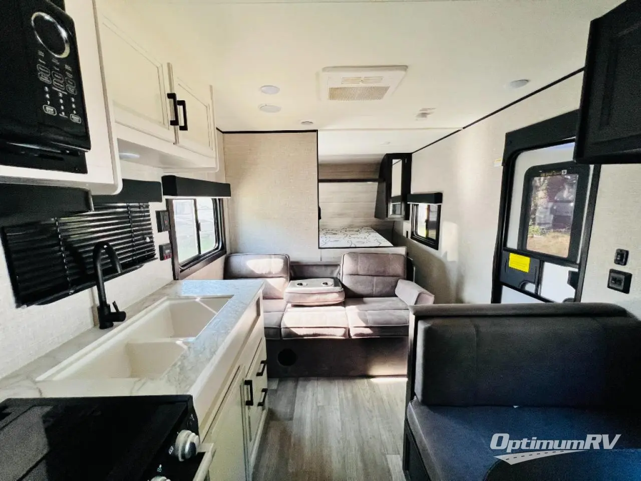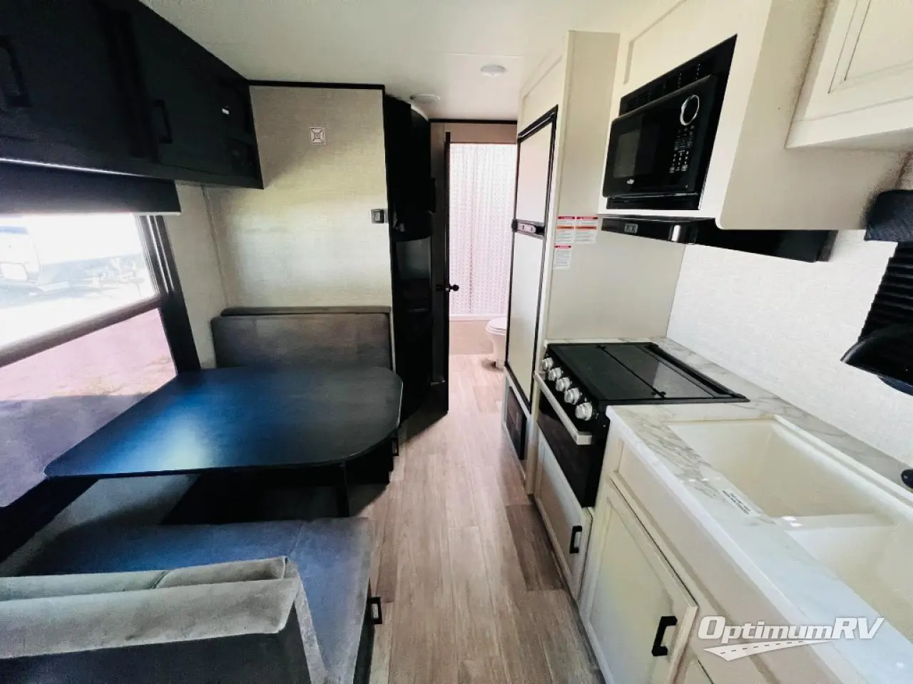 This easy to setup trailer offers a semi-private bedroom up front with a queen bed, semi-private double size bunks in the rear thanks to the curtains, and a private toilet and tub/shower room. The bathroom sink is just outside the door allowing two people to get ready for bed at once. The galley kitchen offers full amenities, and two can dine at the booth dinette and some can relax on the jack-knife sofa. Both furnishings offer extra sleeping space. And you might like to add the Chil N' Stor option which adds a fridge and counter space along the exterior to serve meals outside and store extra beverages.