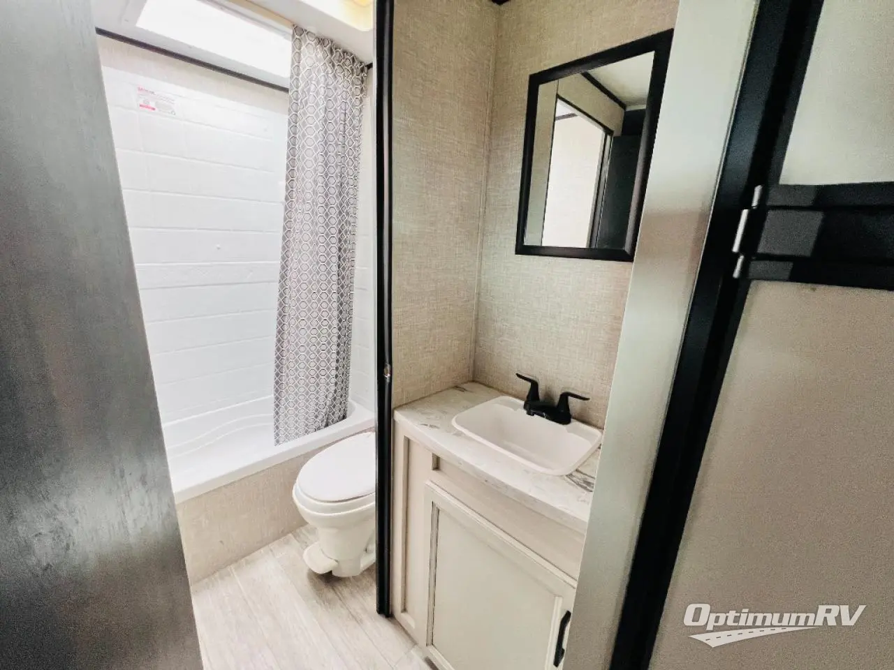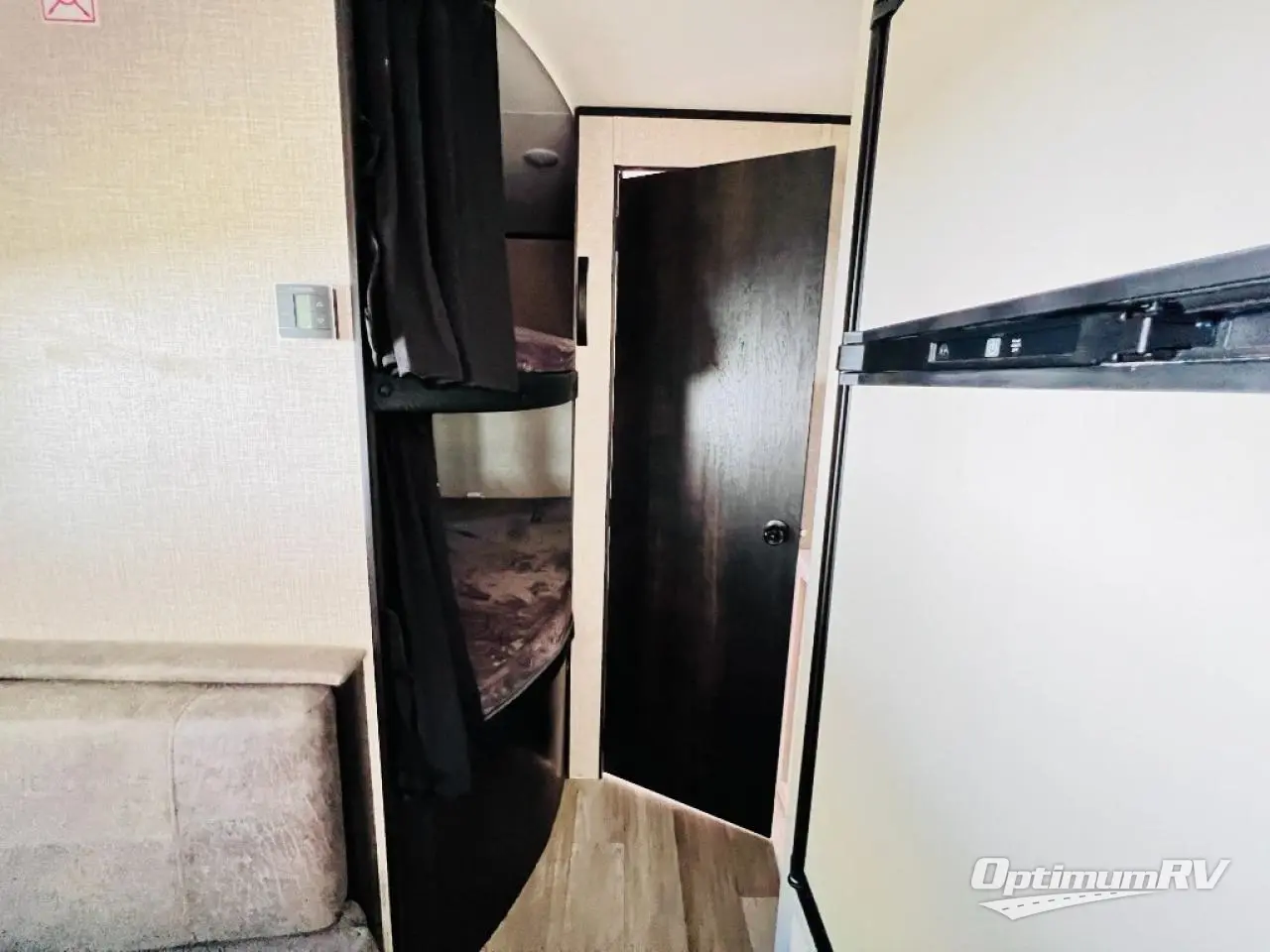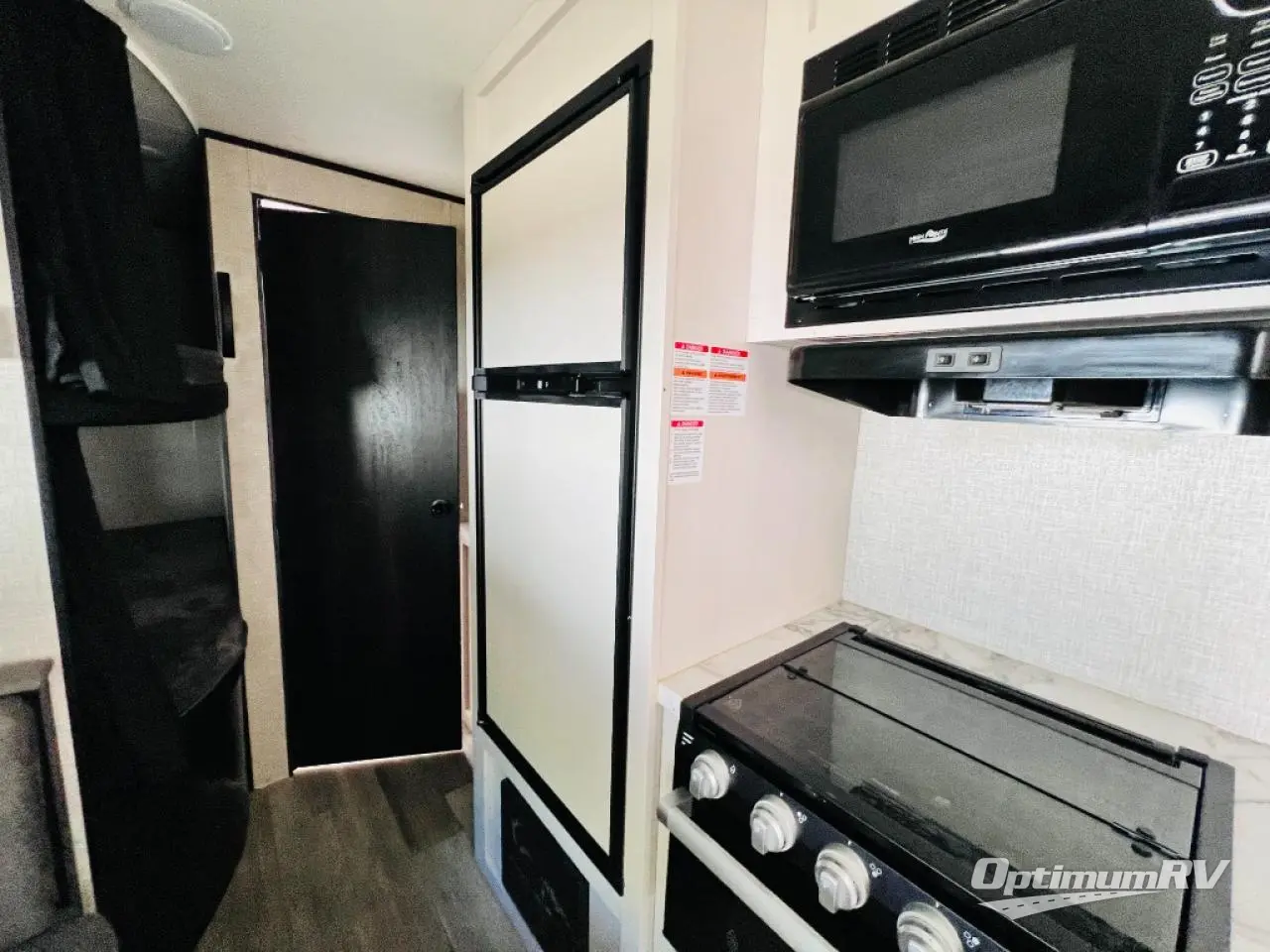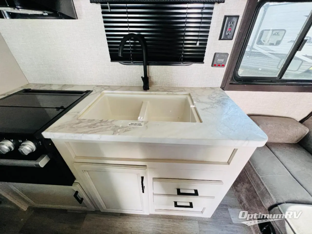 This easy to setup trailer offers a semi-private bedroom up front with a queen bed, semi-private double size bunks in the rear thanks to the curtains, and a private toilet and tub/shower room. The bathroom sink is just outside the door allowing two people to get ready for bed at once. The galley kitchen offers full amenities, and two can dine at the booth dinette and some can relax on the jack-knife sofa. Both furnishings offer extra sleeping space. And you might like to add the Chil N' Stor option which adds a fridge and counter space along the exterior to serve meals outside and store extra beverages.
