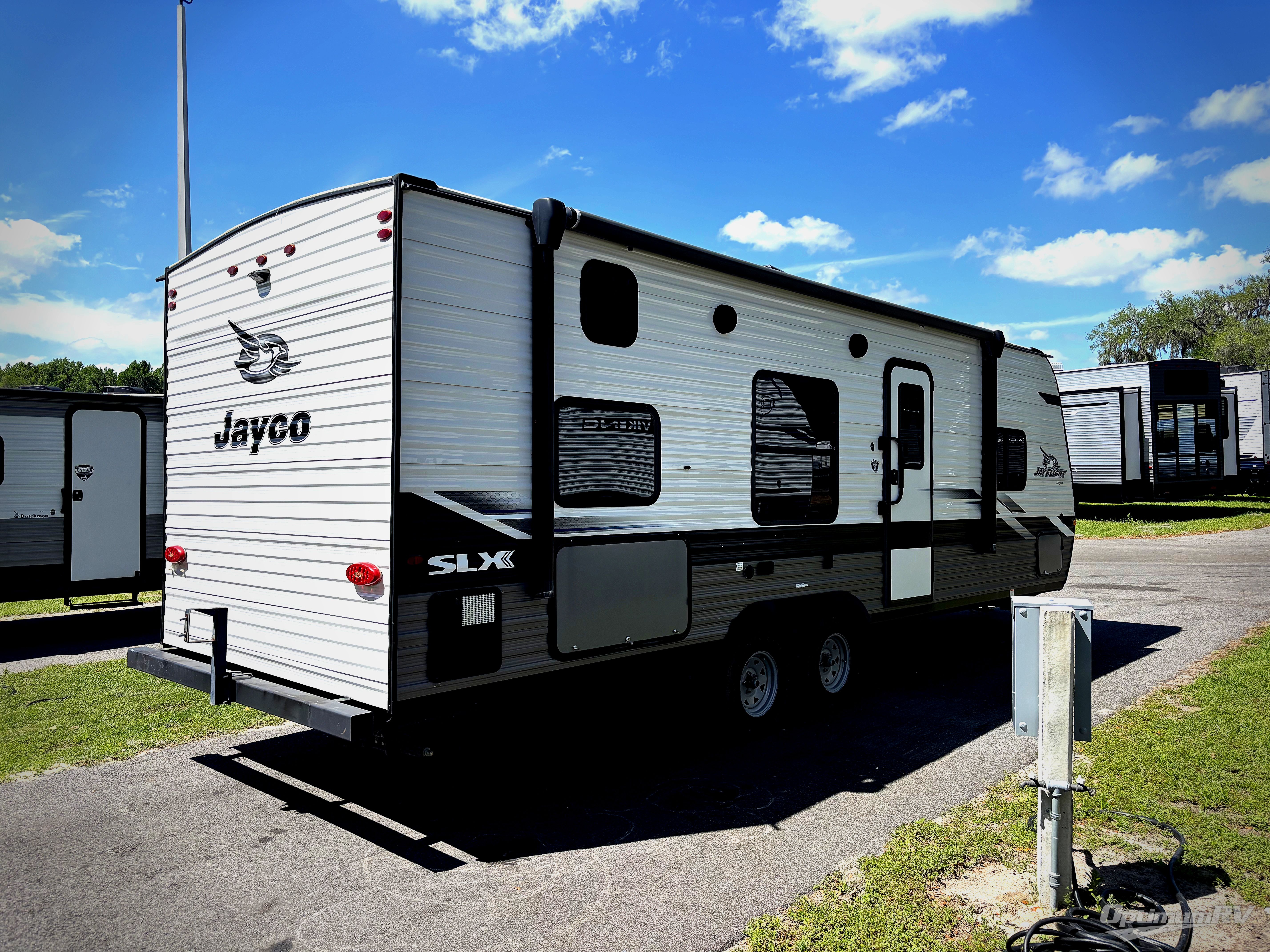 With any Jay Flight SLX 8 travel trailer by Jayco, you will have a durable foundation with l-Class cambered structural steel l-beams, a fully-integrated A-frame, seamless roof material and a Magnum Truss Roof System with plywood decking for a 50% stronger roof than any other in the industry. Also included are Goodyear Endurance tires made in the USA, a front diamond plate to protect against road debris. Inside, you will love the fresh interior design, the solid hardwood cabinet doors, the 81-inch tall ceiling, the energy-saving LED lighting, and the storage. Whether you are looking for an RV for a small or large group, you will find a Jay Flight SLX 8 to fit your camping lifestyle!