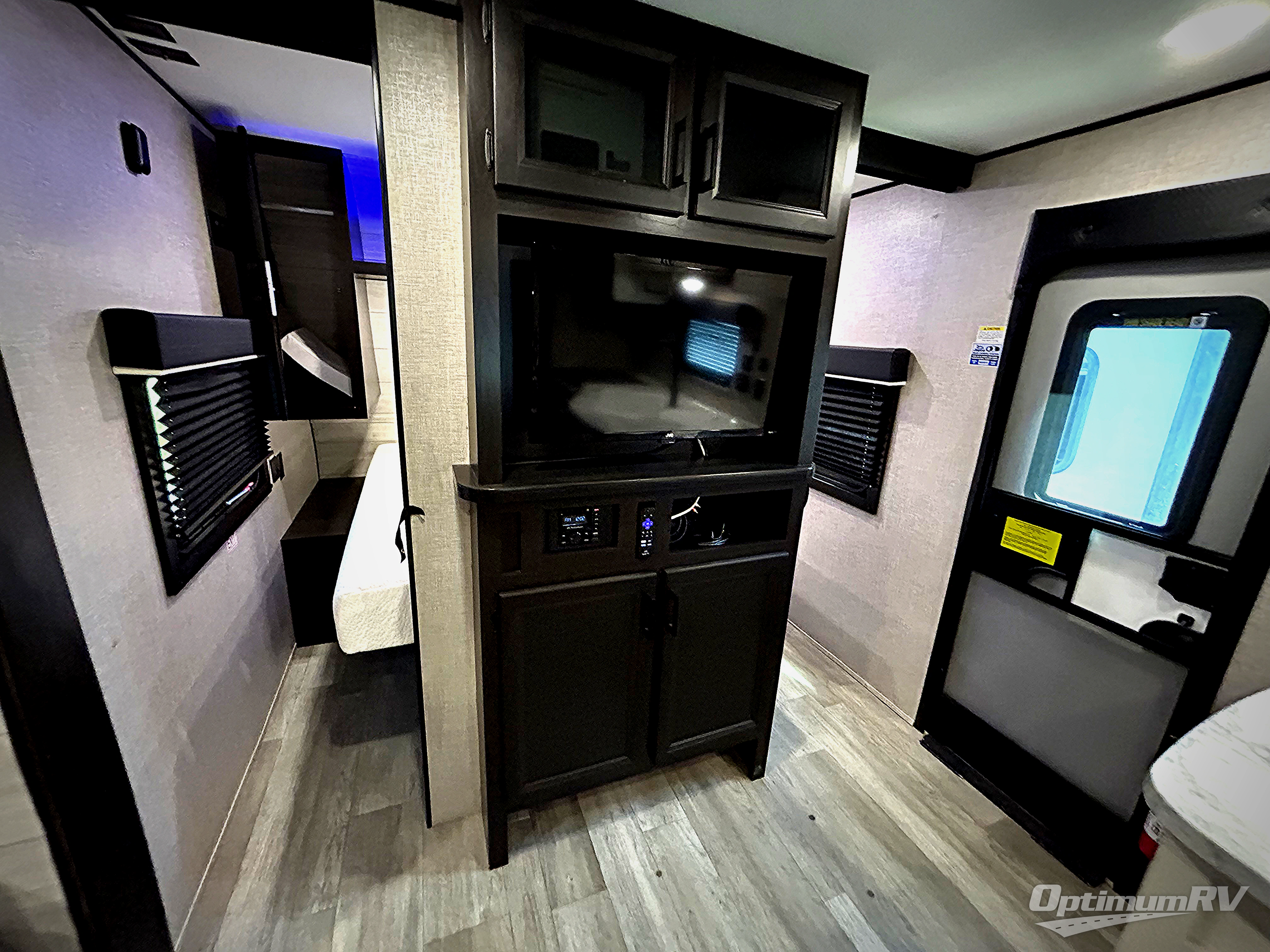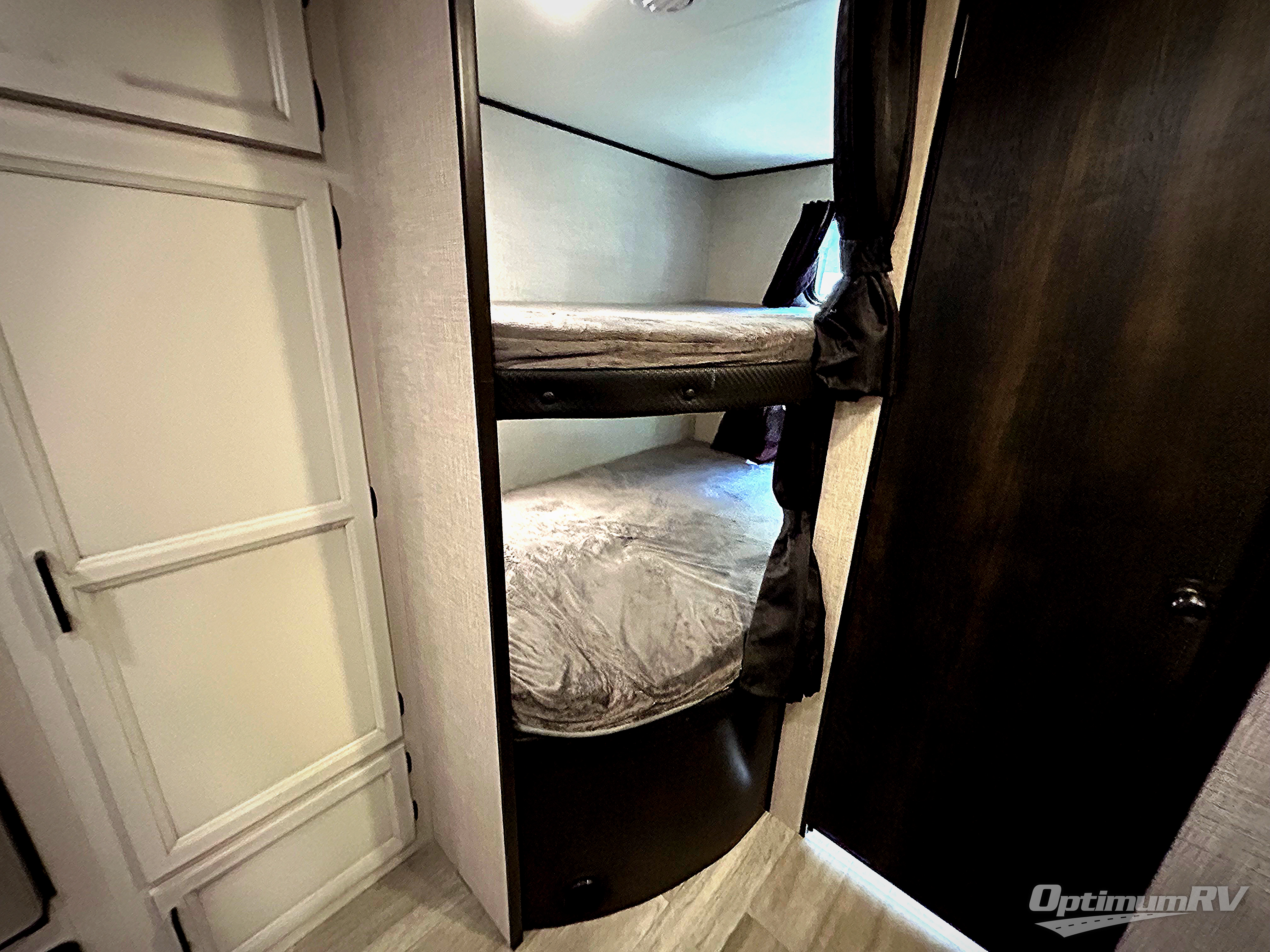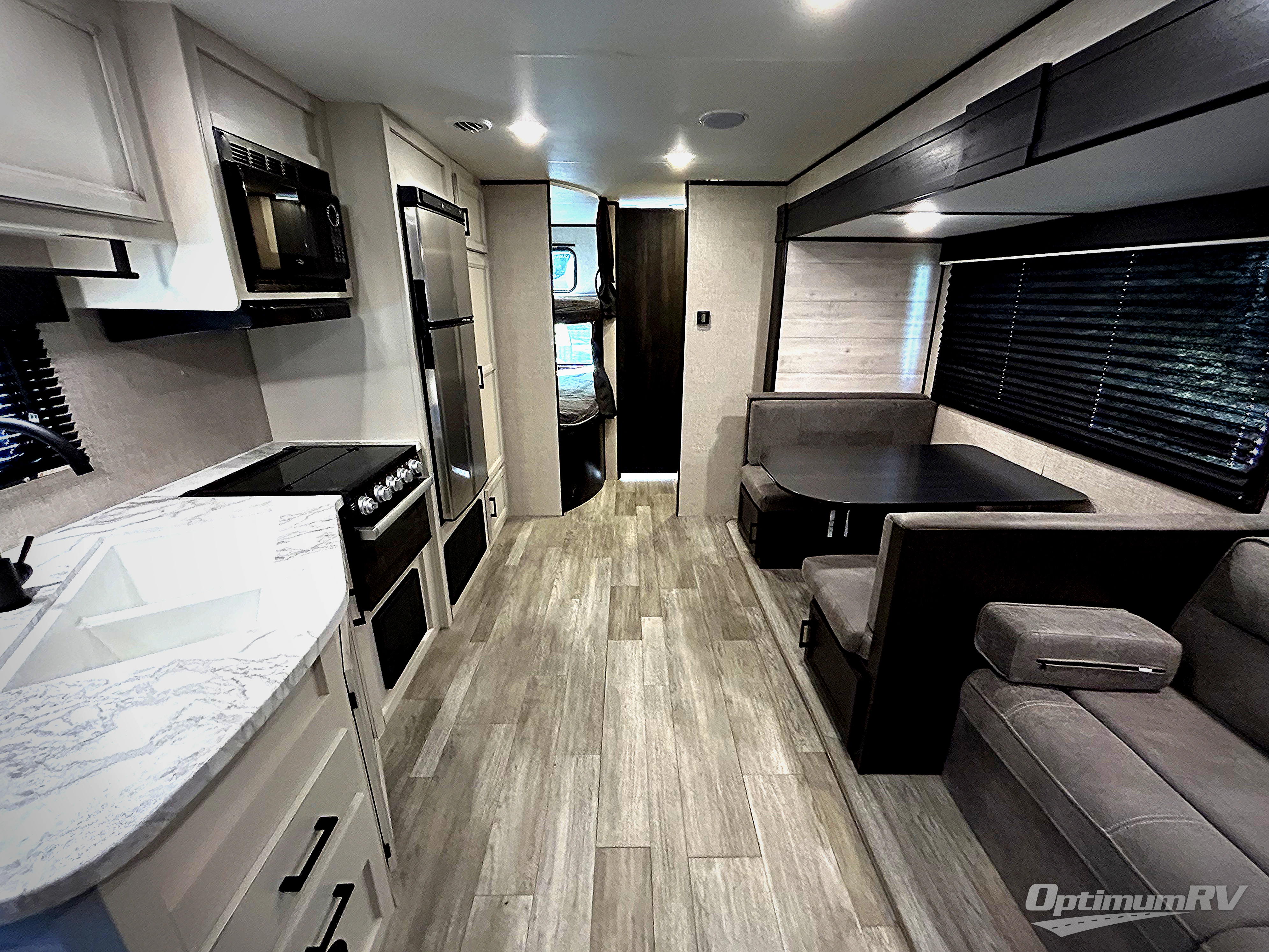 When you want to travel and see new places, this trailer gives you the flexibility to sleep two to four, plus offers a full walk-through bathroom with access from the main area and the front private bedroom. You will also appreciate having a second entry/exit door in the bedroom, a walk-around queen bed, plus dual wardrobes giving you your own side of the bed. The bathroom also has a radius shower and linen storage. The kitchen includes full amenities to make your own meals, and a pantry to keep your dry goods and snacks. You will love the rear swivel rockers with table in between to place your drinks, and the jack-knife sofa plus booth dinette offer more seating, sleeping space, and extra floor space since they are within a slide.