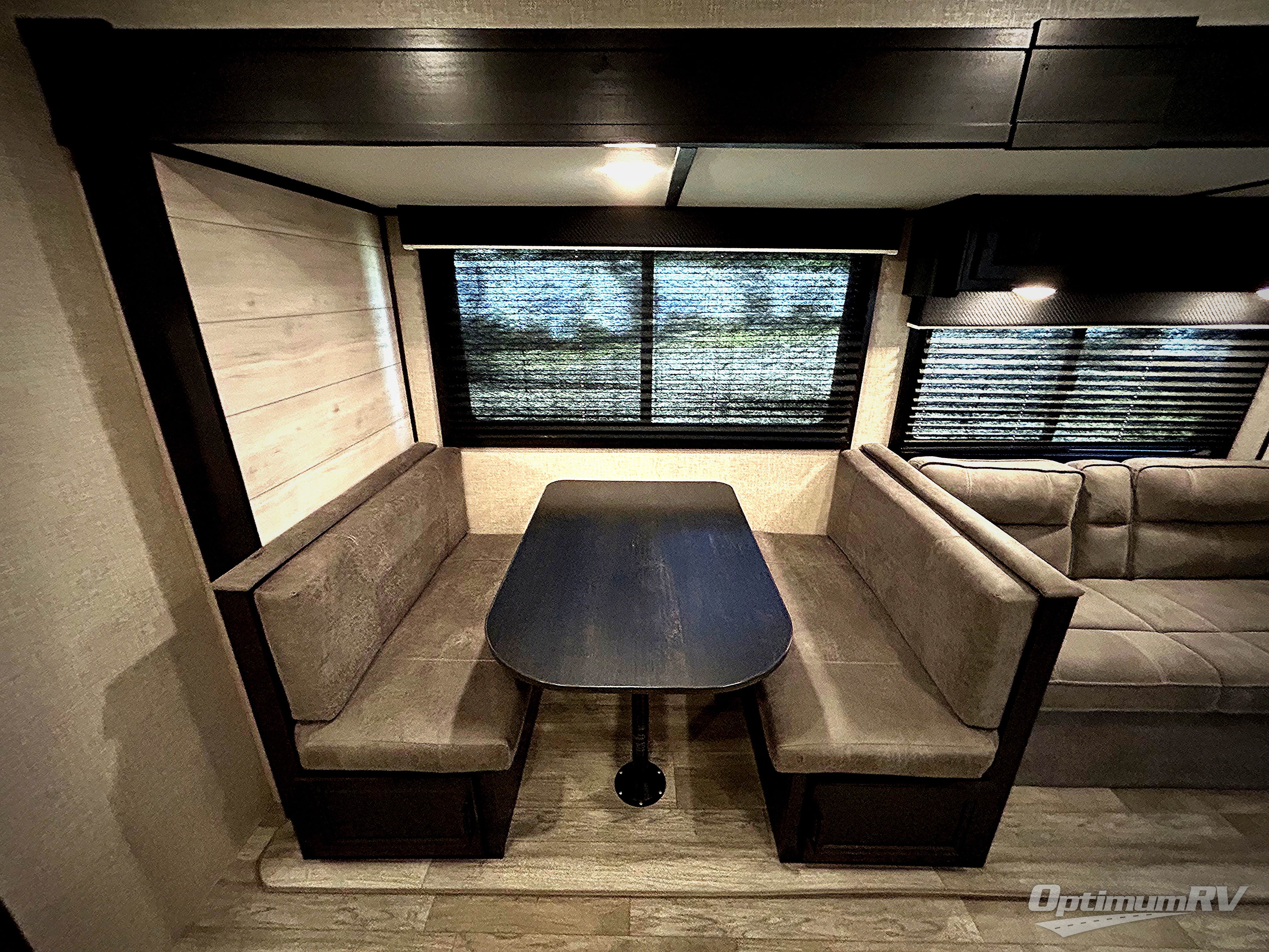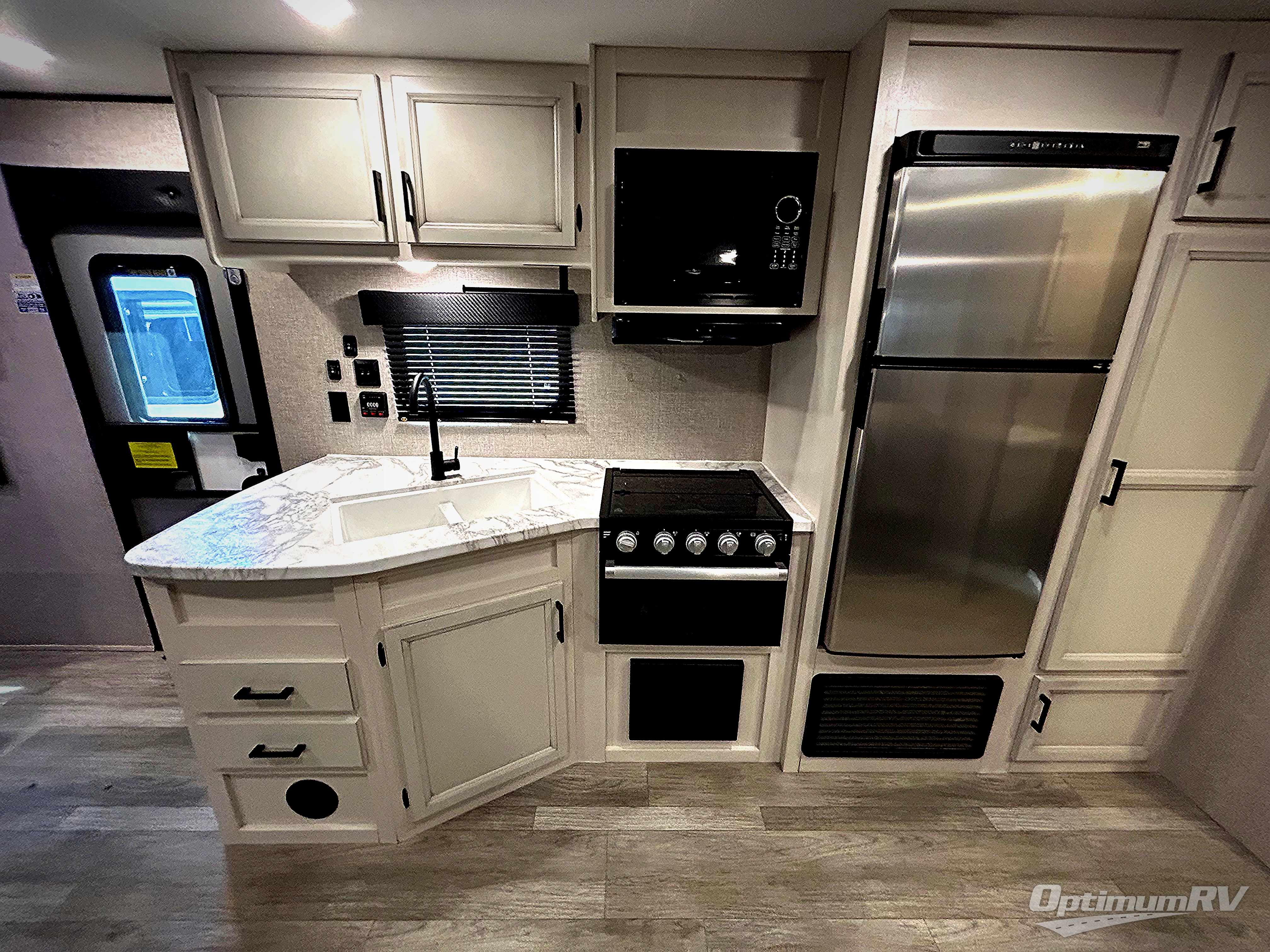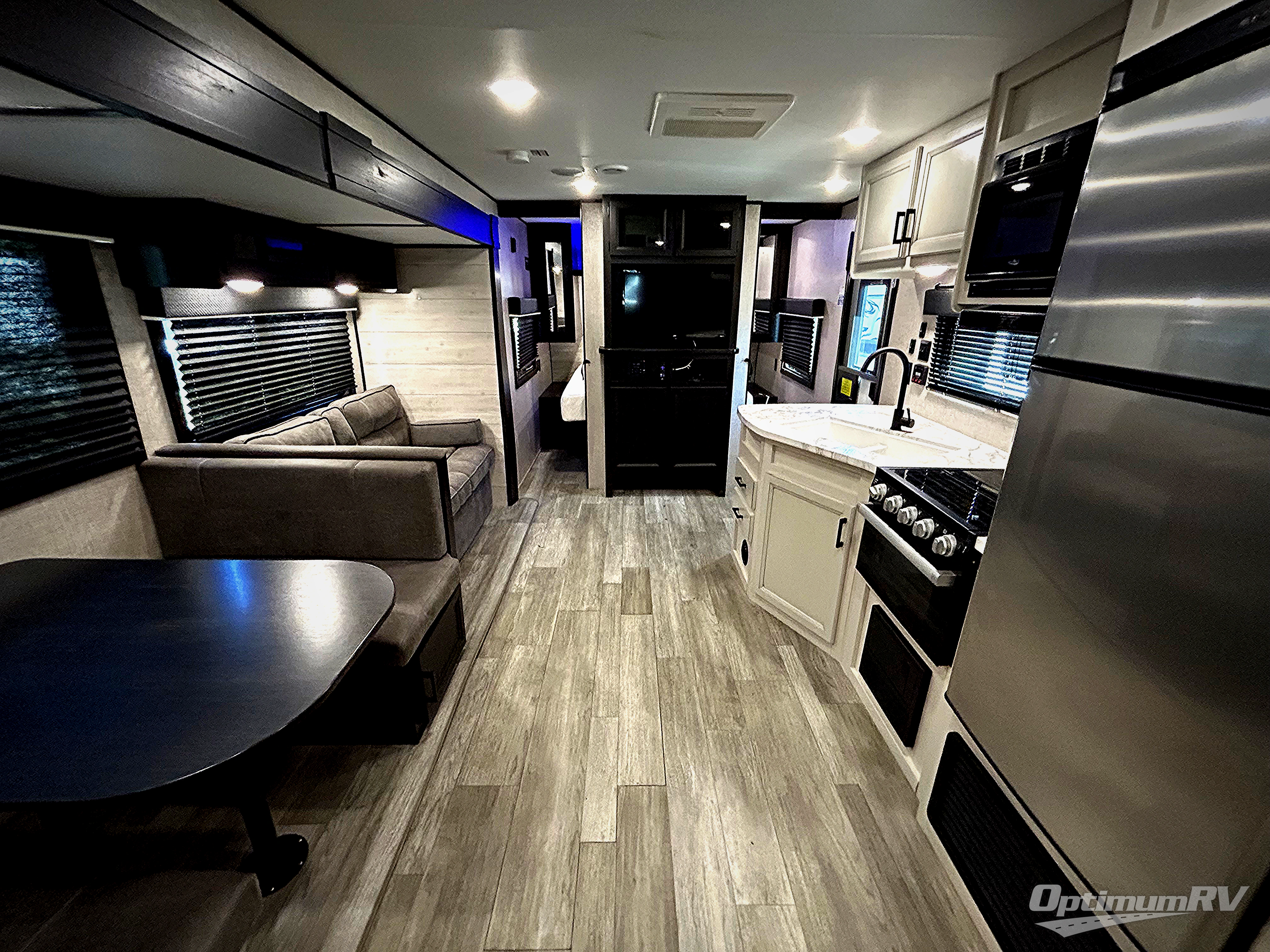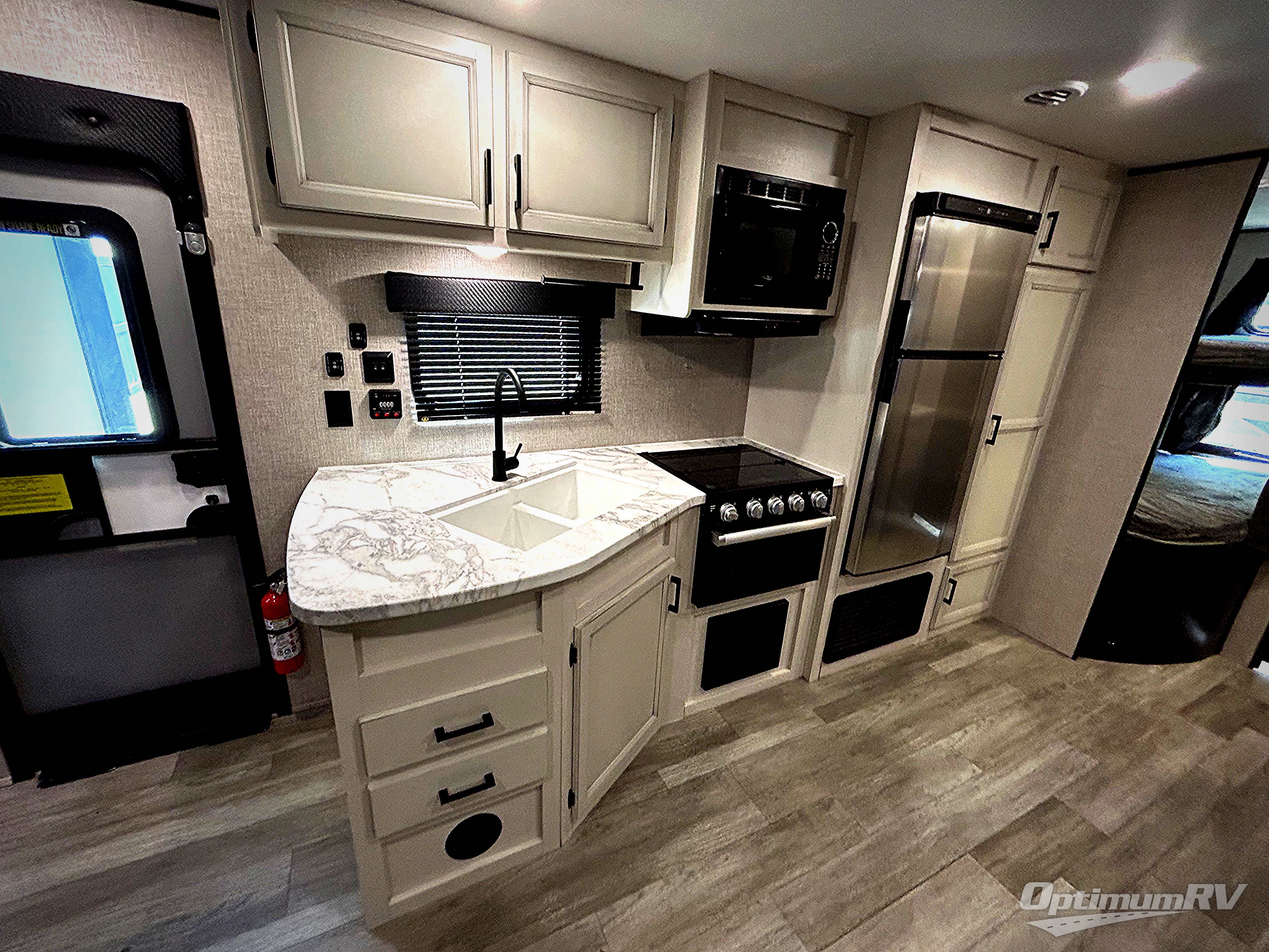 When you want to travel and see new places, this trailer gives you the flexibility to sleep two to four, plus offers a full walk-through bathroom with access from the main area and the front private bedroom. You will also appreciate having a second entry/exit door in the bedroom, a walk-around queen bed, plus dual wardrobes giving you your own side of the bed. The bathroom also has a radius shower and linen storage. The kitchen includes full amenities to make your own meals, and a pantry to keep your dry goods and snacks. You will love the rear swivel rockers with table in between to place your drinks, and the jack-knife sofa plus booth dinette offer more seating, sleeping space, and extra floor space since they are within a slide.