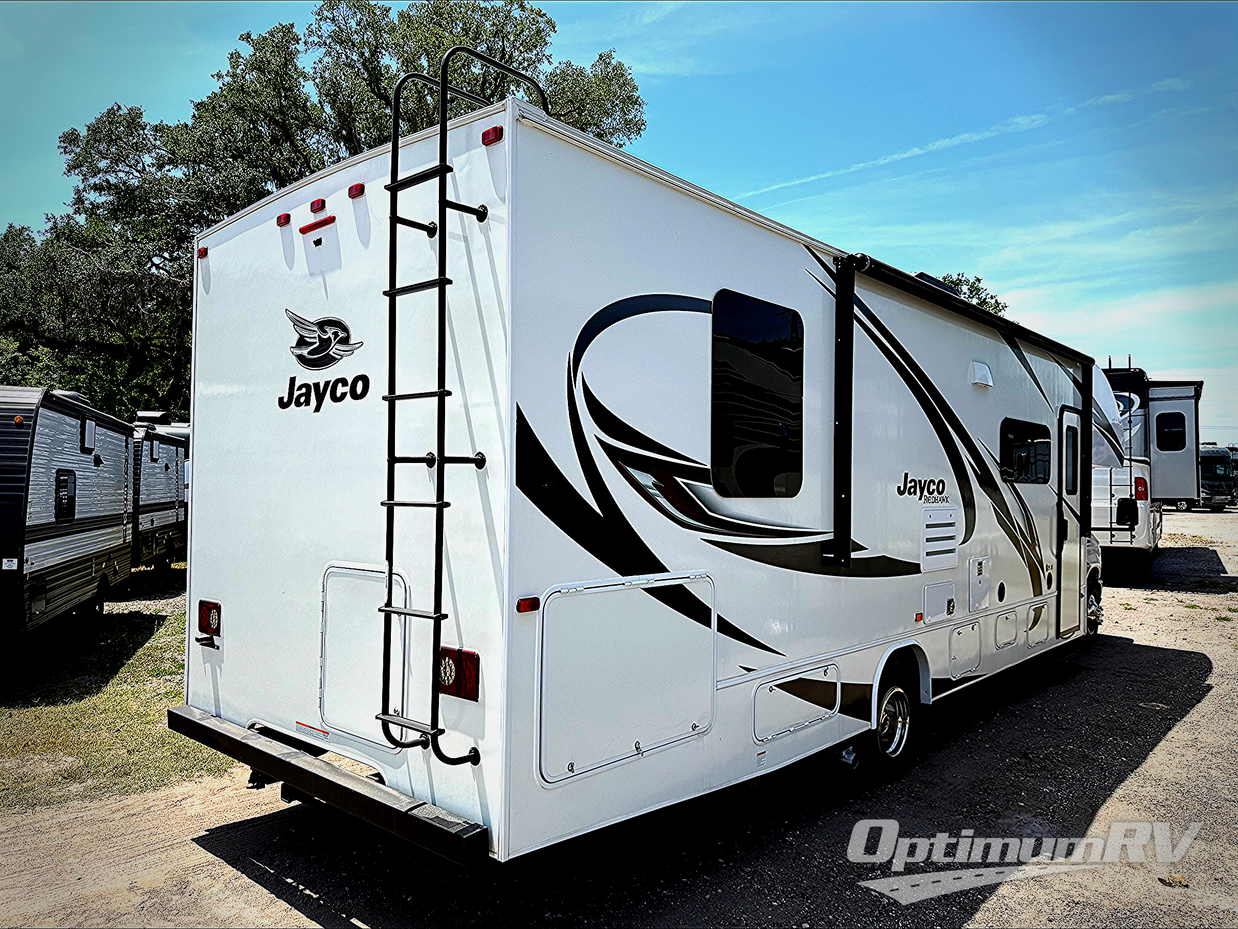 With any Jayco Redhawk Class C gas motorhome, the JRIDE® system features a computer-balanced driveshaft to ensure a smooth and efficient power transfer to the wheels, standard front and rear stabilizer bars, Hellwig helper springs to help improve stability under heavy loads, and rubber isolation body mounts to absorb road shock, dampen noise and minimize vibrations. The cab offers a Sony® infotainment center with Apple CarPlay and Android Auto, backup and side-view cameras for safety and easier parking, and a tire pressure monitoring system. inside you will love the headroom with a 7-foot ceiling height, the LED-lit pressed countertops and decorative kitchen backsplash, plus the stainless steel bathroom sink when it is time to clean up. Looking for value, technology and comfort, choose your favorite Redhawk today!