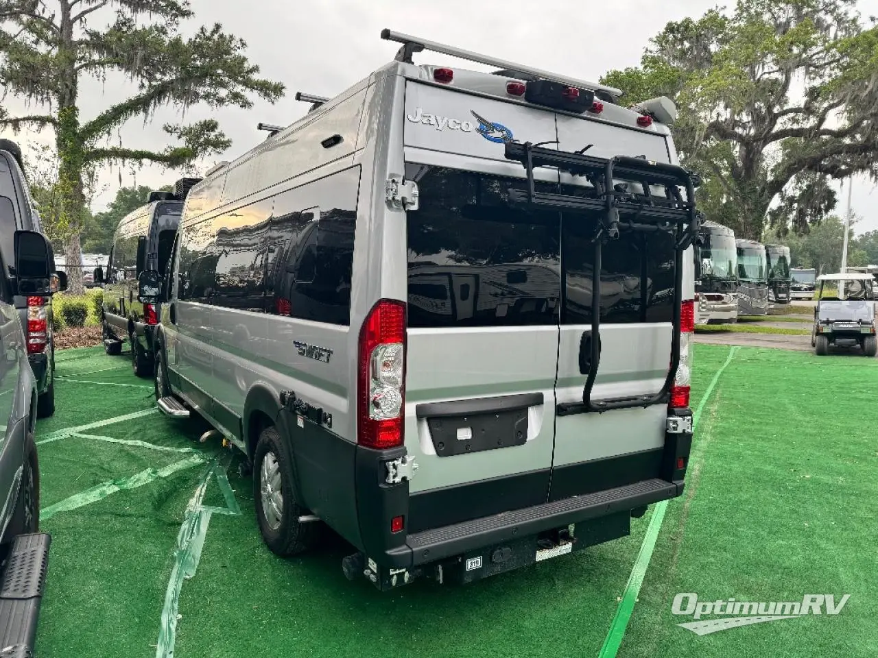 The Swift Class B gas motorhome by Jayco starts with a RAM ProMaster 3500 window van chassis with a 3.6L V6 VVT engine to power your adventures near and far. Off-grid camping is made hassle-free with the 190-watt roof-mounted GoPower solar panel, plus there is a Thule bike rack and three Thule roof racks for all your gear. Each model includes the JRide system with Hellwig helper springs and a heavy-duty rear stabilizer bar for smooth handling, and the Thule armless patio awning with LED lights will create an outdoor living space you are sure to love. Head inside to find a solid surface kitchen countertop with a pull-out extension, four sliding vented windows, a soft-touch vinyl ceiling, plus many more comforts.