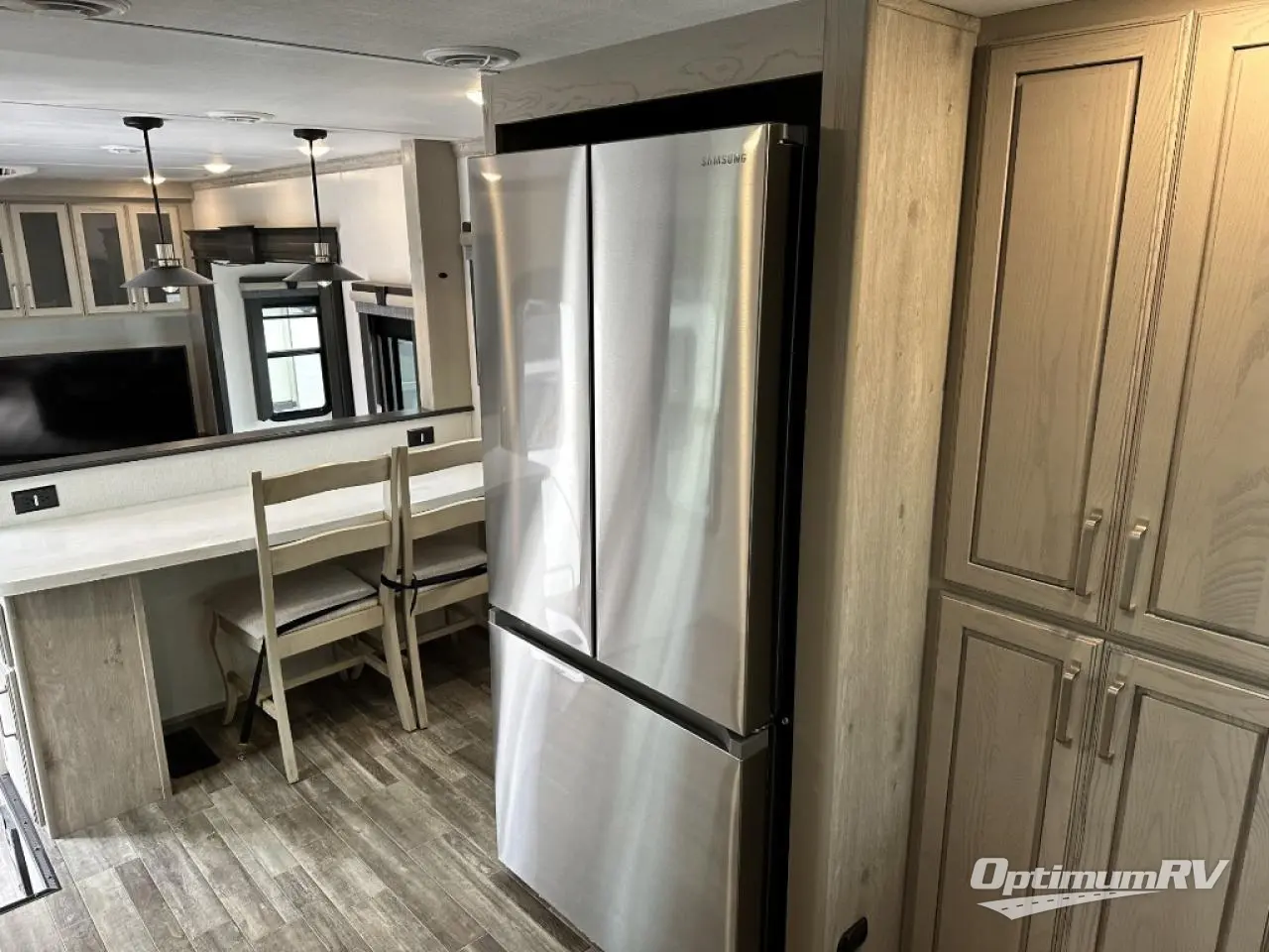 The chef of your group will love cooking in the front kitchen of this fifth wheel! The kitchen not only has extra countertop space to prepare your meals, a convection microwave, and 18 cu. ft. gas/electric refrigerator, but also a bar top with two bar stools overlooking the middle living area. Inside the living area is opposing tri-fold sofa sleeper slides that can be converted for extra sleeping spaces and Thomas Payne theater seating with heat, massage, LED lights, and a USB charging station across from an entertainment center with a 40" fireplace and 50" TV. The master suite has a king bed slide that has storage underneath and a chest with wardrobes on either side, plus access to the full rear bathroom which has a walk-in shower, a dual sink vanity for two to get ready at once, and an area prepped to add an optional washer and dryer!