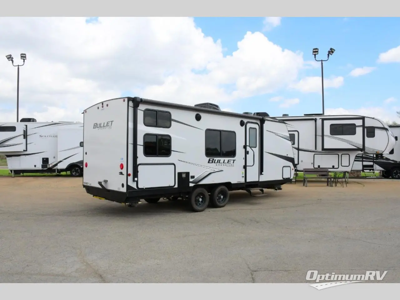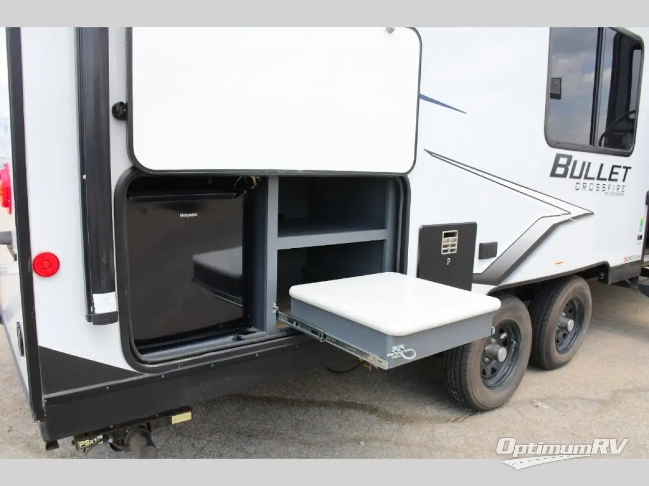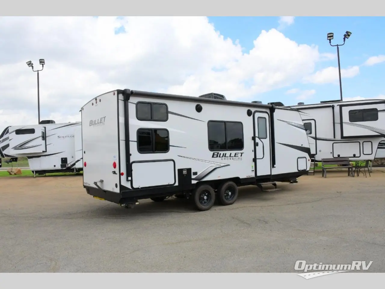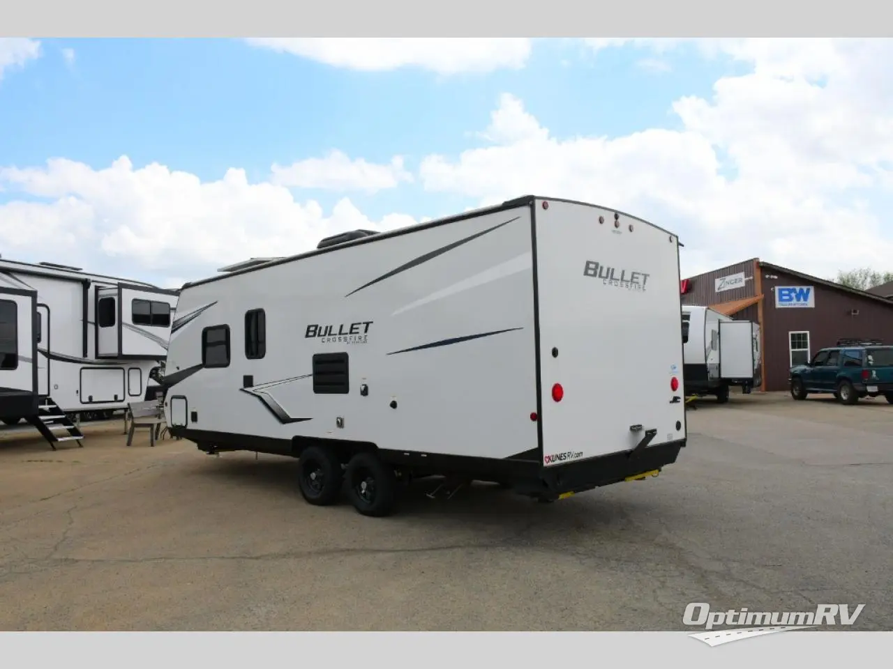 Each Bullet Crossfire Double Axle travel trailer by Keystone is constructed with a NORCO HSLA steel/automotive deposition coated frame assembled with huck bolts for durability. The TORFLEX rubber torsion suspension will provide smooth towing, and the one-piece ABS enclosed underbelly will help extend your camping season. Setting up your trailer will be a breeze with the electric tongue jack and four electric stabilizer jacks, and there is an electric awning with adjustable arms and LED lighting for an inviting outdoor living space. The affordable, high-quality RV solar energy system, SolarFlex 200 comes standard with each model and will allow you to go off-grid when you want, or you can choose the optional SolarFlex 400i for even more off-grid capabilities. Inside, you'll find fabric night shades, Beauflor woven flooring in the slides, full depth cabinets with full extension drawer guides, and many more comforts.
