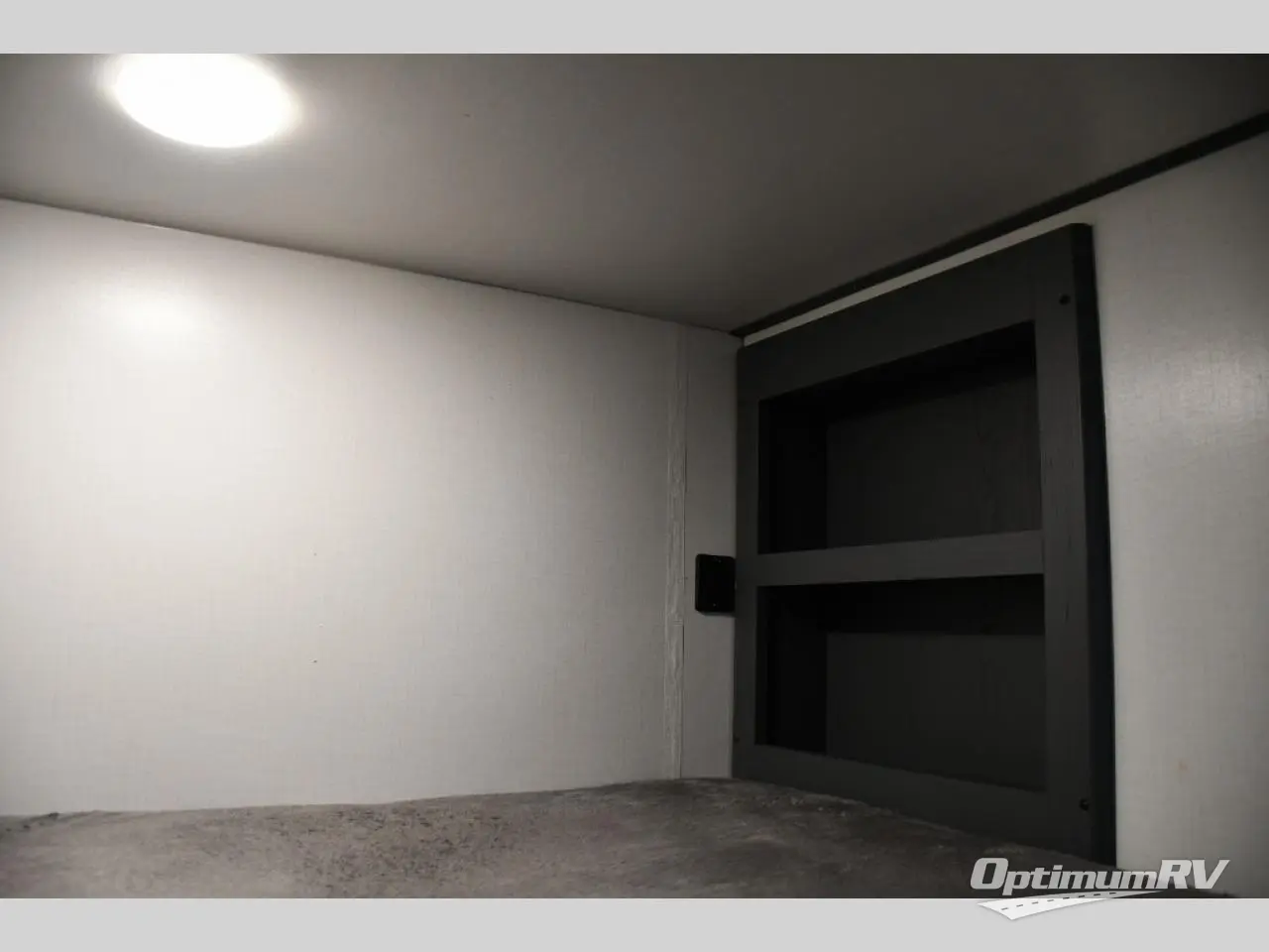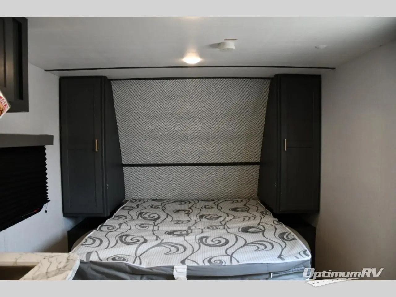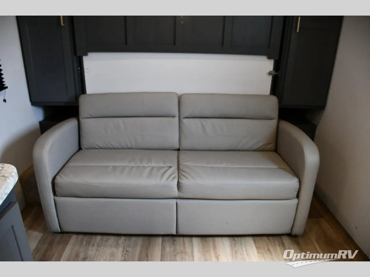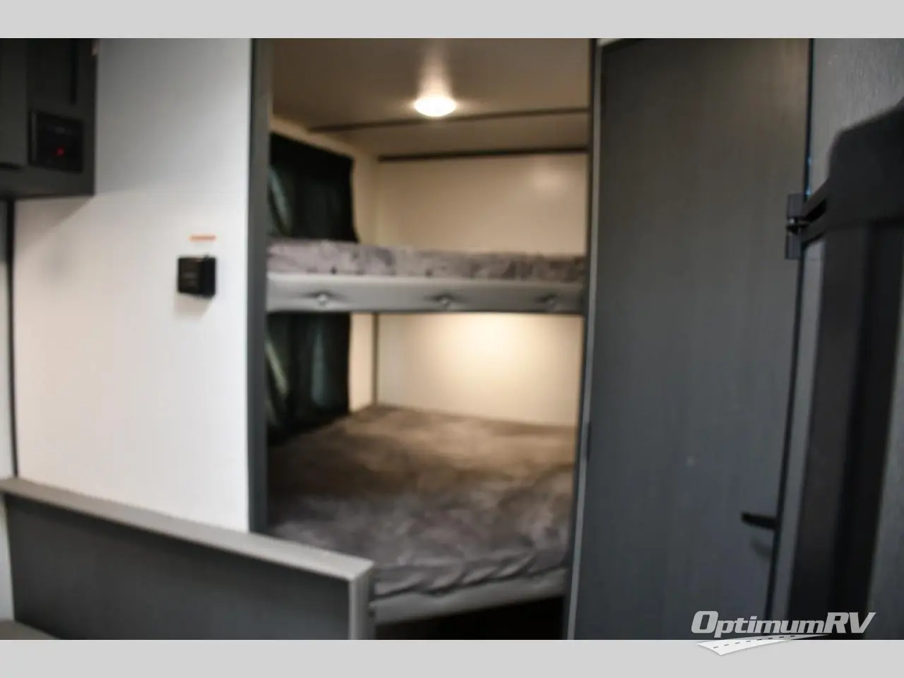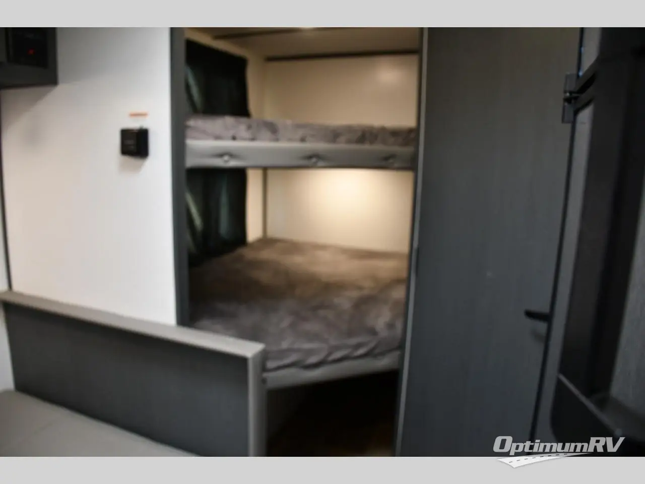 Added sleeping space and a versatile Murphy bed are a dream come true in this cozy travel trailer. The double-size bunks include a flip-up bunk for added storage, and the front Murphy bed can be folded away in the morning so you can relax on the sofa. There is also a Do-More dinette table where you can dine, play games, and sleep more guests. This model includes a full bath to clean up in each day, and there is a pantry just outside the bath for clean towels and necessities or for snacks. And check out the exterior with its 15' power awning with LED lights, pass-through storage, and outdoor kitchen with a pull-out griddle and refrigerator.