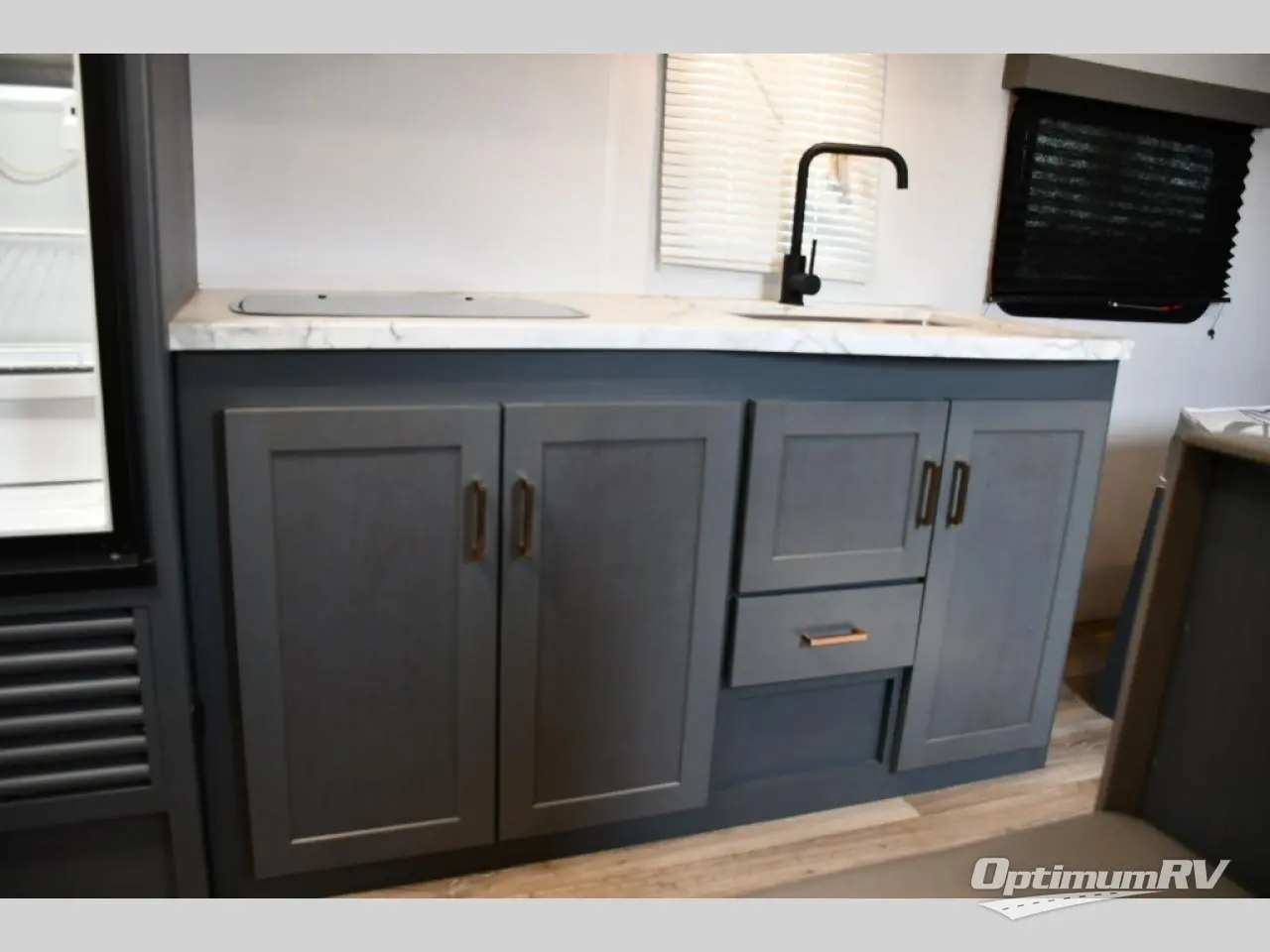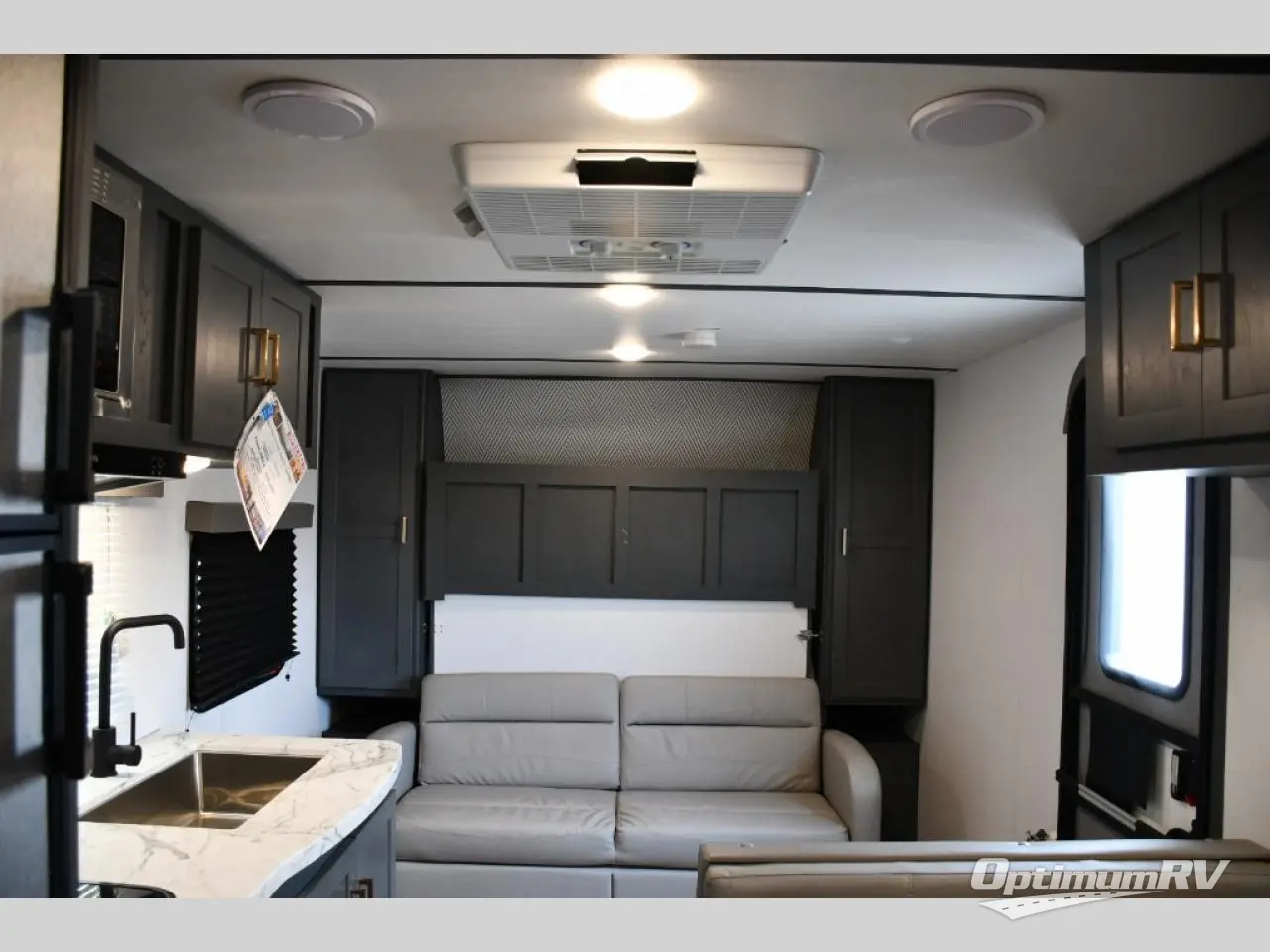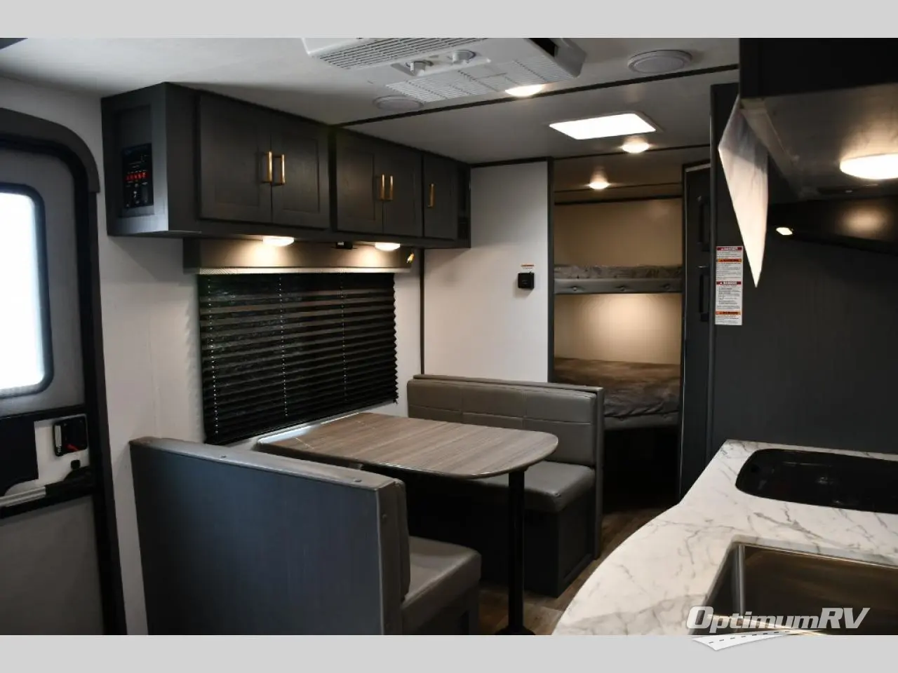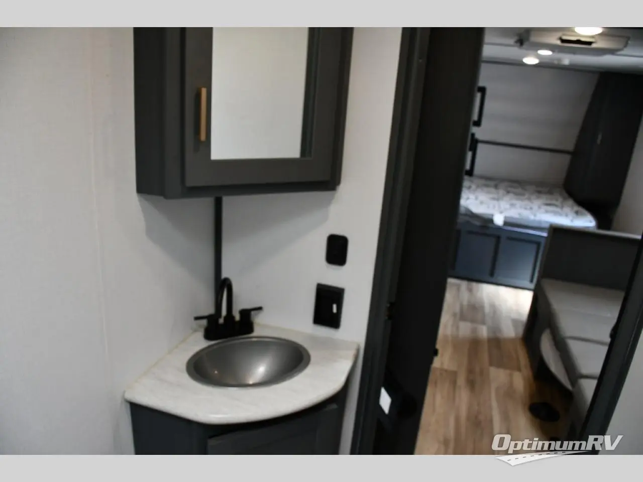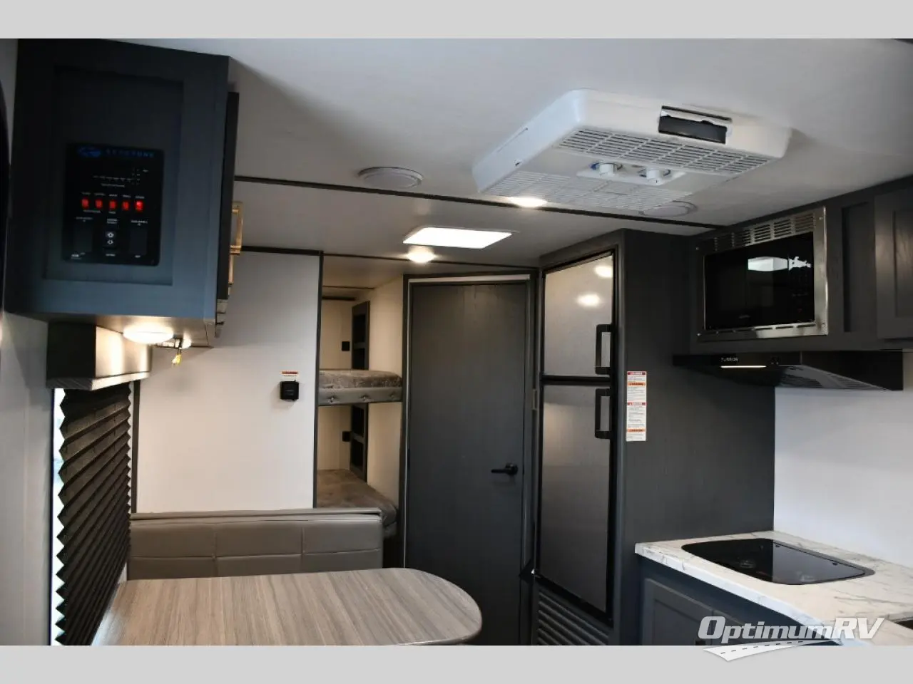 Added sleeping space and a versatile Murphy bed are a dream come true in this cozy travel trailer. The double-size bunks include a flip-up bunk for added storage, and the front Murphy bed can be folded away in the morning so you can relax on the sofa. There is also a Do-More dinette table where you can dine, play games, and sleep more guests. This model includes a full bath to clean up in each day, and there is a pantry just outside the bath for clean towels and necessities or for snacks. And check out the exterior with its 15' power awning with LED lights, pass-through storage, and outdoor kitchen with a pull-out griddle and refrigerator.
