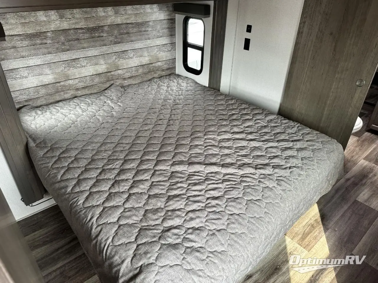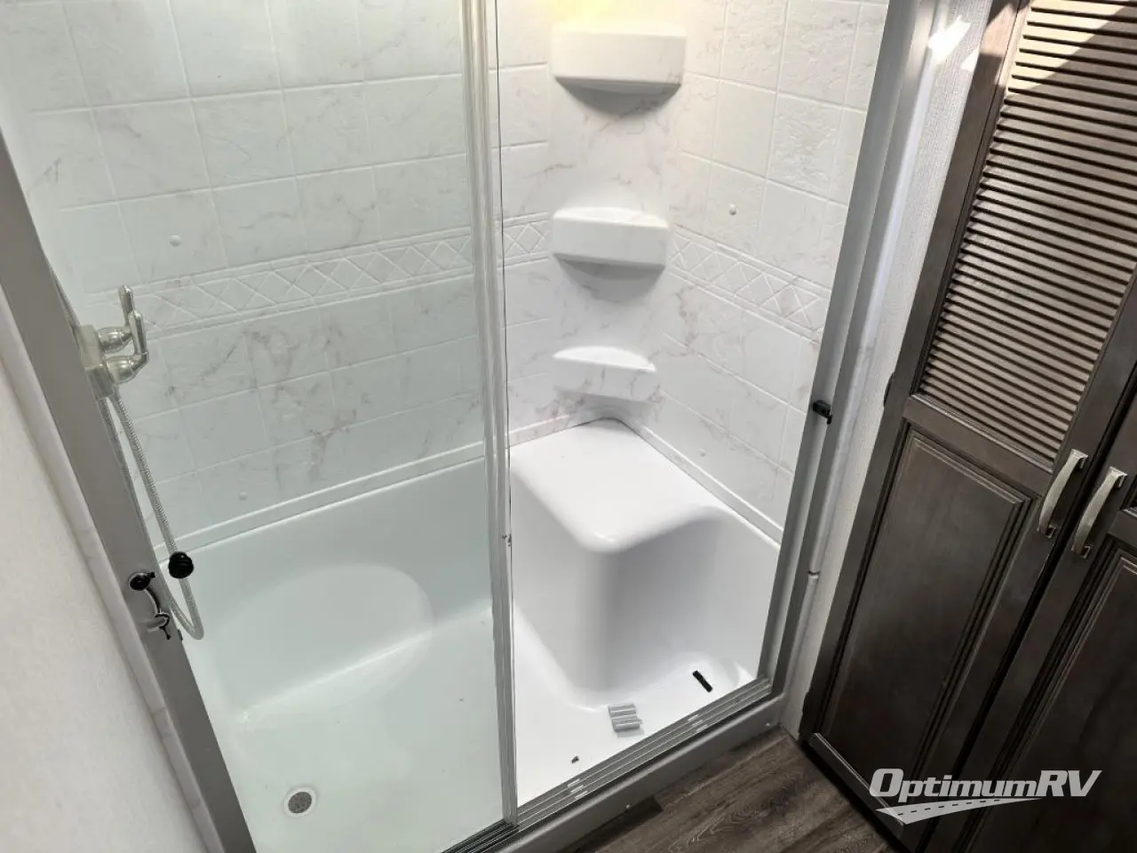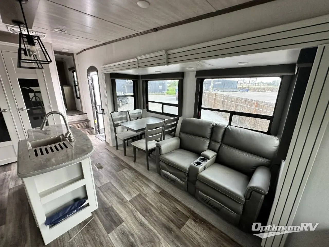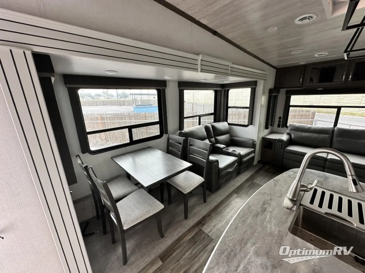 You will be so excited to take this Cougar fifth wheel out for the first time! Because of its secluded and fully stocked master suite at the front, this unit is perfect for a couple who want to see the country or visit family. The master bathroom has a wonderful walk-in closet that has shoe storage and preparations for a washer/dryer. There is also under-bed storage in the bedroom portion, and the queen bed slide gives you a little more space to get to the dresser and linen closet. The half bathroom is located out in the main living area so that your friends will have a place to go when they visit. Opposing slides keep this living area open for lounging comfortably on the tri-fold sleeper sofa and theater seating, and you can get everyone together for a board game at the booth dinette.