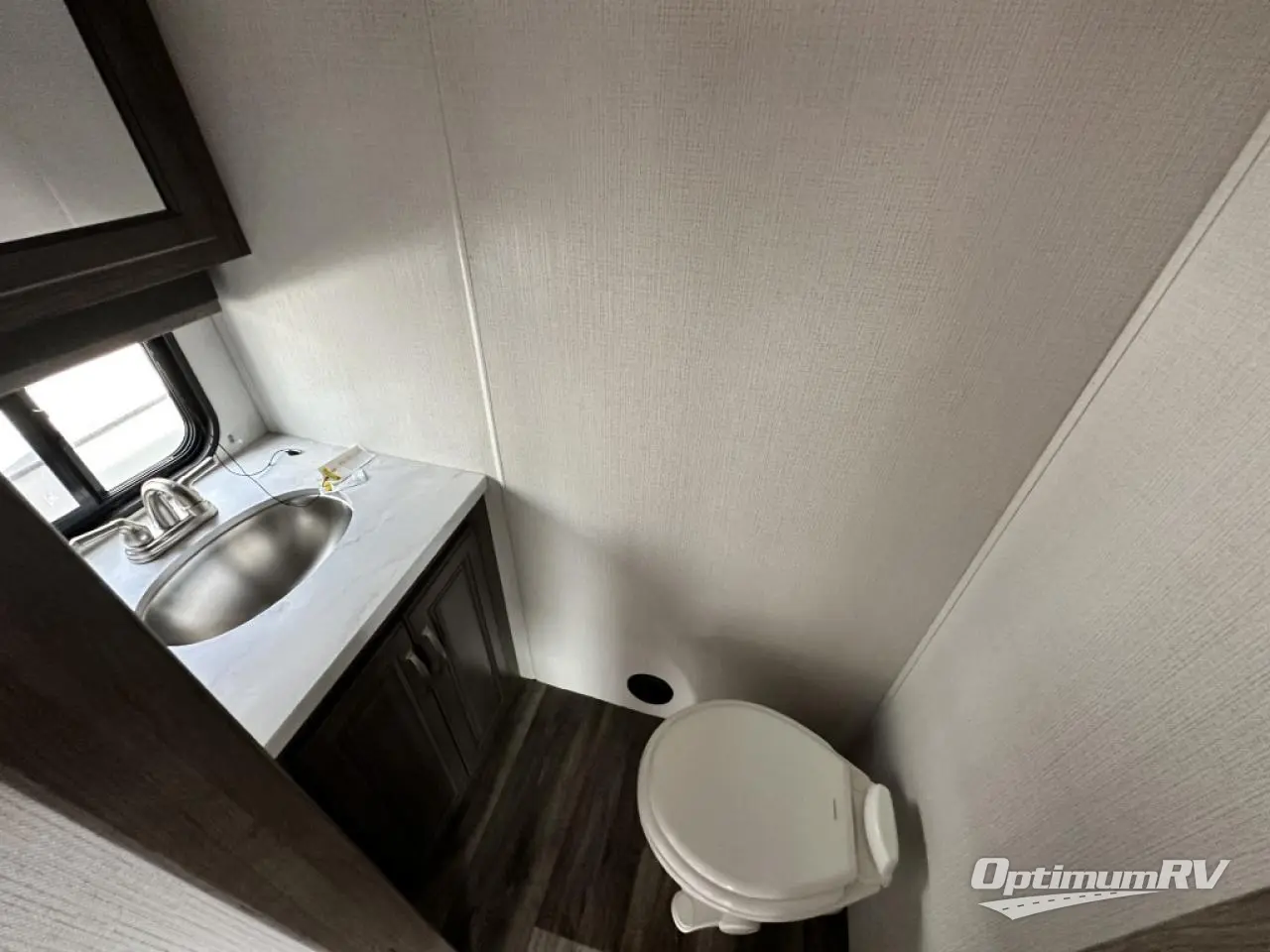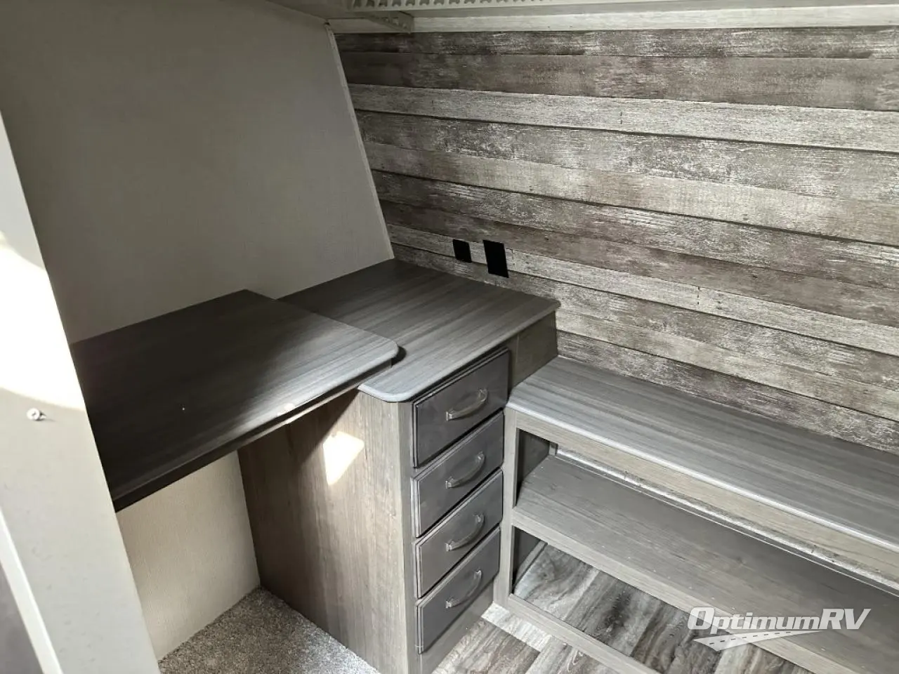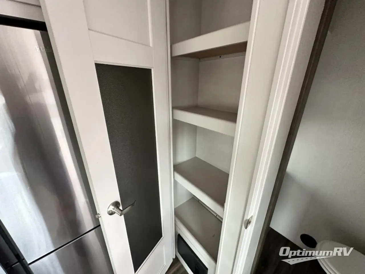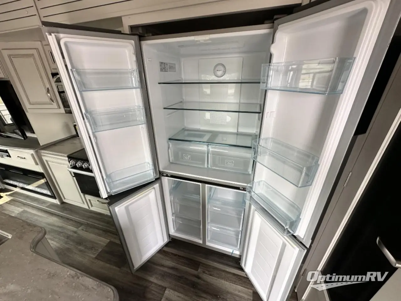 You will be so excited to take this Cougar fifth wheel out for the first time! Because of its secluded and fully stocked master suite at the front, this unit is perfect for a couple who want to see the country or visit family. The master bathroom has a wonderful walk-in closet that has shoe storage and preparations for a washer/dryer. There is also under-bed storage in the bedroom portion, and the queen bed slide gives you a little more space to get to the dresser and linen closet. The half bathroom is located out in the main living area so that your friends will have a place to go when they visit. Opposing slides keep this living area open for lounging comfortably on the tri-fold sleeper sofa and theater seating, and you can get everyone together for a board game at the booth dinette.