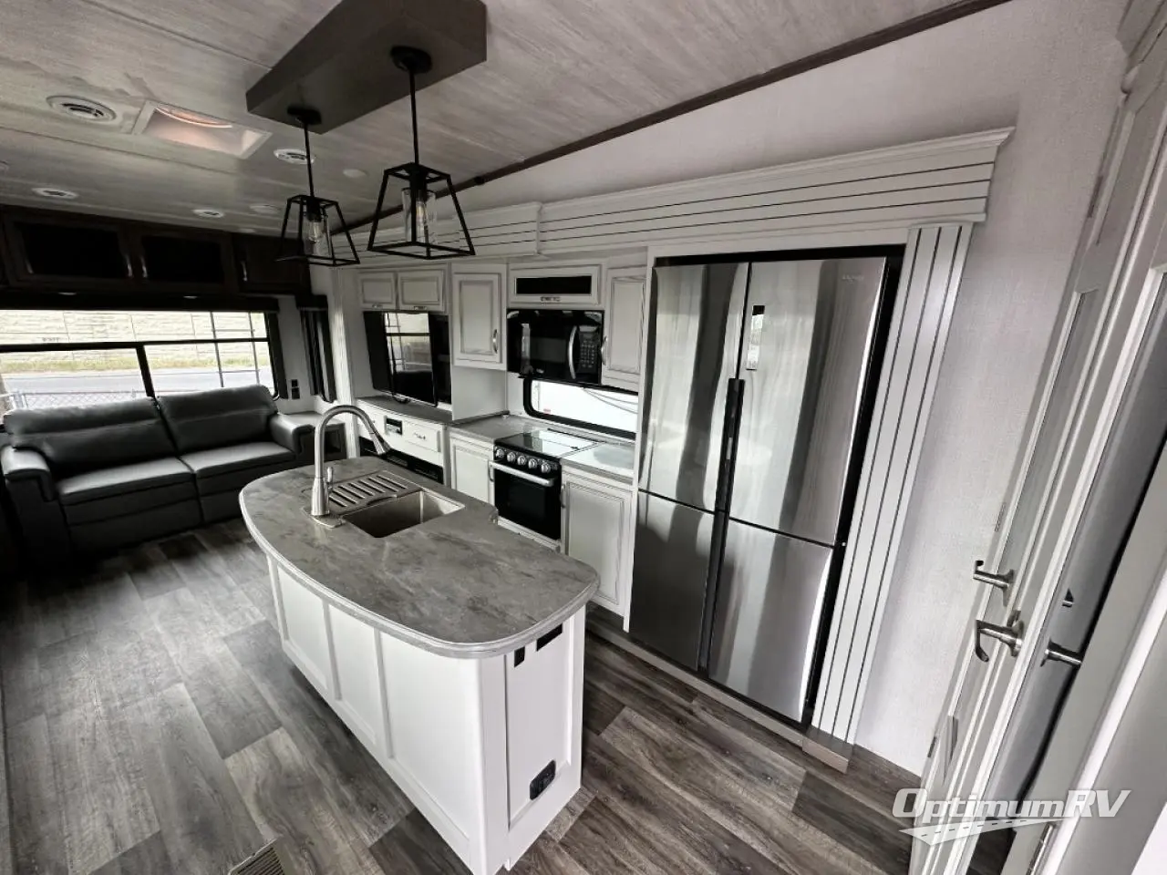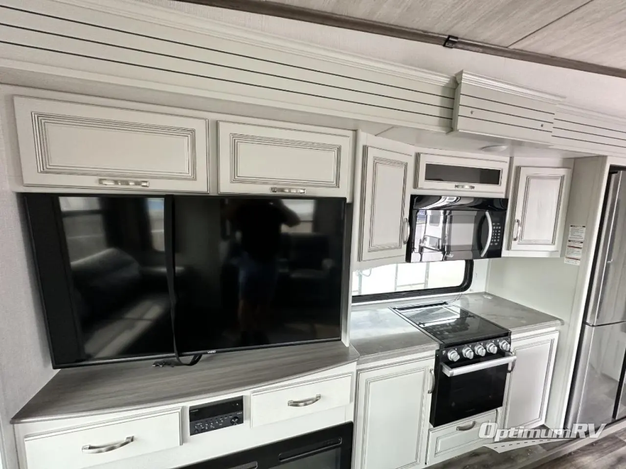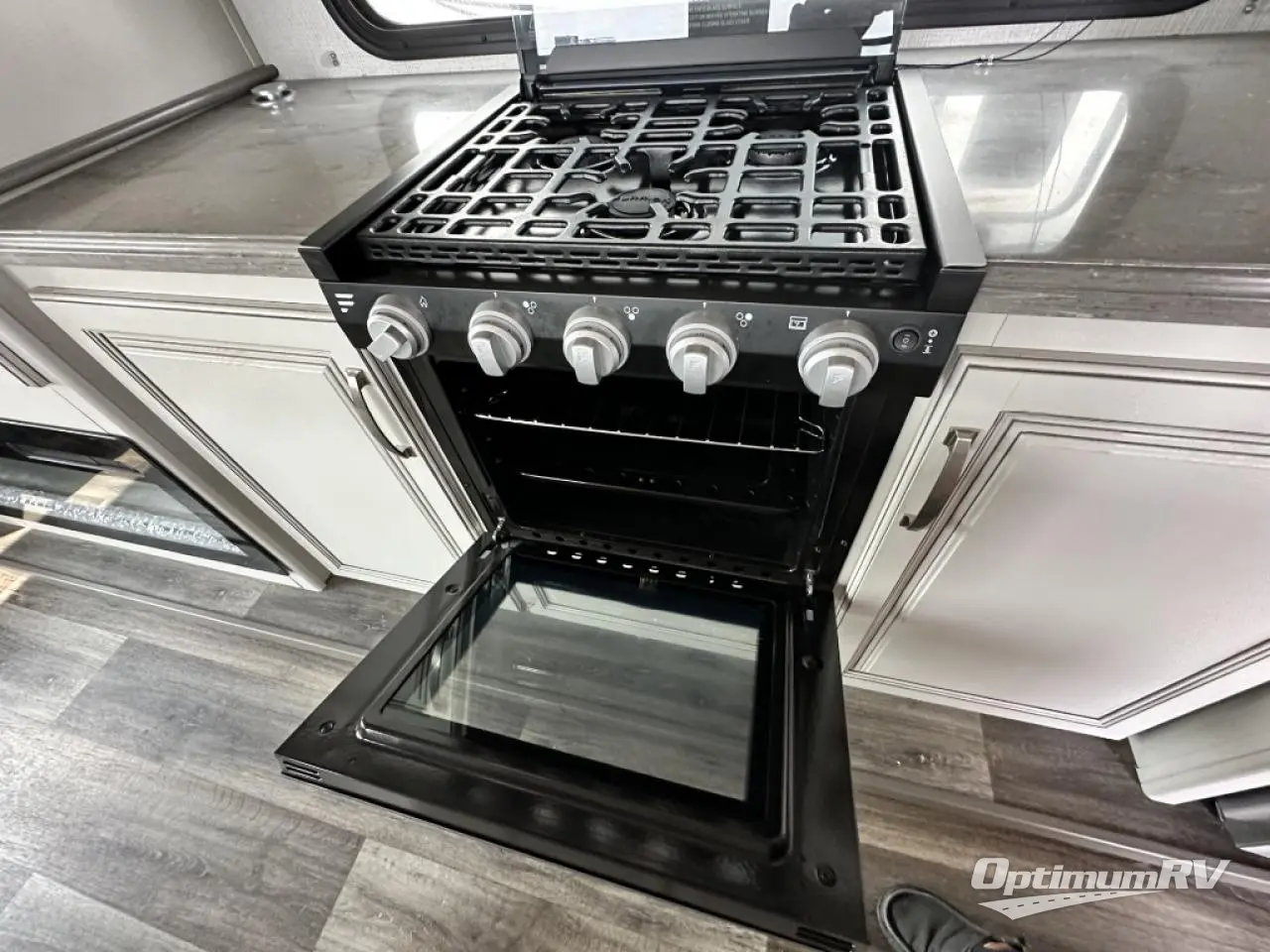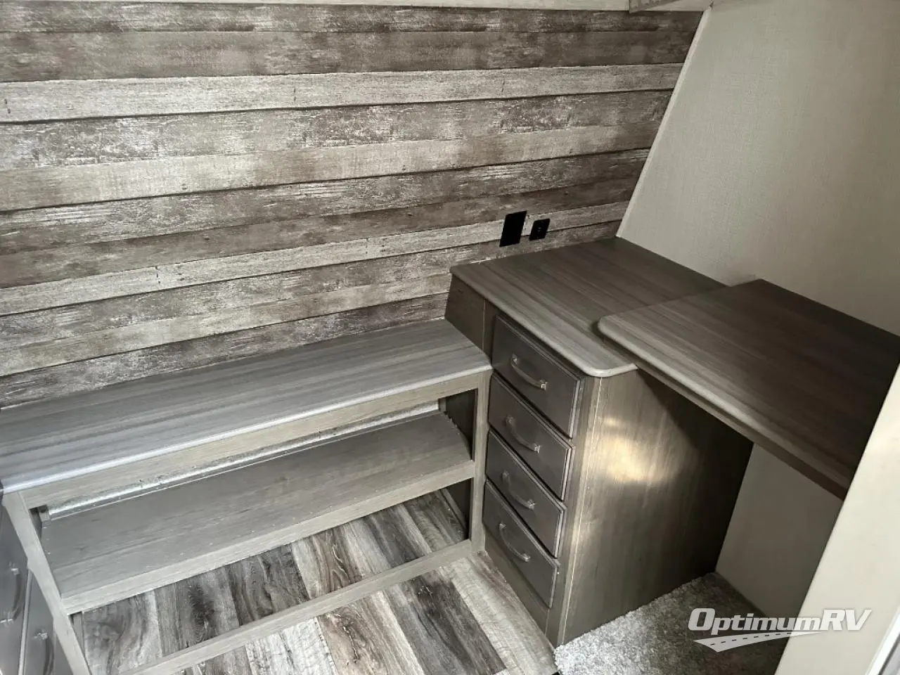You will be so excited to take this Cougar fifth wheel out for the first time! Because of its secluded and fully stocked master suite at the front, this unit is perfect for a couple who want to see the country or visit family. The master bathroom has a wonderful walk-in closet that has shoe storage and preparations for a washer/dryer. There is also under-bed storage in the bedroom portion, and the queen bed slide gives you a little more space to get to the dresser and linen closet. The half bathroom is located out in the main living area so that your friends will have a place to go when they visit. Opposing slides keep this living area open for lounging comfortably on the tri-fold sleeper sofa and theater seating, and you can get everyone together for a board game at the booth dinette.