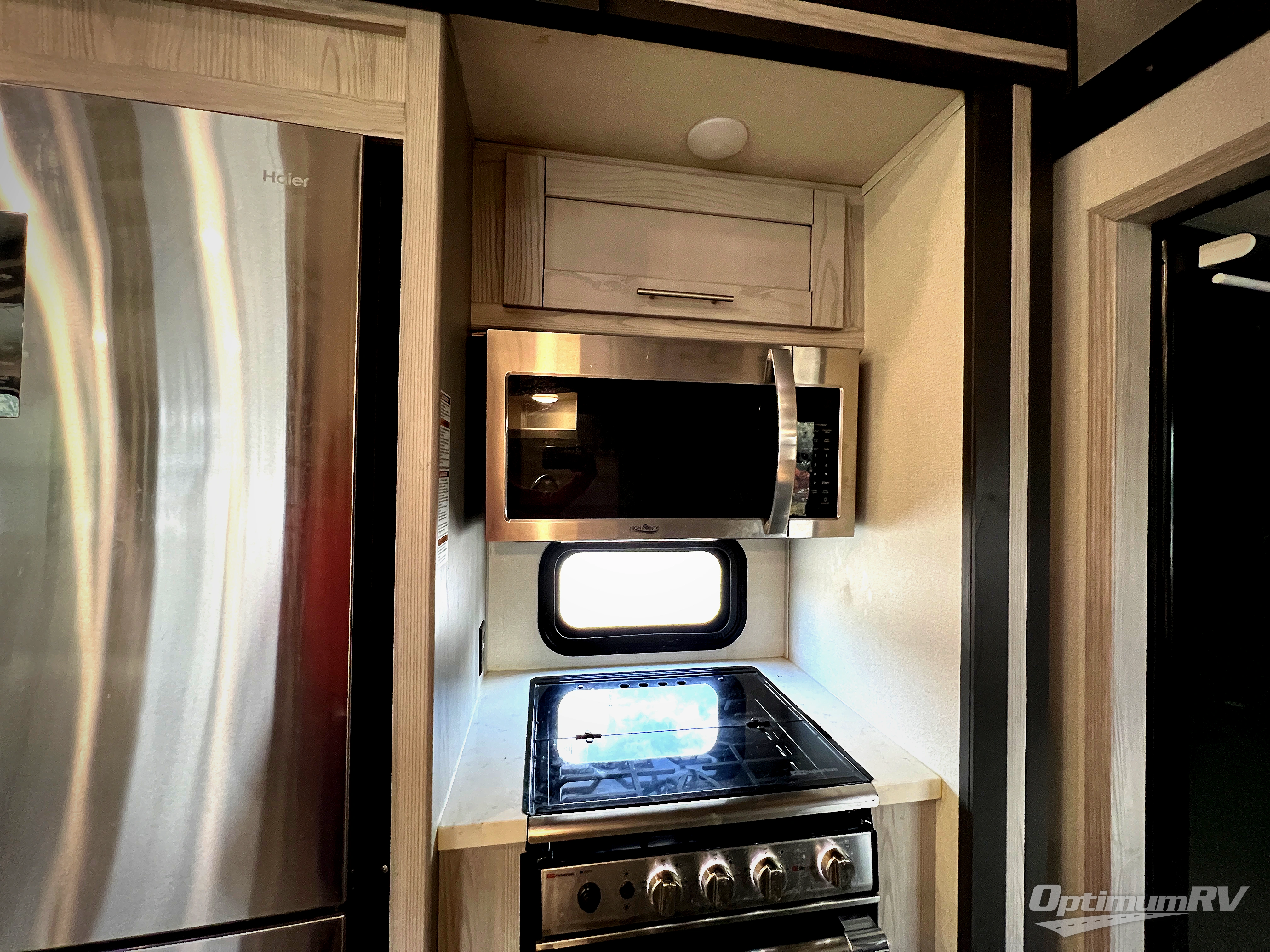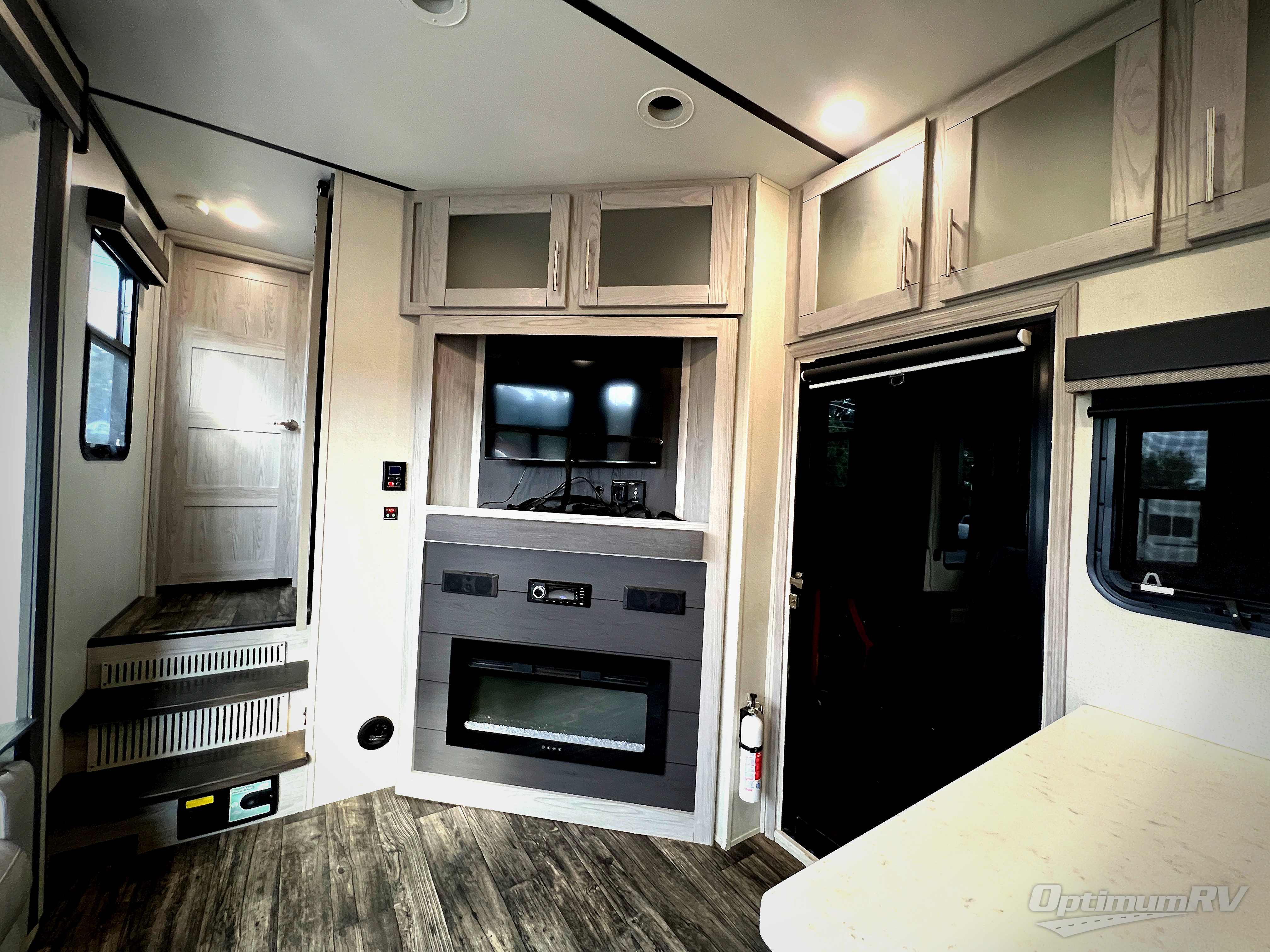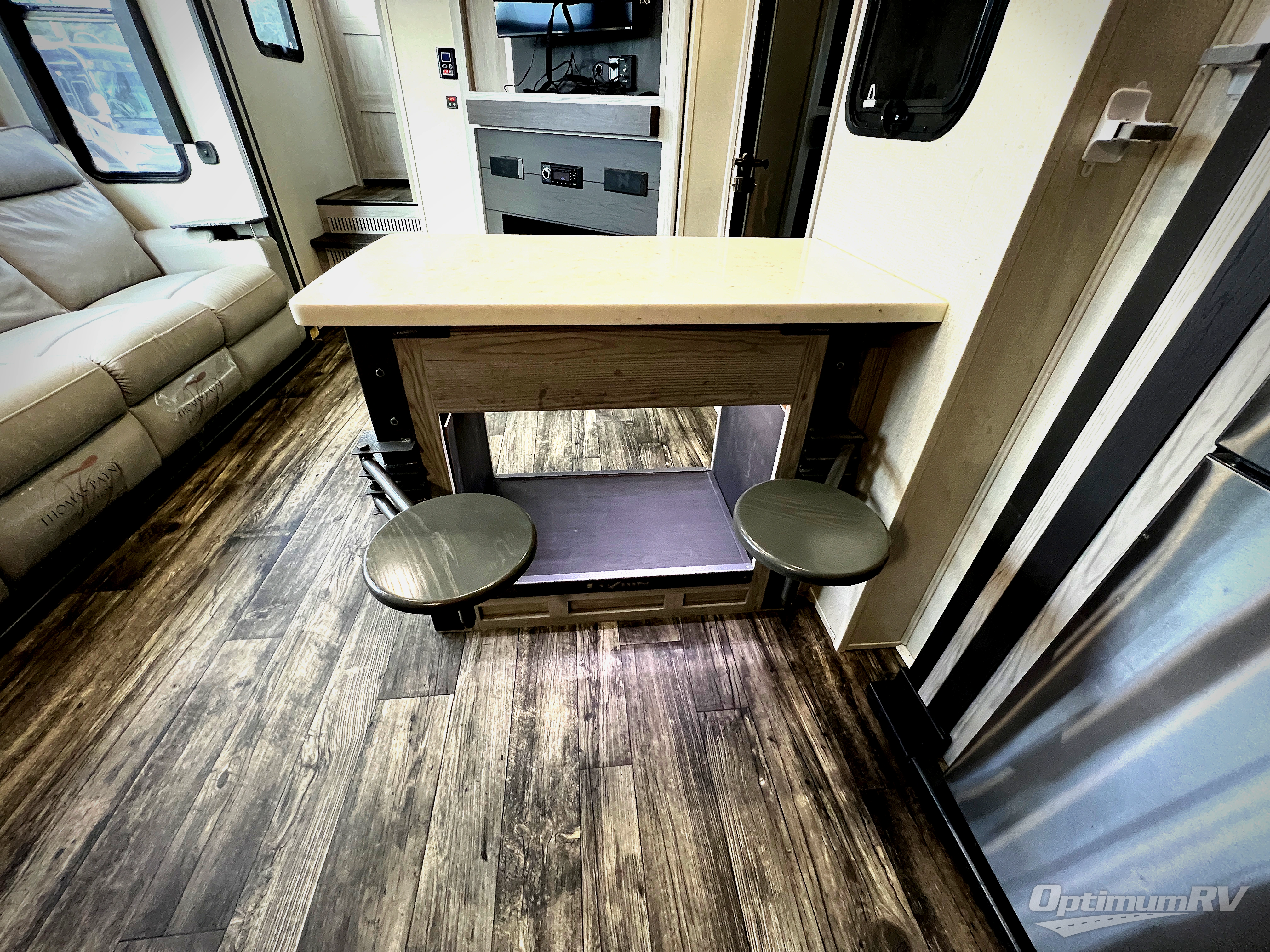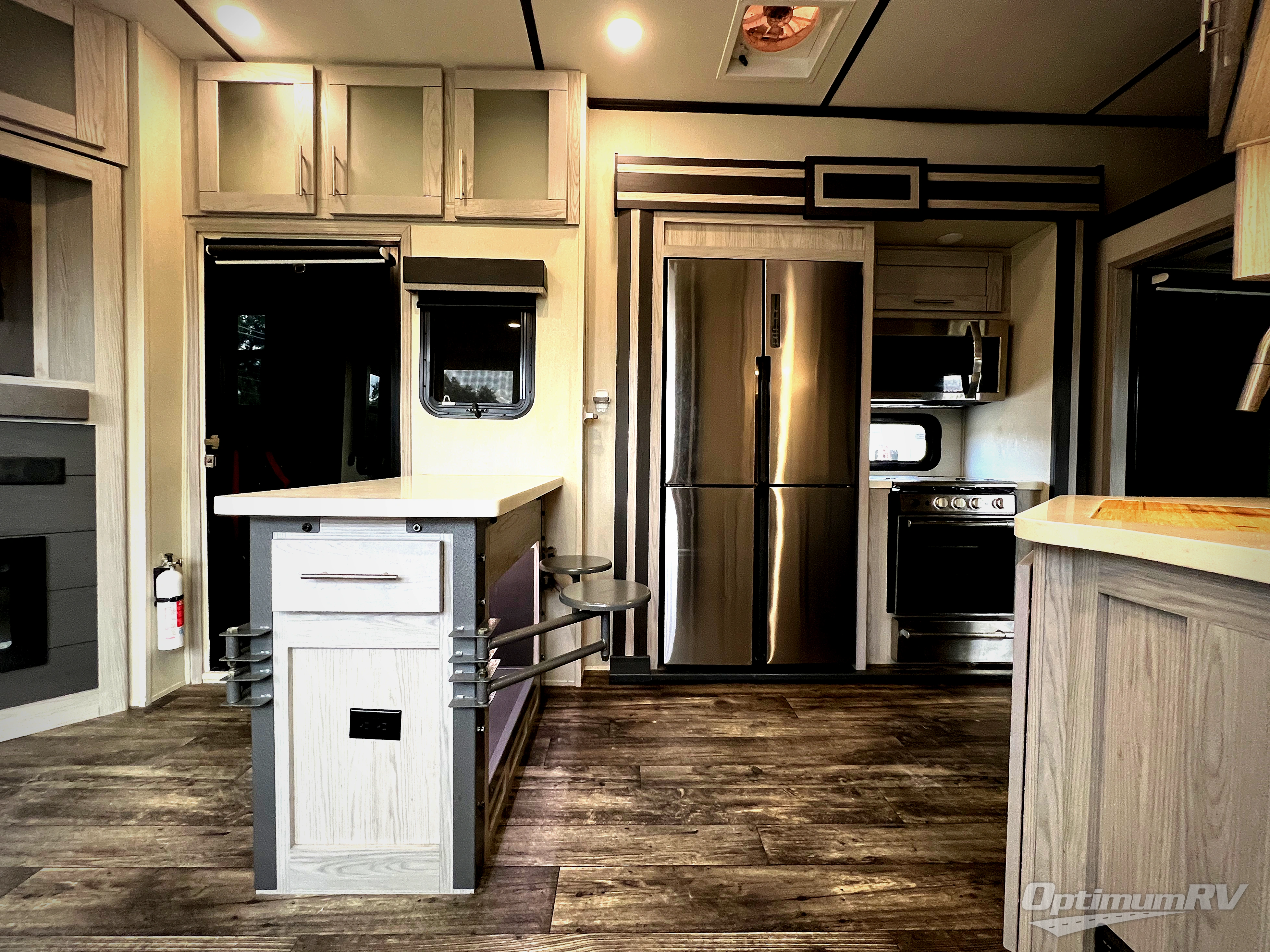 You're going to be the talk of the campground with a side patio on this toy hauler! As you walk-through the patio entry door, you will notice a table with swing-out stools to your left and a swiveling entertainment center with an LED TV, a fireplace, and a hidden pantry to your right, plus a residential four person sofa with heat, massage, and 110V/USB ports to charge your electronics. You will enjoy your own privacy with the front private bedroom which has a residential queen bed slide, a dresser with an LED TV, and a front master closet prepped to add an optional washer and dryer, plus an entrance into the dual entry bathroom. The rest of your gang will enjoy a good night's rest in the 13' garage area with dual opposing sofas with a queen bed above them and a loft with bunk mat. The garage also has a half bathroom for their convenience, an LED TV for entertainment, and a 8' MORryde zero gravity ramp door to easily load an unload your toys!