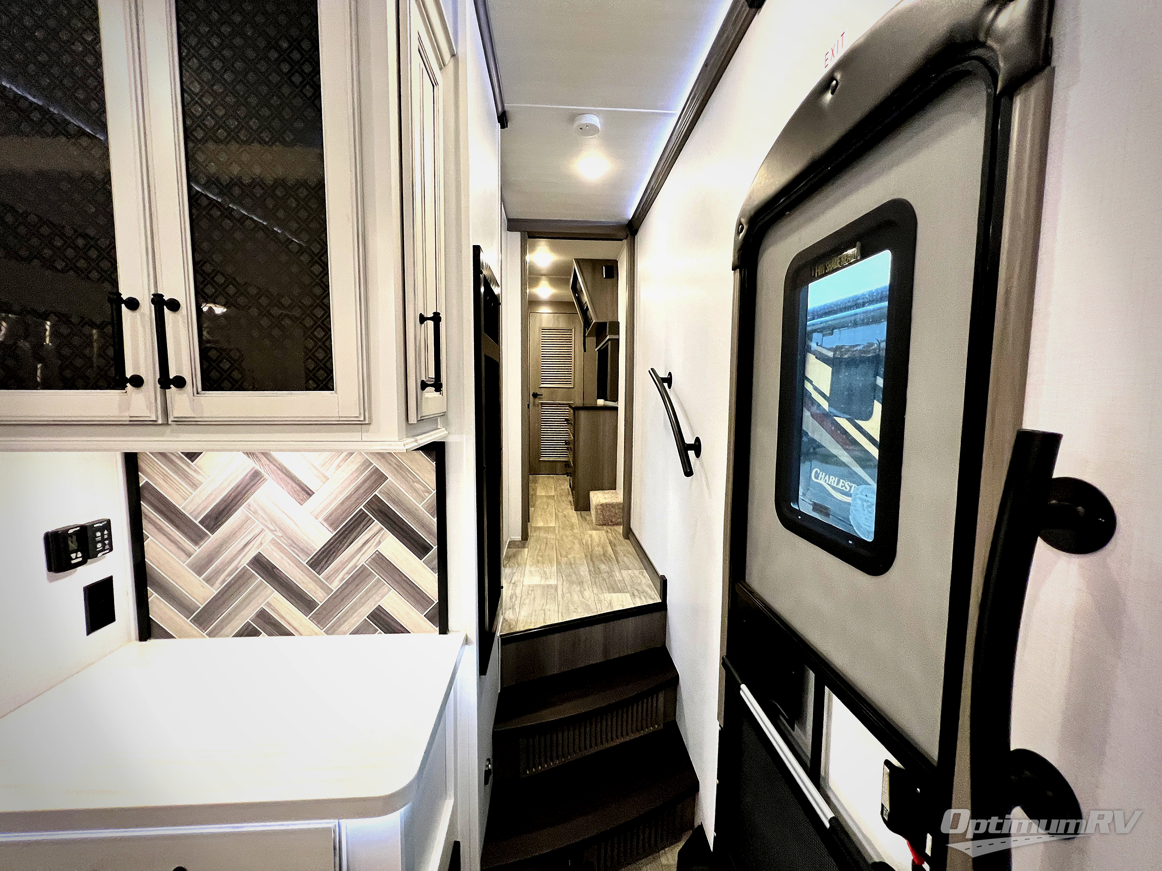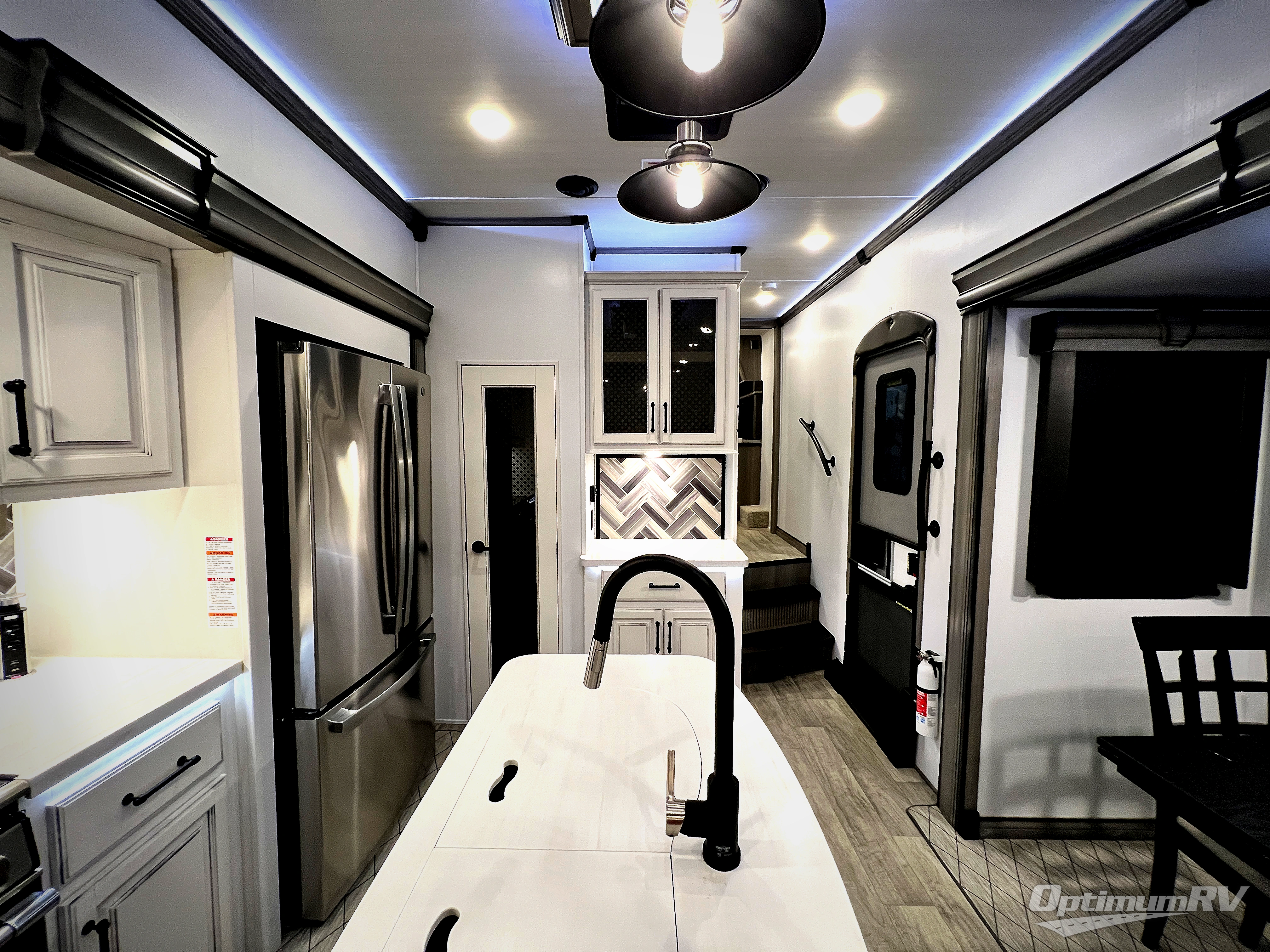 The coffee lover will enjoy camping in this fifth wheel with the coffee station in the kitchen! The kitchen also has an island, a large pantry, a glass top range with convection microwave and range hood that has a pull-down spice rack, a 18 cu. ft. residential refrigerator, and floor cabinets for your storage needs. Eat your meals and play card games at the free standing legless dinette with 110V outlets to charge your electronics. The separated living area has opposing hide-a-bed sofas and power Thomas Payne theater seating across from a rear entertainment center with a telescoping 50" LCD HDTV and a 5,000 BTU decorative fireplace heater with storage on either side. When you're ready to wind down your nights, head to the front private bedroom to enjoy a good night's rest on the king bed slide with storage underneath and there is a front closet with a clothing hamper and an area to add the optional stackable washer and dryer to have clean clothes for your longer trips!