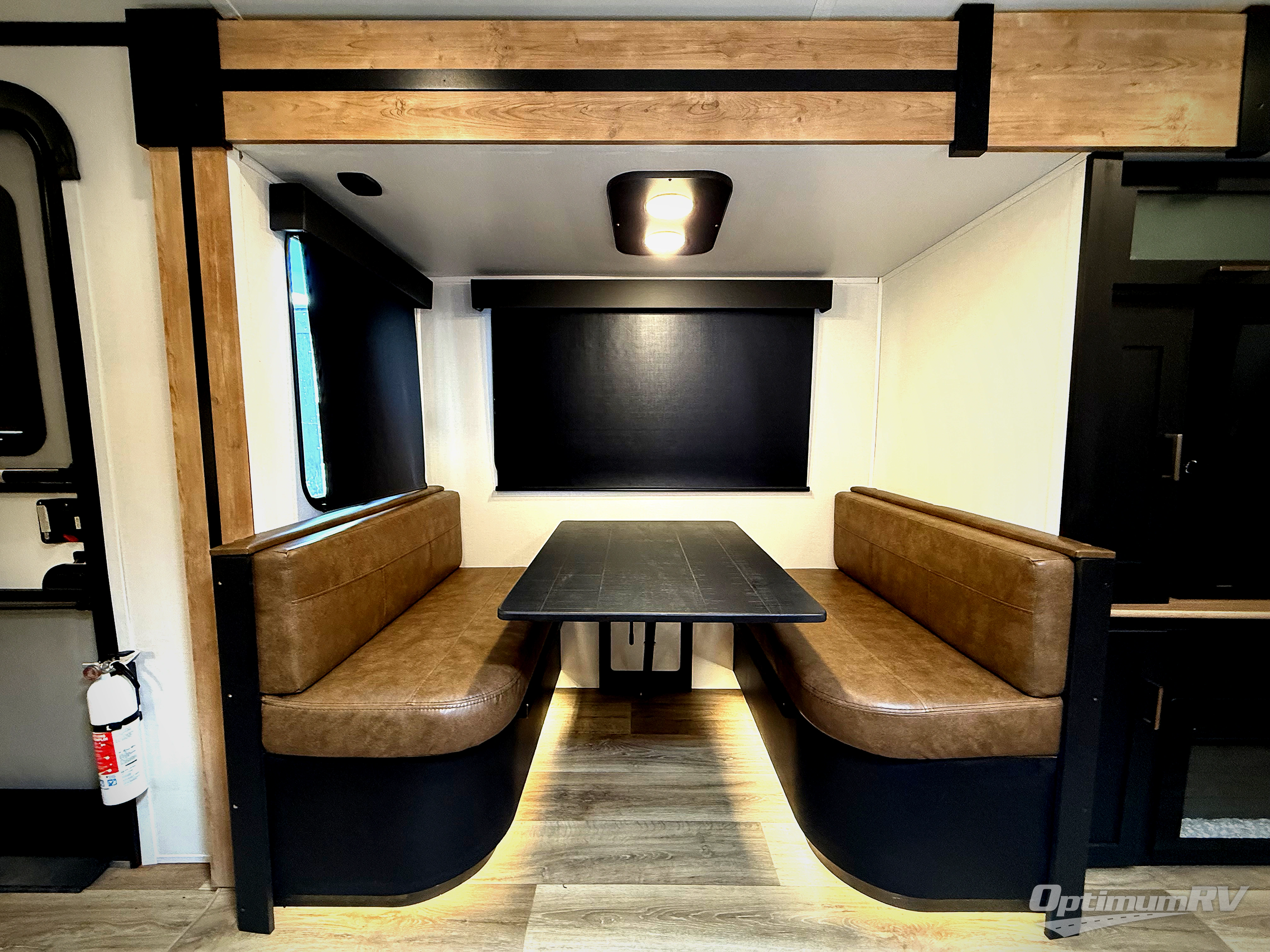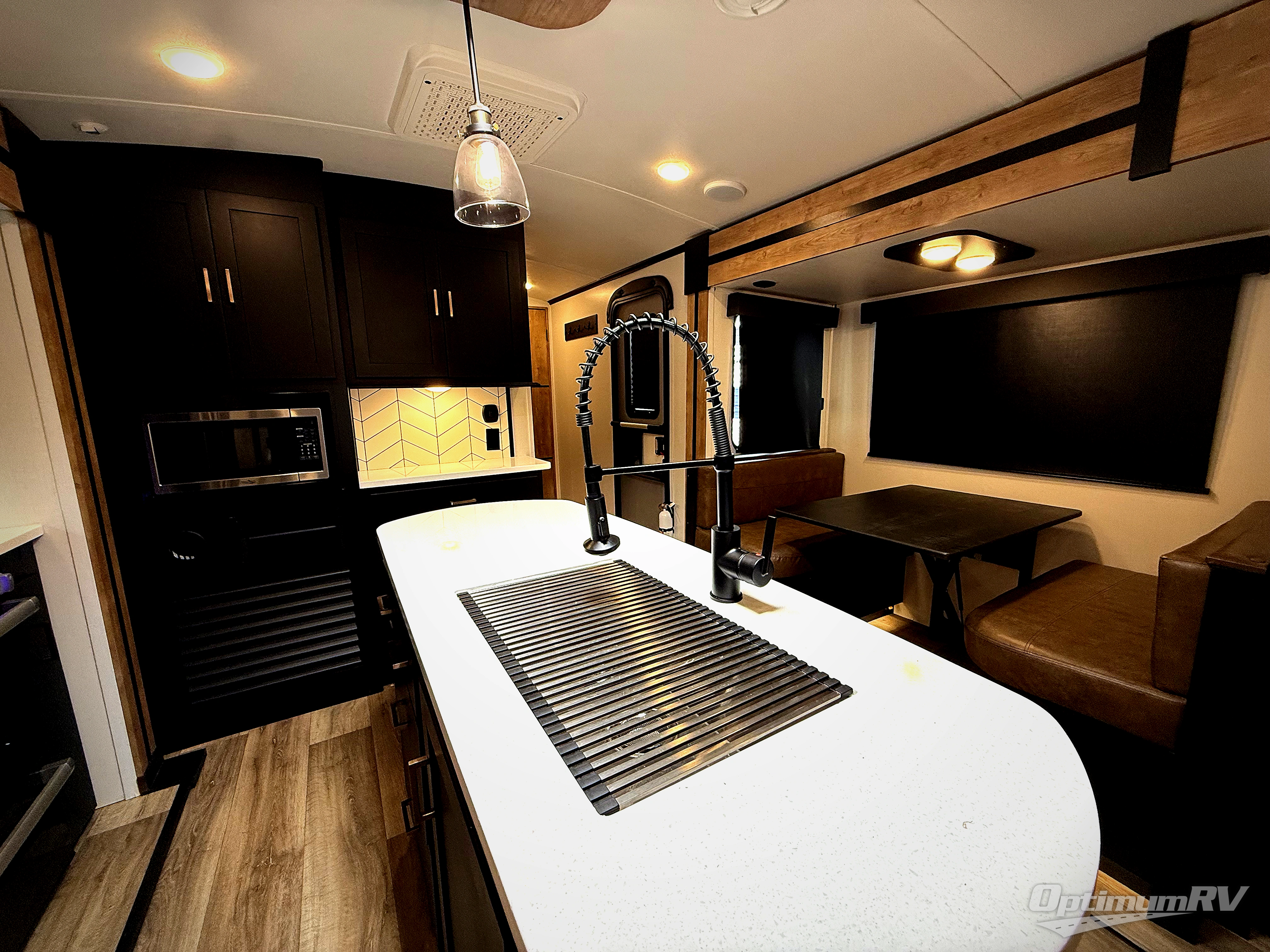 A spacious rear living area is created by two opposing slide outs giving everyone plenty of floor space to move from the sofa sleeper to the double entry bathroom and front private bedroom. You can relax on the theater seats while watching the 50" HDTV with fireplace below, and dine at the booth dinette. The kitchen island is a great place to wash the veggies and fruit, and prepare meals. The cook will have full amenities including more counter space near the microwave. And there is an outside kitchen with a flip-out stove and more. The slide out king bed gives you more space in the front bedroom, and you will find plenty of storage and a place for your best friend in the built-in pet kennel. You may choose to change the 10 cu. ft. refrigerator to an 8 cu. ft. option and/or replace the dinette that comes standard with a table and chairs option.