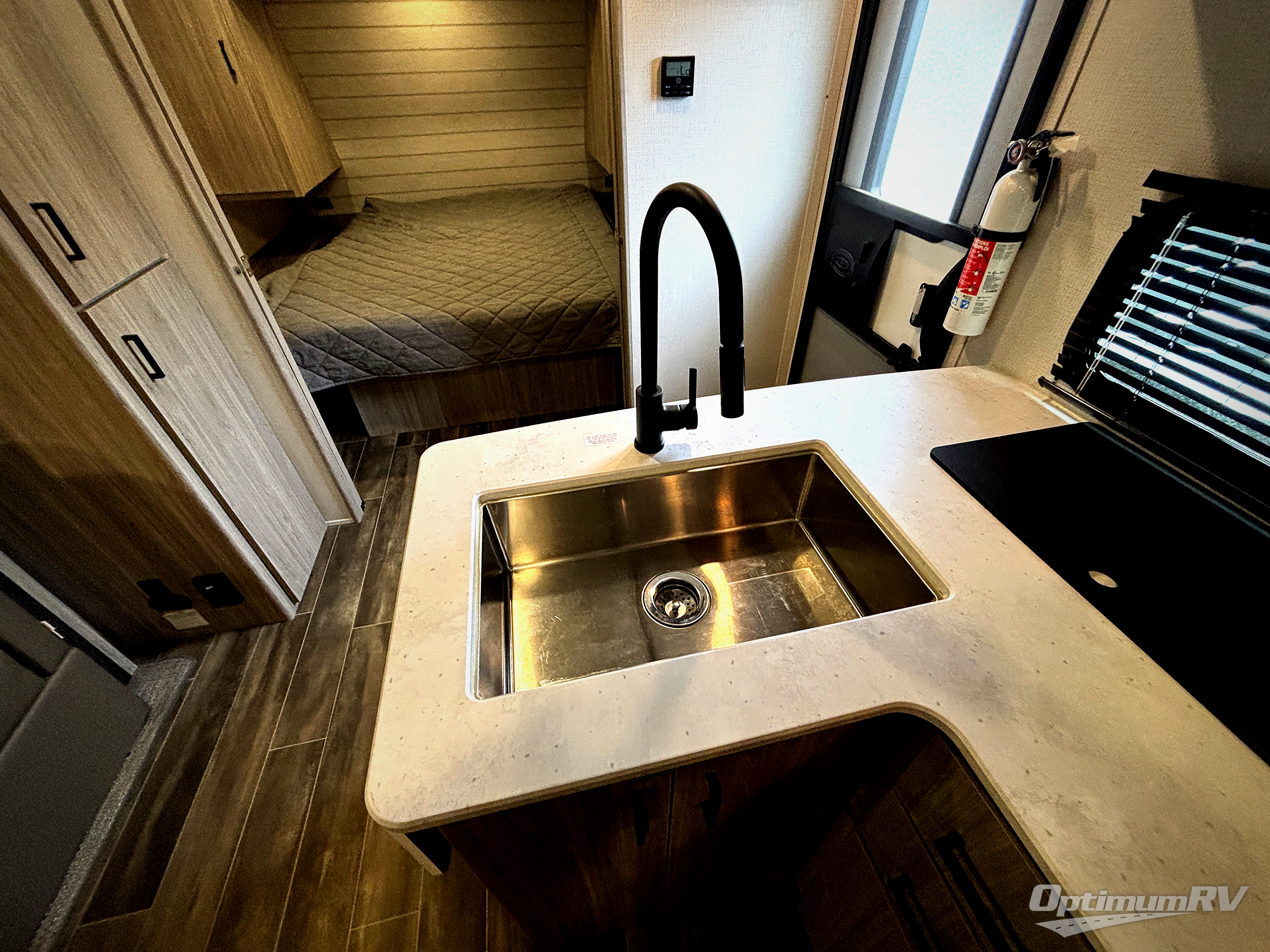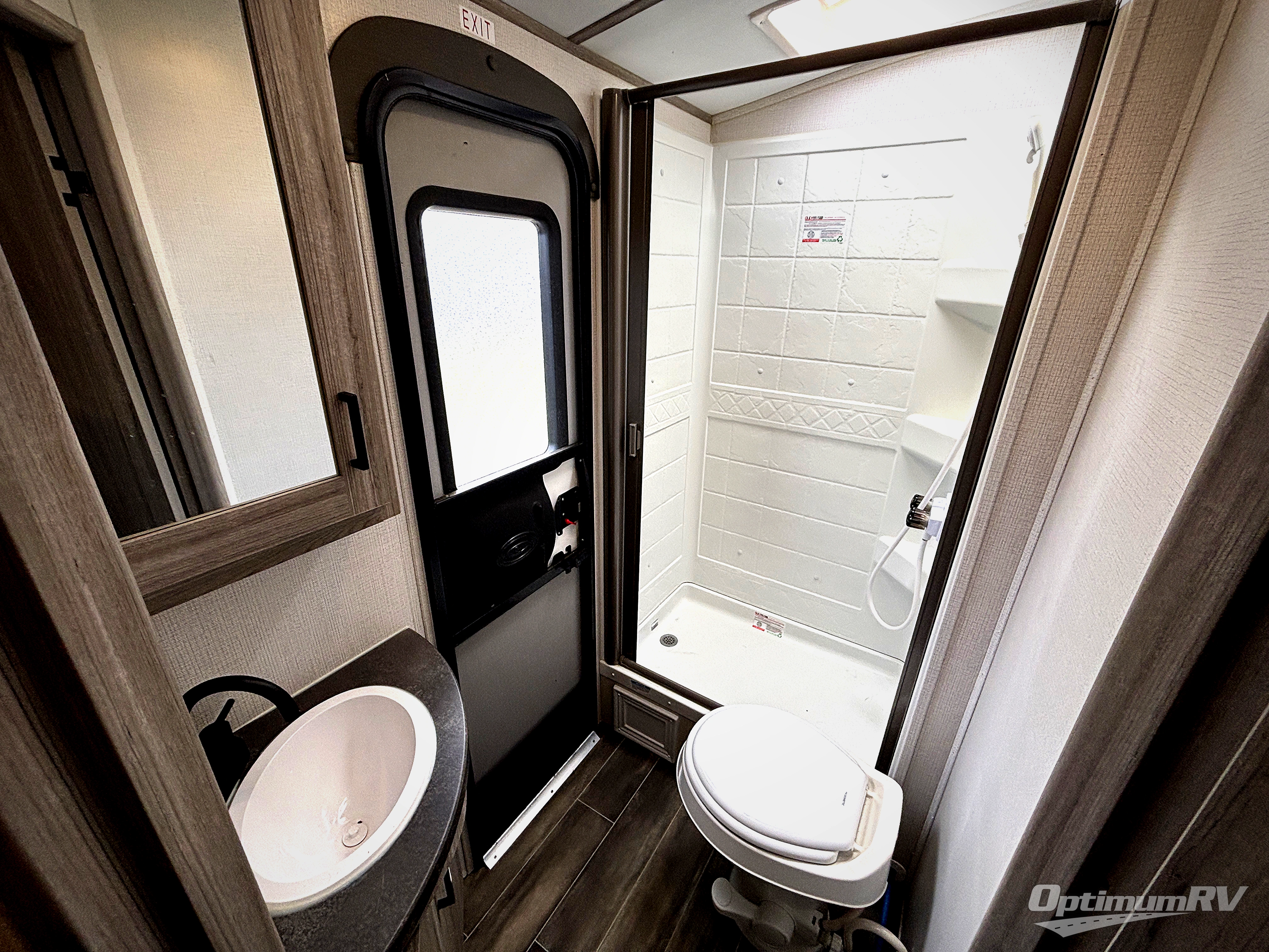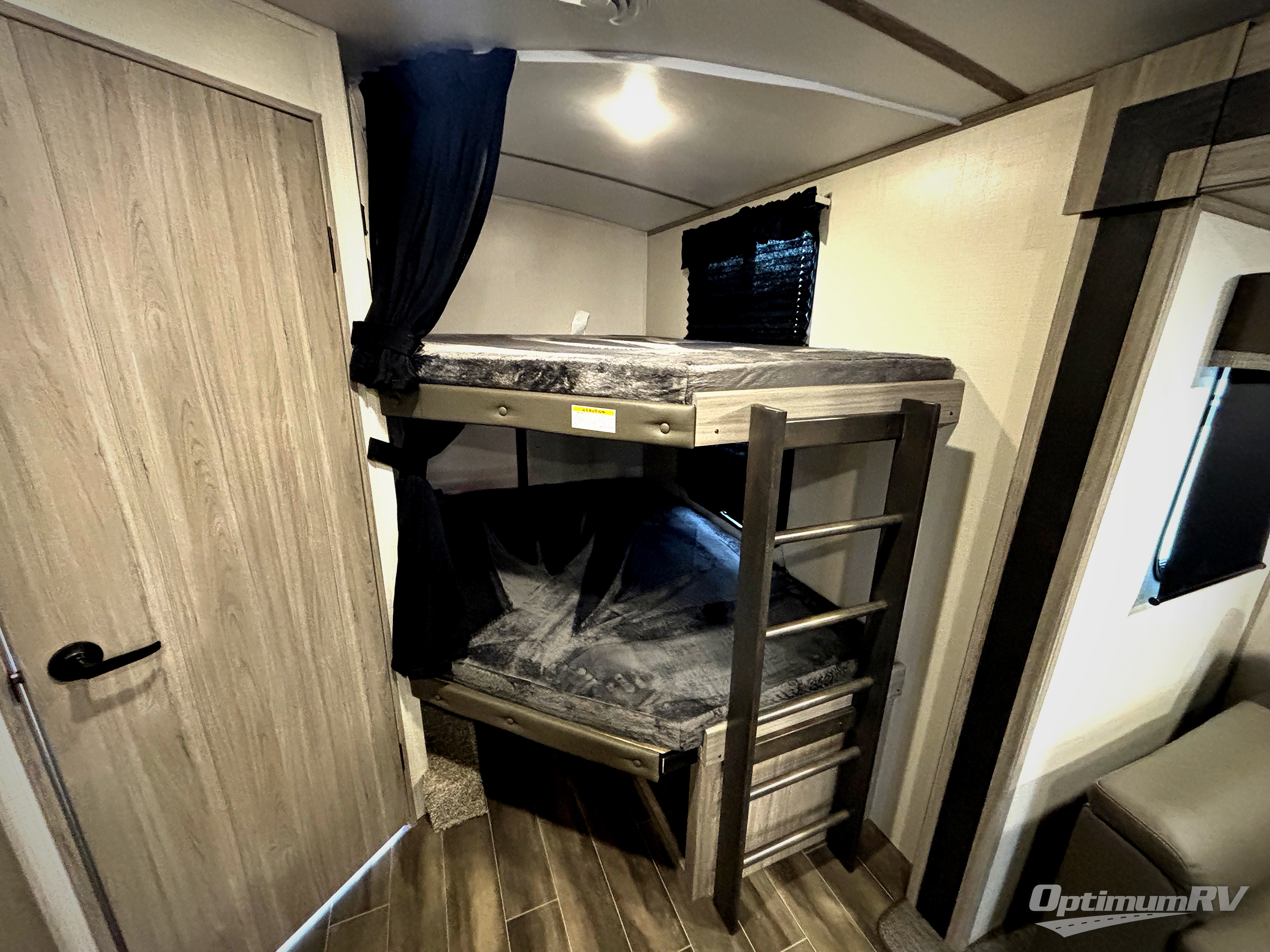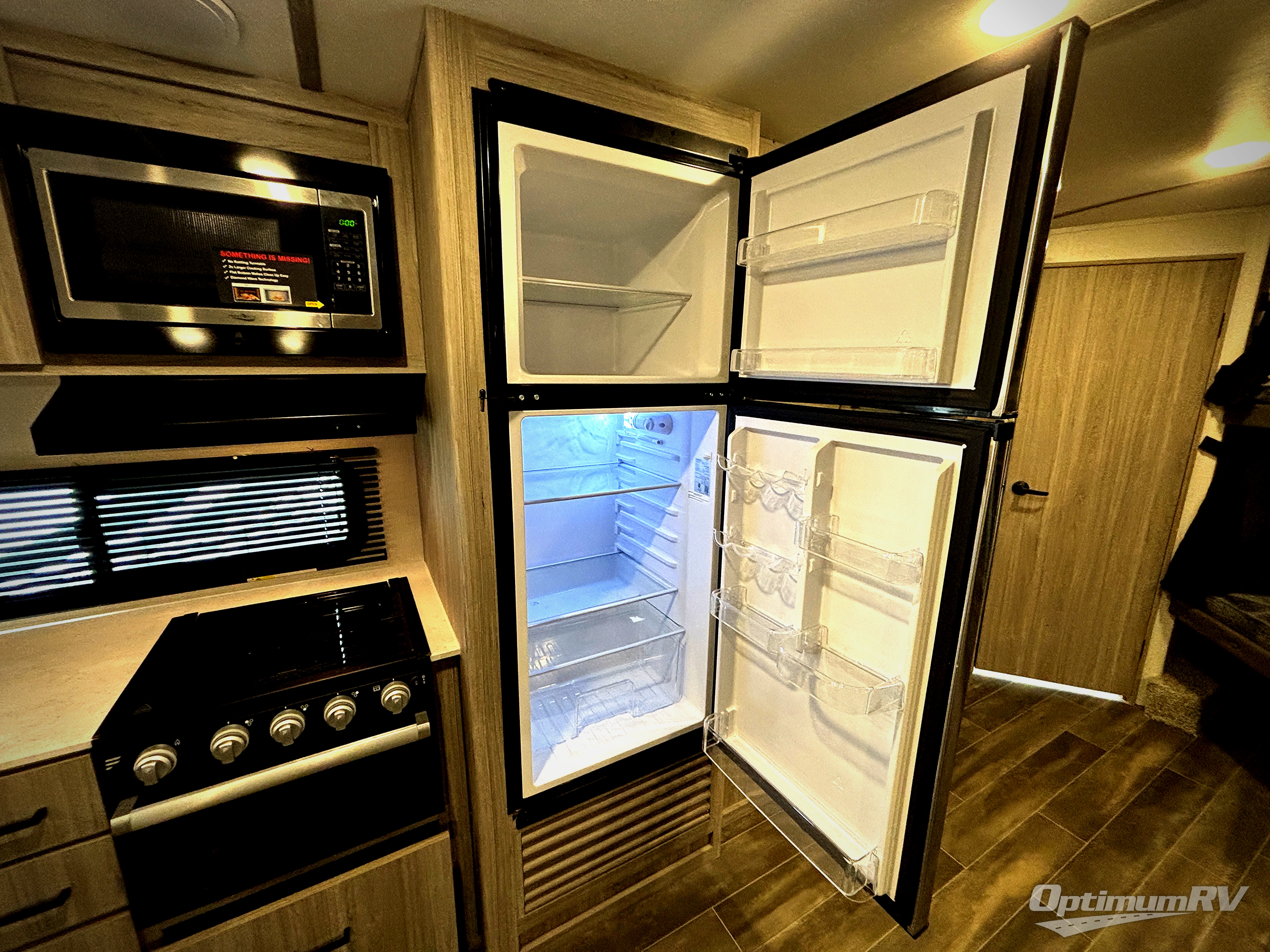 With dual entry doors, you can easily enter and exit this travel trailer! One of the entrances even leads directly into the rear corner bathroom so you can get back to having fun outdoors fast. The set of 51" x 74" bunk beds has a flip-up bottom bunk for storage space and a ladder to safely reach the top. The tri-fold sofa sleeper and U-shaped dinette slide opens up the living/kitchen area and they can be switched out for the optional pivot furniture which can flip back and forth for a dinette or sofa position. Create delicious home cooked meals with the three burner cooktop and flip-up countertop or head to the outside kitchen to breathe in some fresh air while cooking dinner. The exterior also has front pass-through storage, a rear exterior storage area, a cargo door, and a 21' power awning to protect you rain or shine!