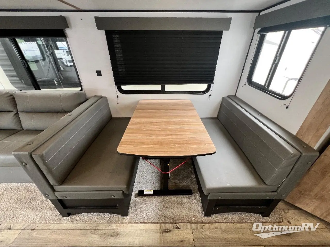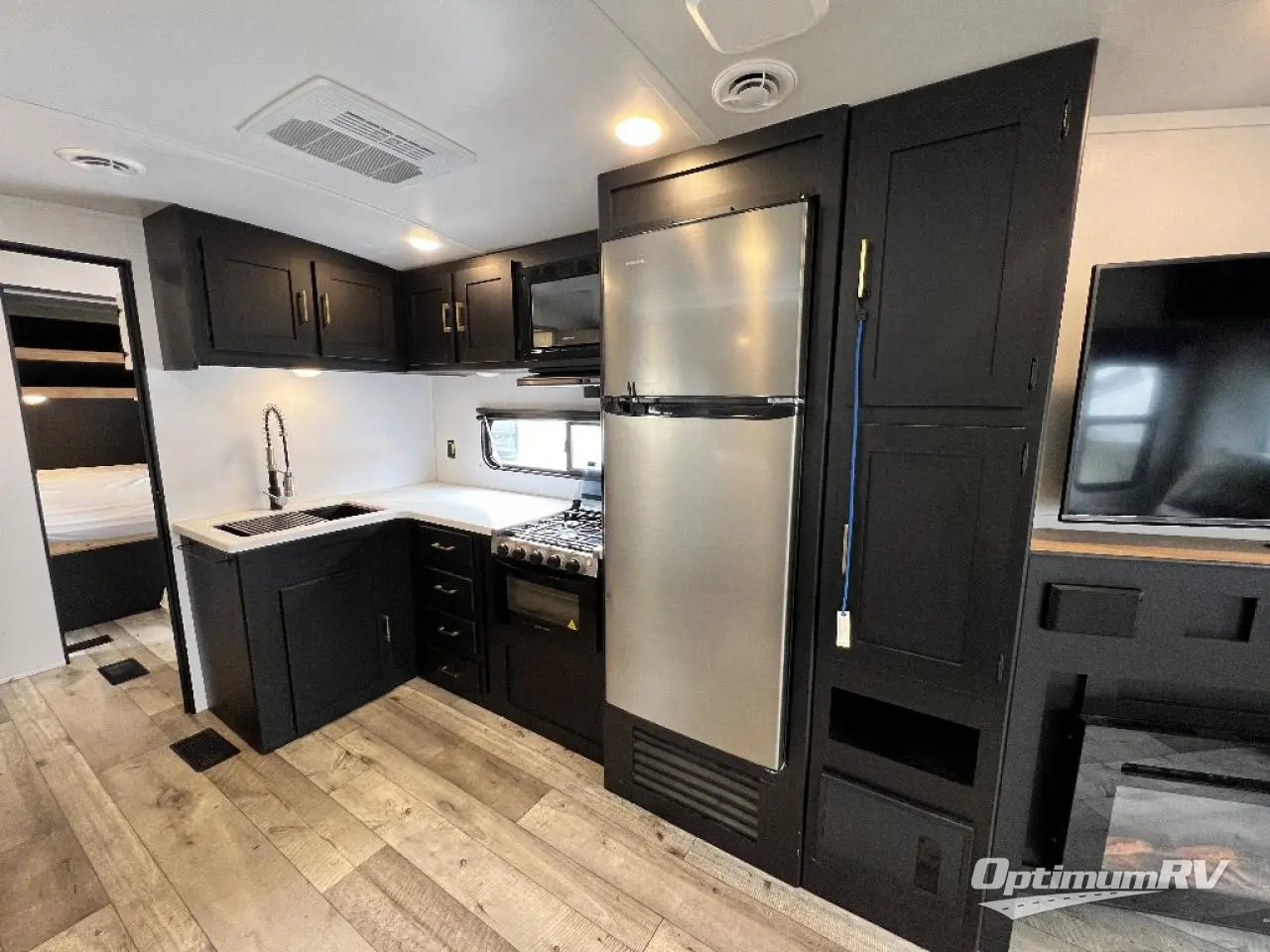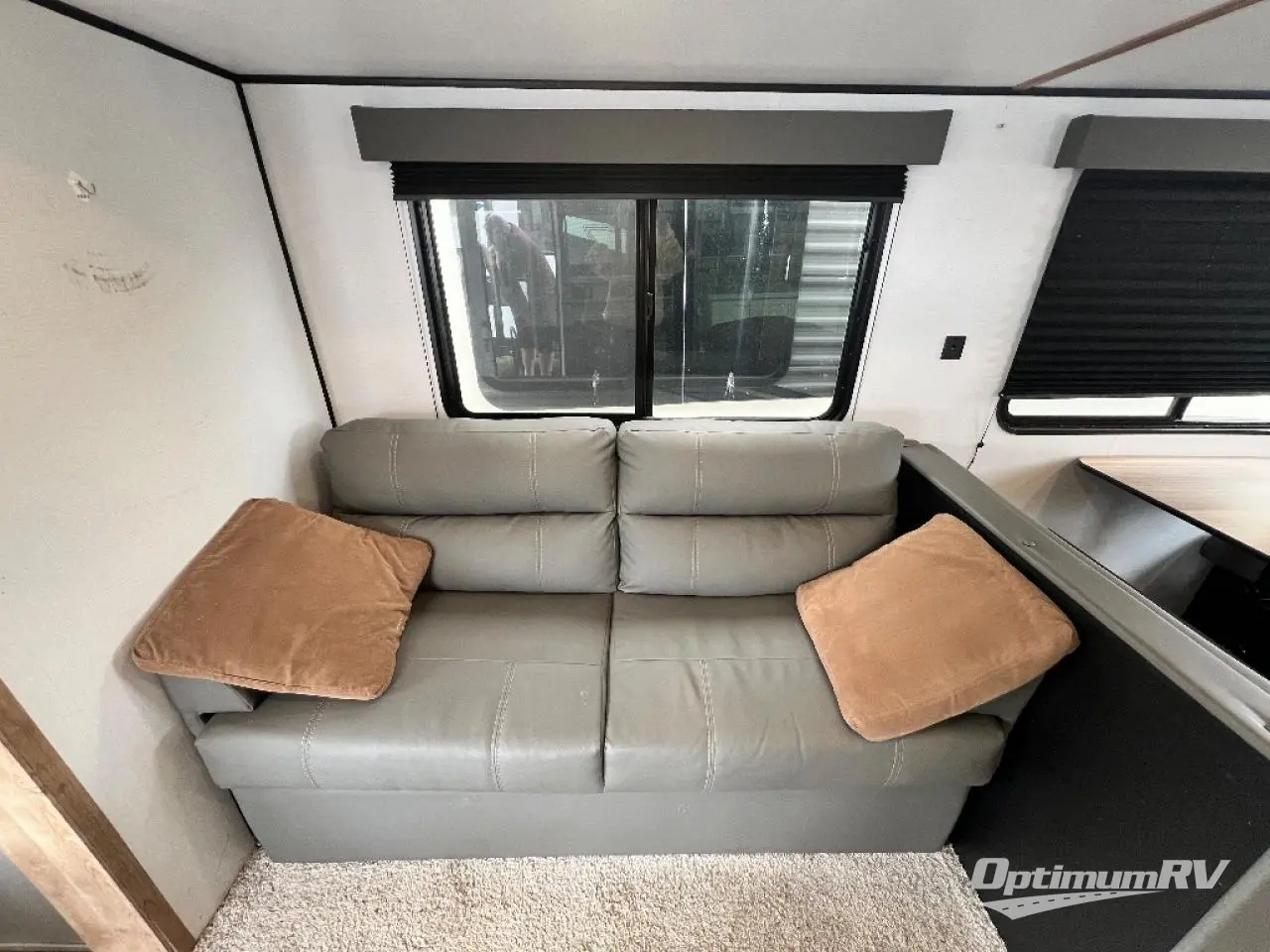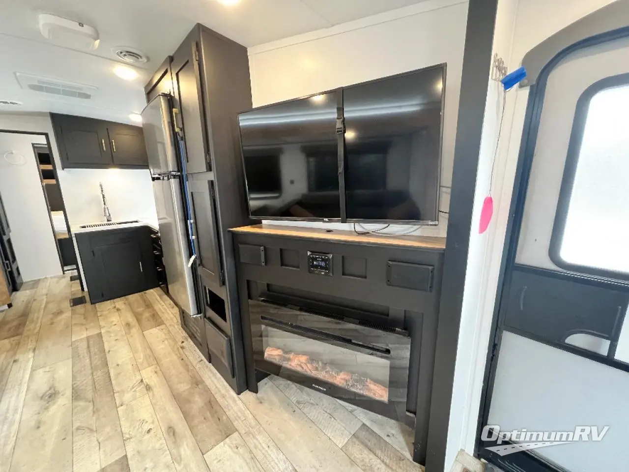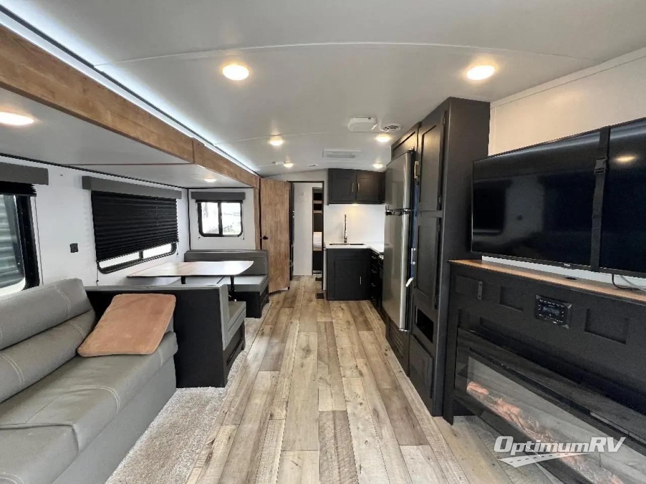 If you want a quick weekend trip or a longer week in the woods, this travel trailer is going to be your best choice because it has everything needed to enjoy your time away! There is a large slide in the main living area to provide you with some extra floor space to relax on the sofa, and the booth dinette will be a cozy spot to sit down with a hot meal. You can use the three-burner range to prepare that meal, the L-shaped counter to serve your meals from, and you can store some canned goods and snacks in the pantry. The fireplace makes this combined space cozy especially during those chilly camping evenings. And the 21' power awning is available for use whenever you want to relax outdoors, just grab your camping chairs from the front pass-through compartment.
