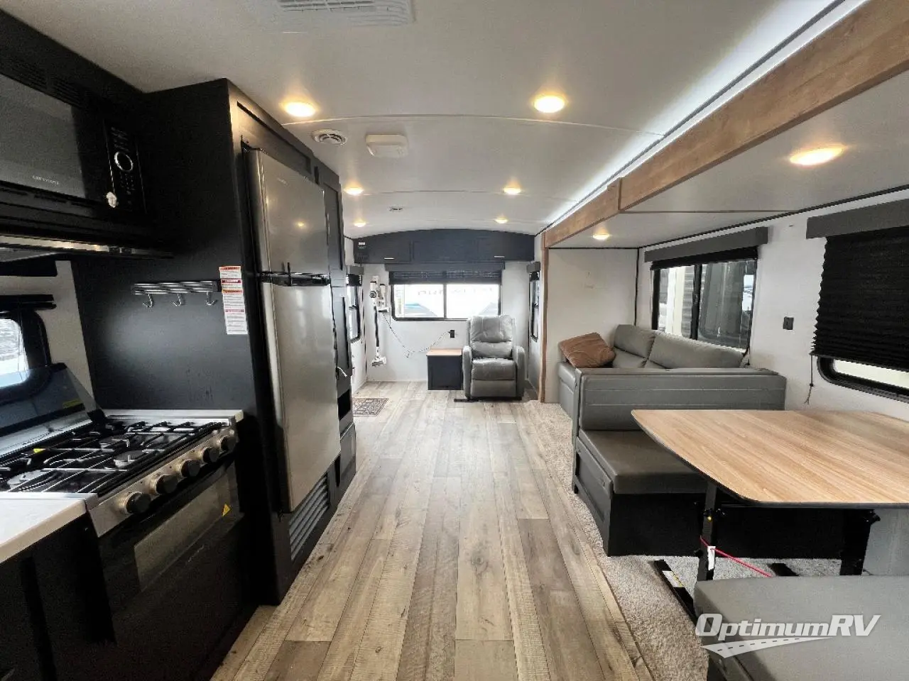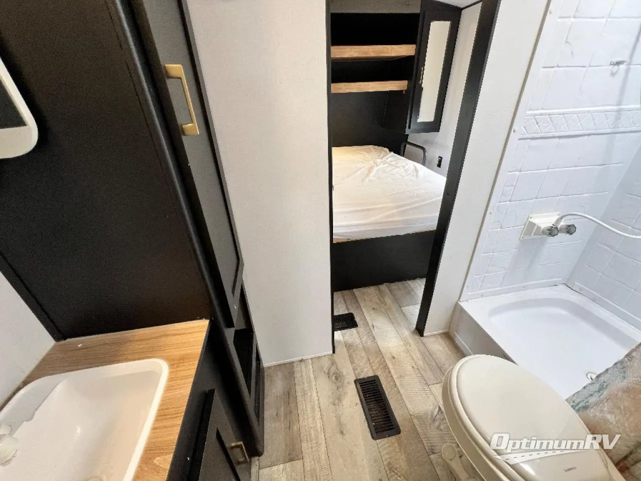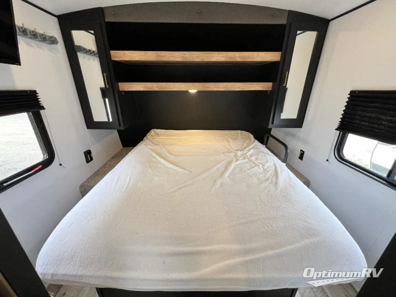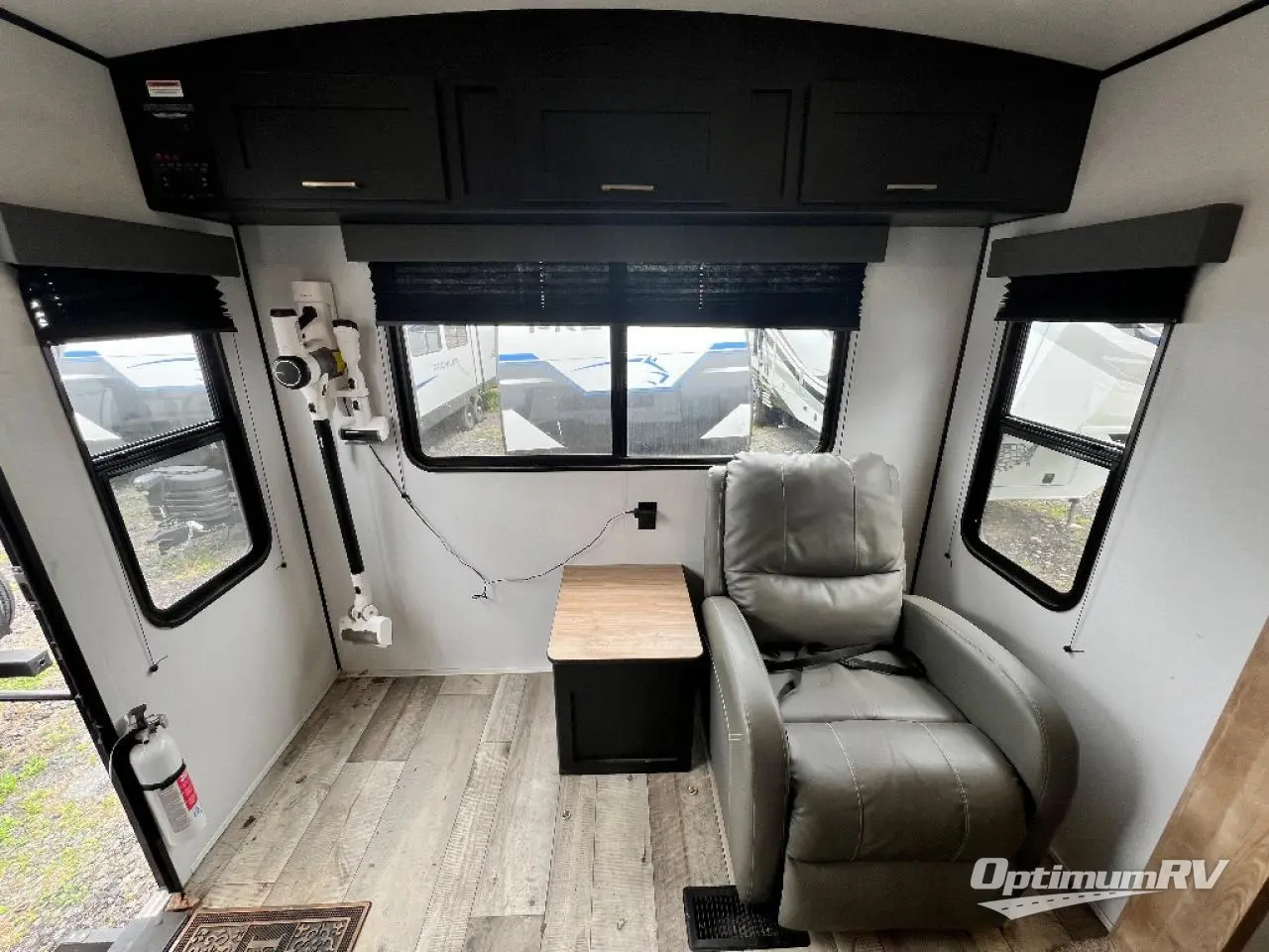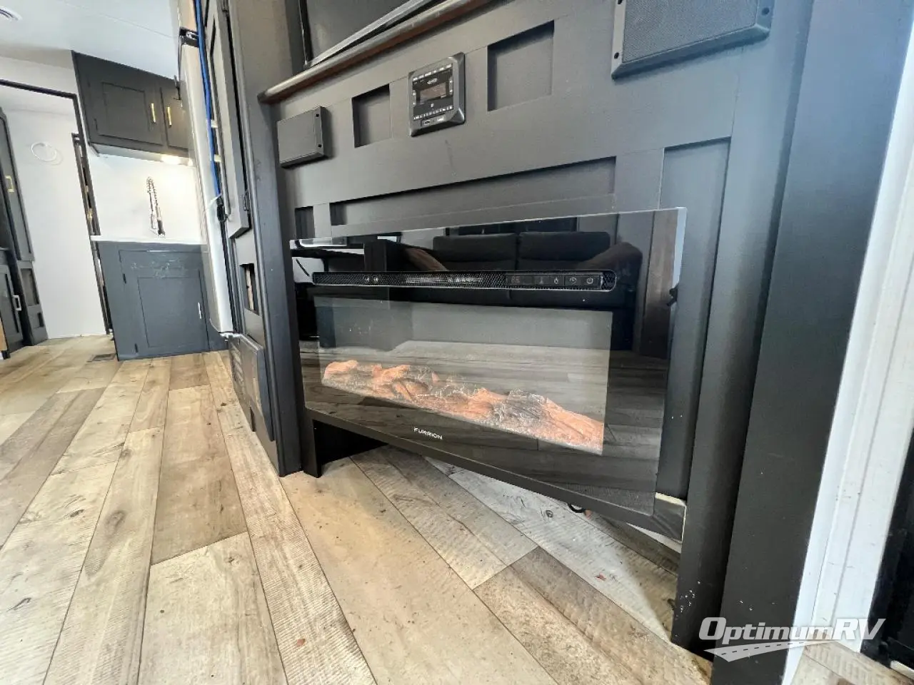 If you want a quick weekend trip or a longer week in the woods, this travel trailer is going to be your best choice because it has everything needed to enjoy your time away! There is a large slide in the main living area to provide you with some extra floor space to relax on the sofa, and the booth dinette will be a cozy spot to sit down with a hot meal. You can use the three-burner range to prepare that meal, the L-shaped counter to serve your meals from, and you can store some canned goods and snacks in the pantry. The fireplace makes this combined space cozy especially during those chilly camping evenings. And the 21' power awning is available for use whenever you want to relax outdoors, just grab your camping chairs from the front pass-through compartment.