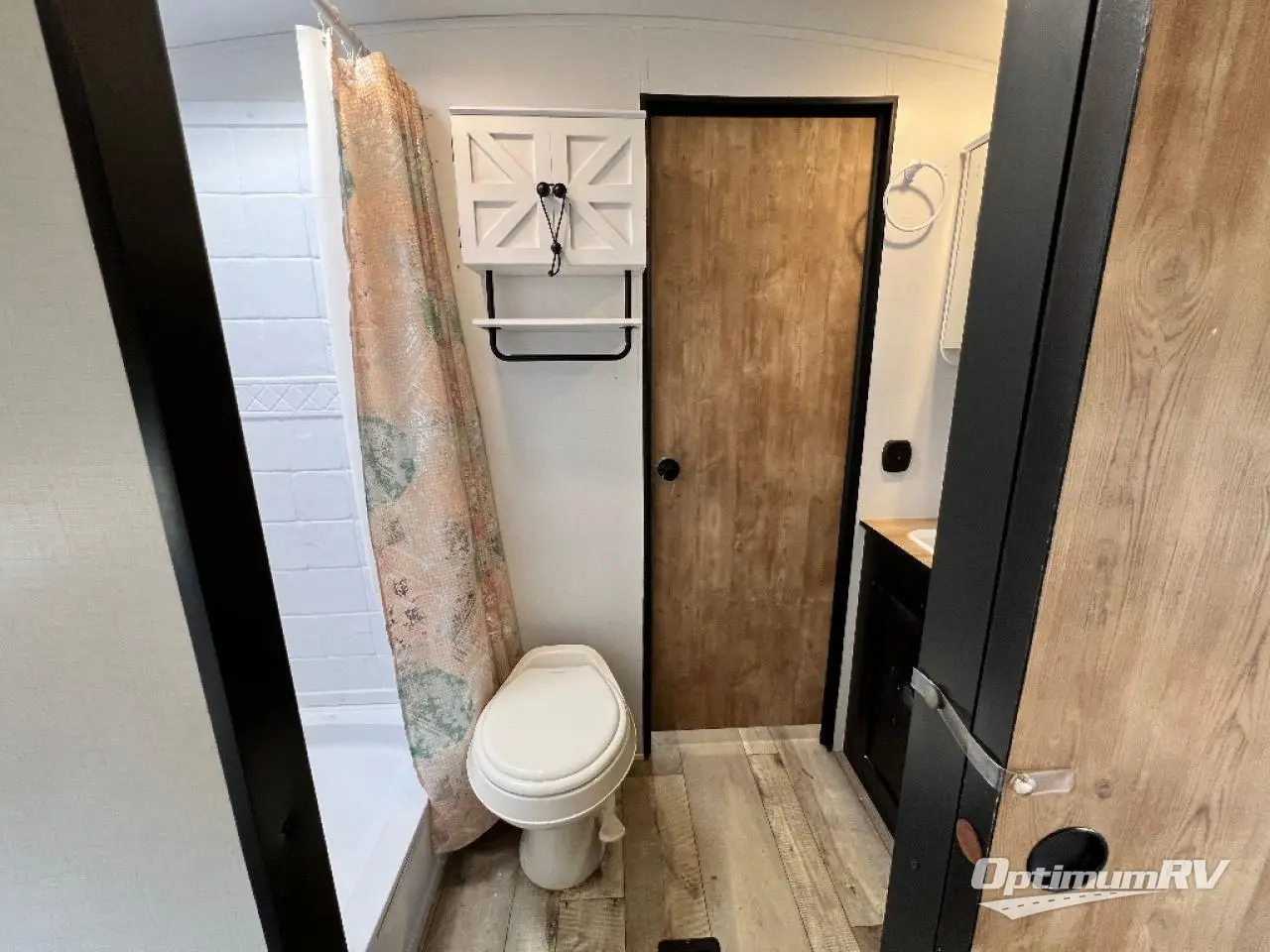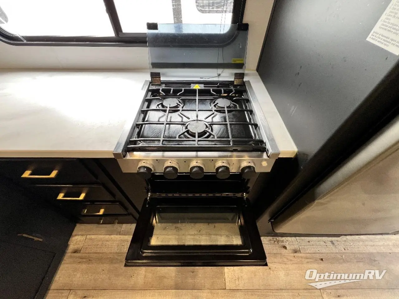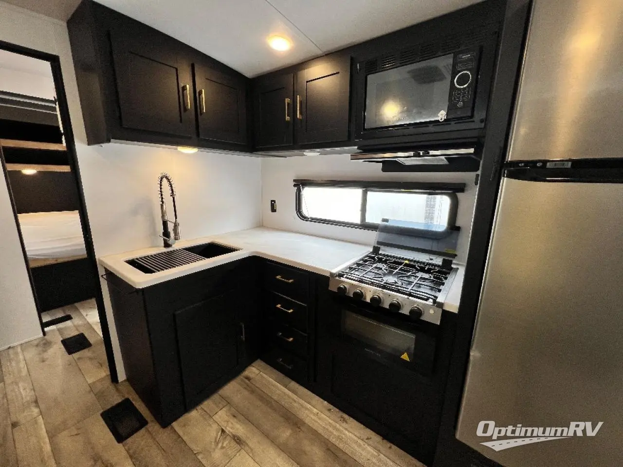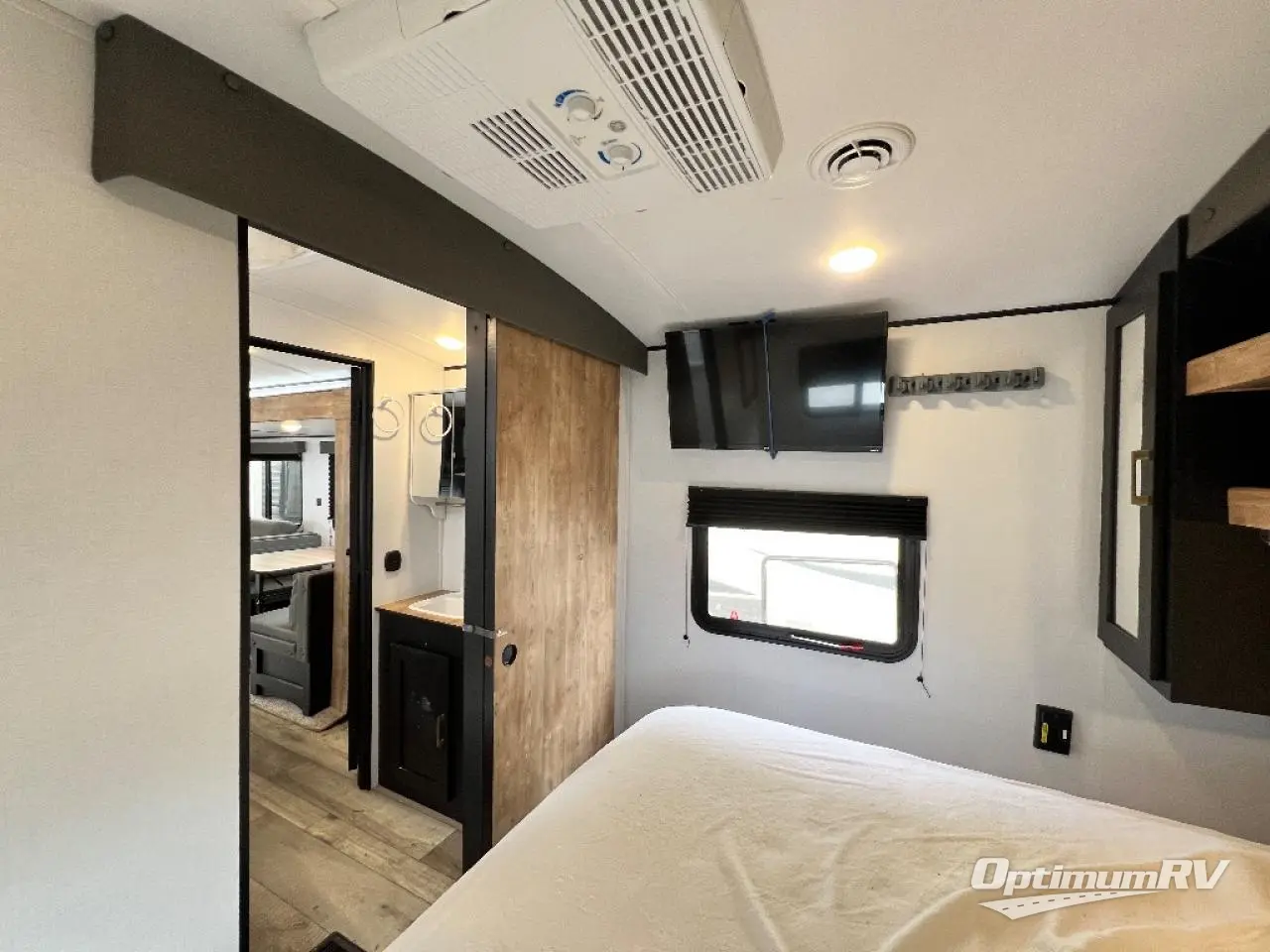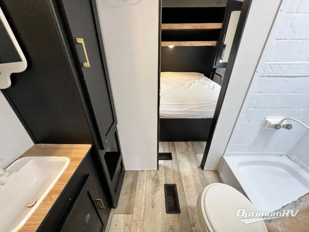 If you want a quick weekend trip or a longer week in the woods, this travel trailer is going to be your best choice because it has everything needed to enjoy your time away! There is a large slide in the main living area to provide you with some extra floor space to relax on the sofa, and the booth dinette will be a cozy spot to sit down with a hot meal. You can use the three-burner range to prepare that meal, the L-shaped counter to serve your meals from, and you can store some canned goods and snacks in the pantry. The fireplace makes this combined space cozy especially during those chilly camping evenings. And the 21' power awning is available for use whenever you want to relax outdoors, just grab your camping chairs from the front pass-through compartment.