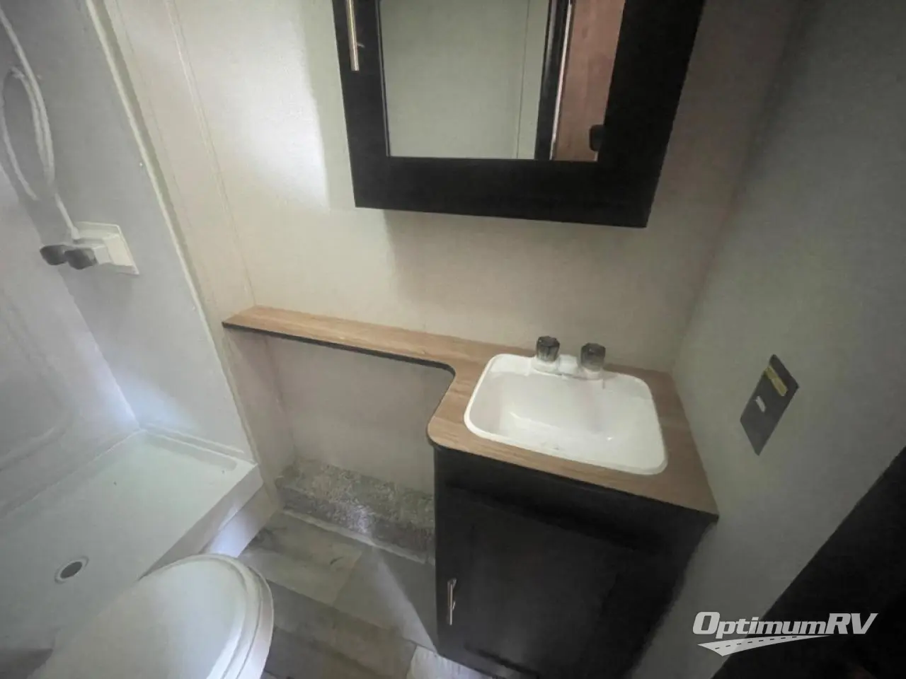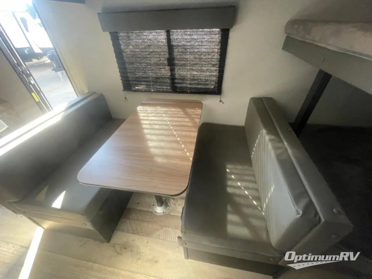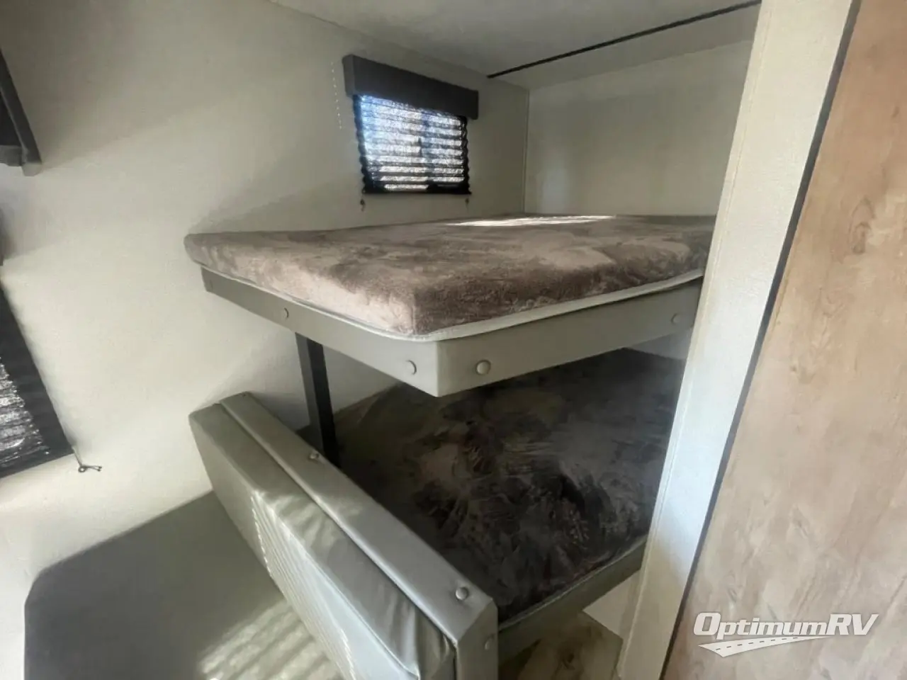This double axle trailer offers lots of sleeping space for your family and friends with the double-size bunk beds, the queen bed and the booth dinette. Once everyone selects their sleeping space, you can take turns getting cleaned up in the full bathroom with extra counter space for everyone's toiletries. The cook can whip up a snack before bedtime on the two burner cooktop or grab something from the 6 cu. ft. refrigerator and the pantry. There is a closet up front, overhead storage throughout, and inside storage under the bunk for everyone's things. And the exterior provides a pass-through compartment for more items and the outdoor gear like fishing poles and camping chairs.