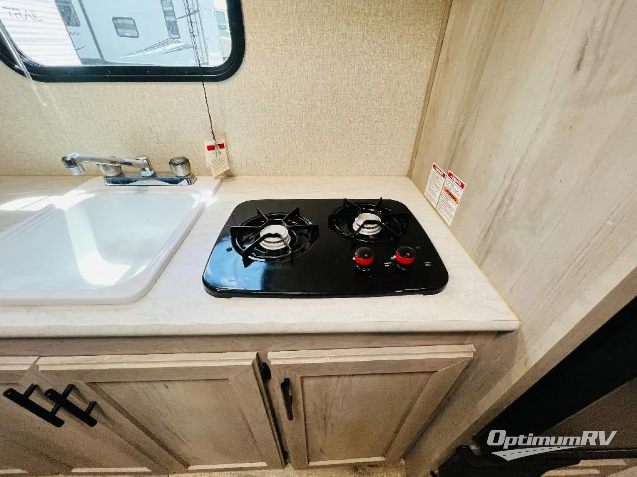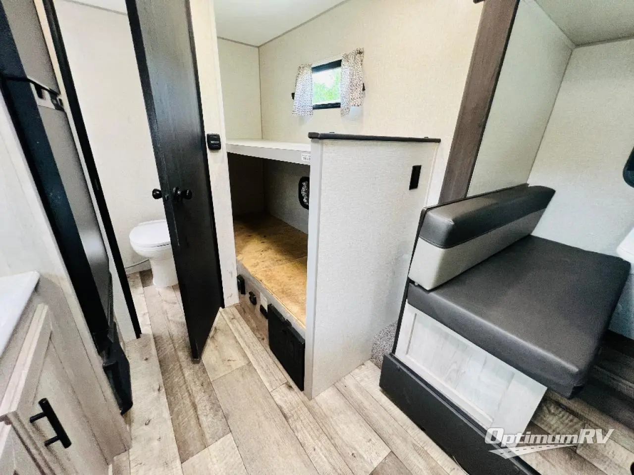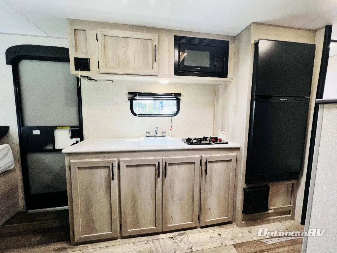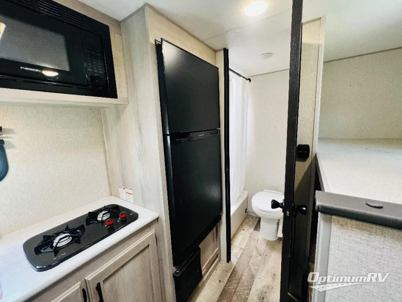 You can easily sleep five with this travel trailer thanks to the bunk beds, the front RV queen bed, and the booth dinette slide out. Whip up breakfast on the two burner cooktop, or use the convenient microwave oven. The 8 cu. ft. 12V refrigerator will store your perishables, and the single bowl sink allows you to keep everything clean. Start camping today with this cozy travel trailer!