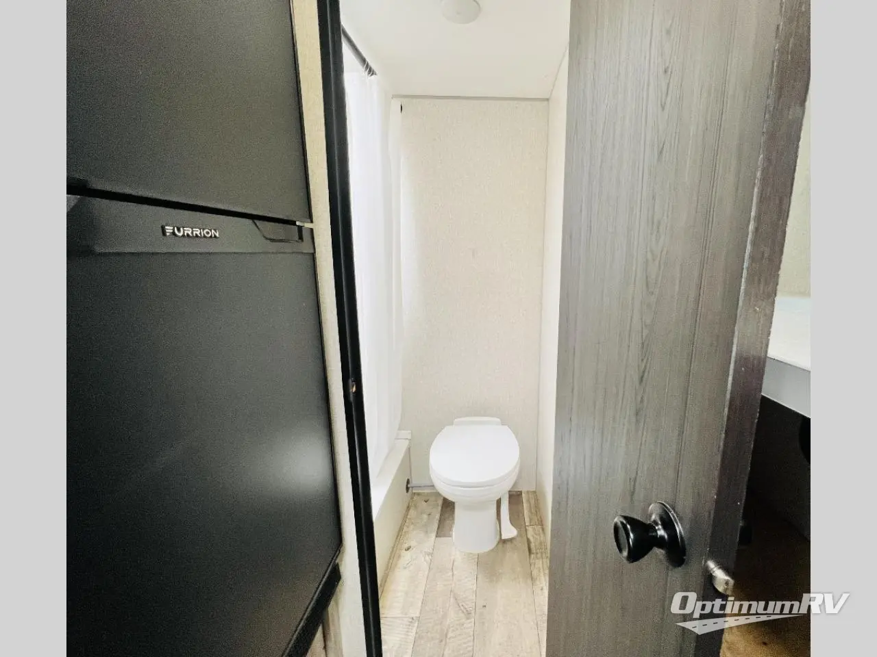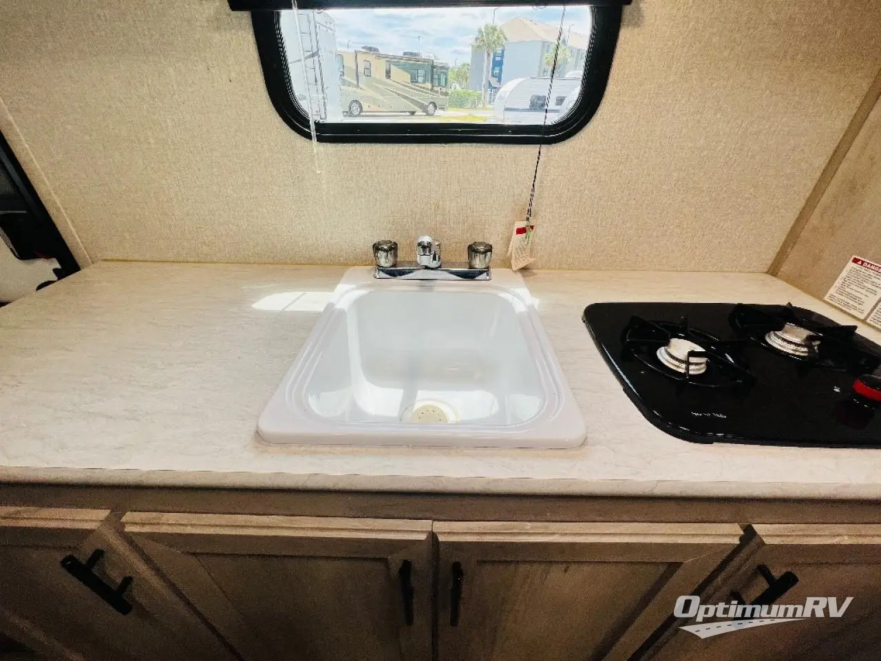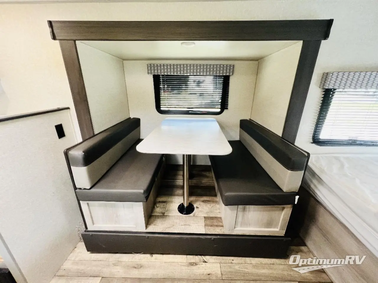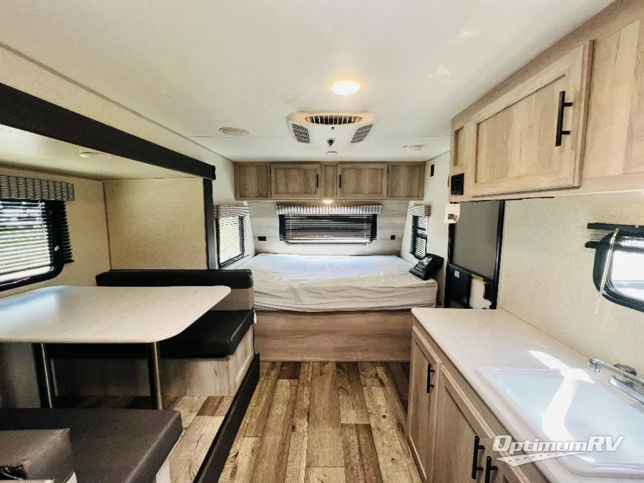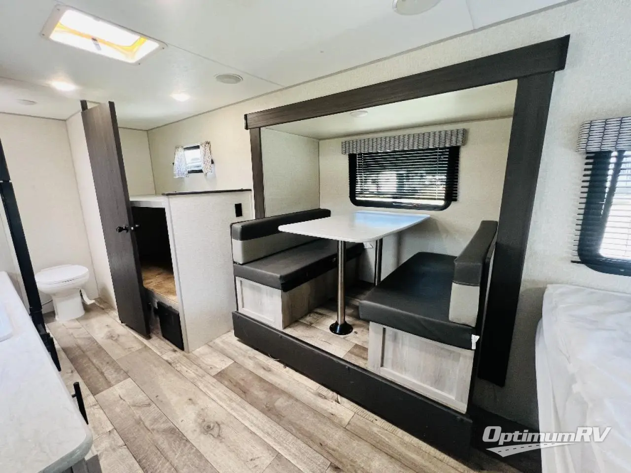 You can easily sleep five with this travel trailer thanks to the bunk beds, the front RV queen bed, and the booth dinette slide out. Whip up breakfast on the two burner cooktop, or use the convenient microwave oven. The 8 cu. ft. 12V refrigerator will store your perishables, and the single bowl sink allows you to keep everything clean. Start camping today with this cozy travel trailer!