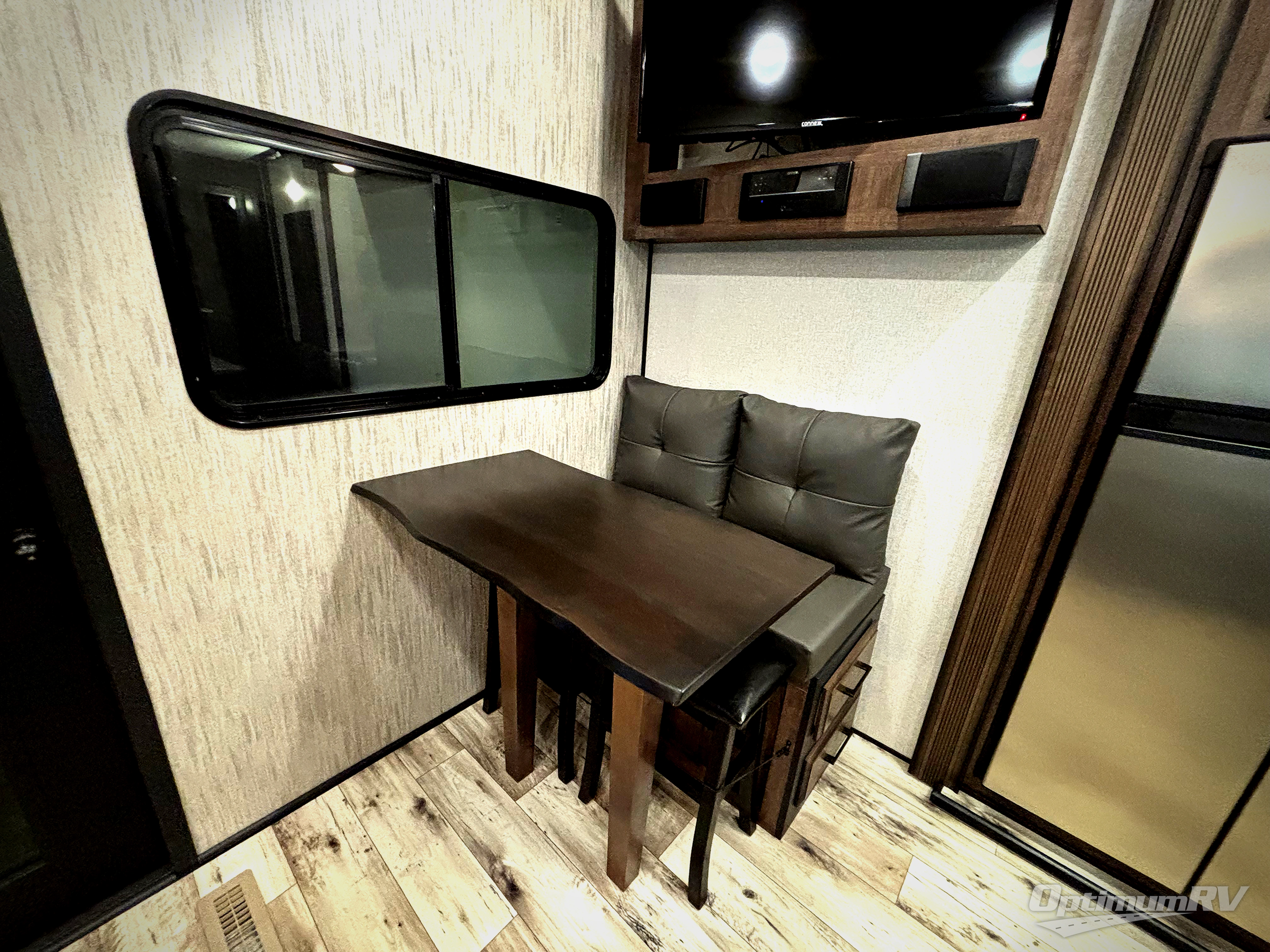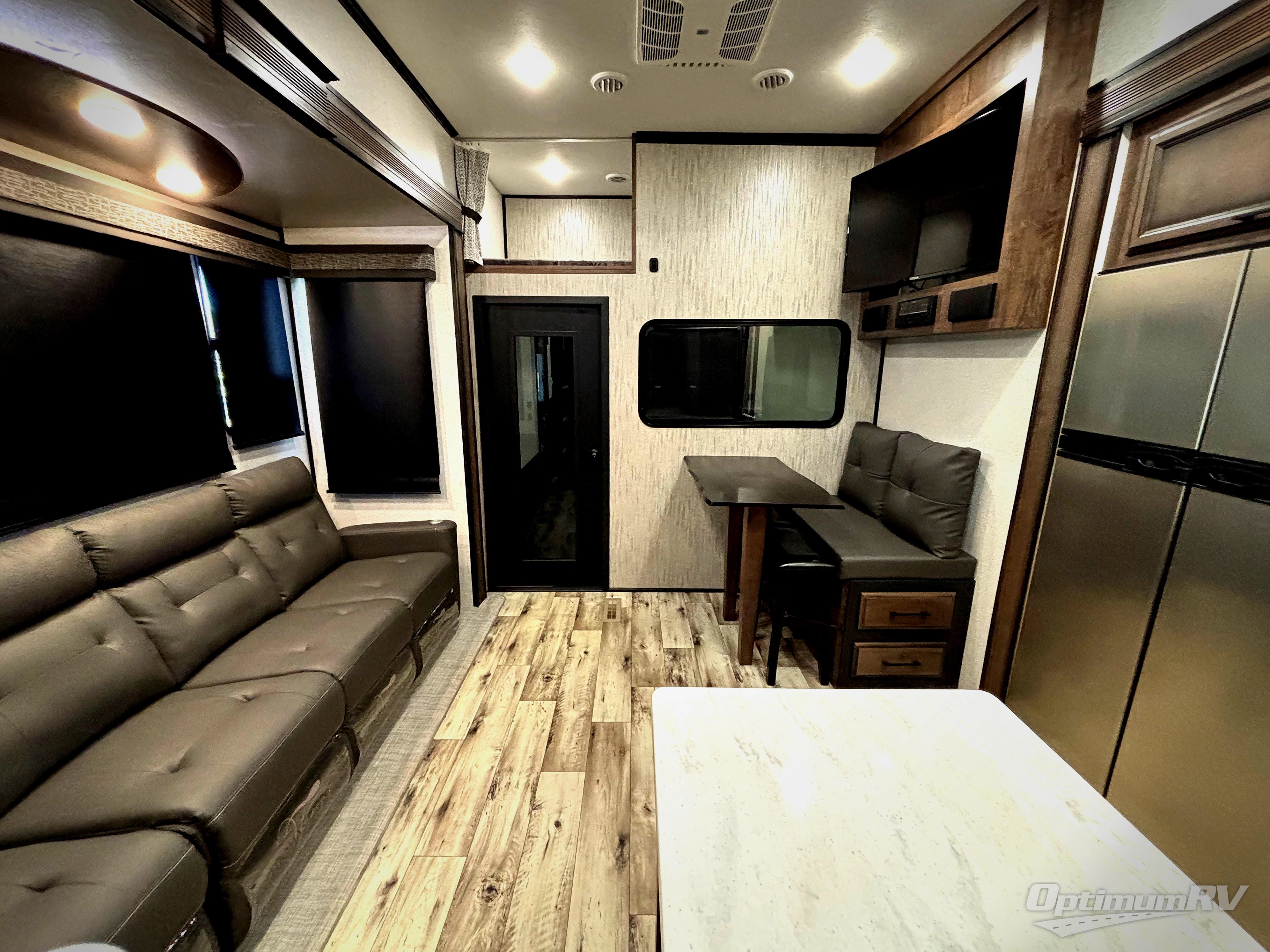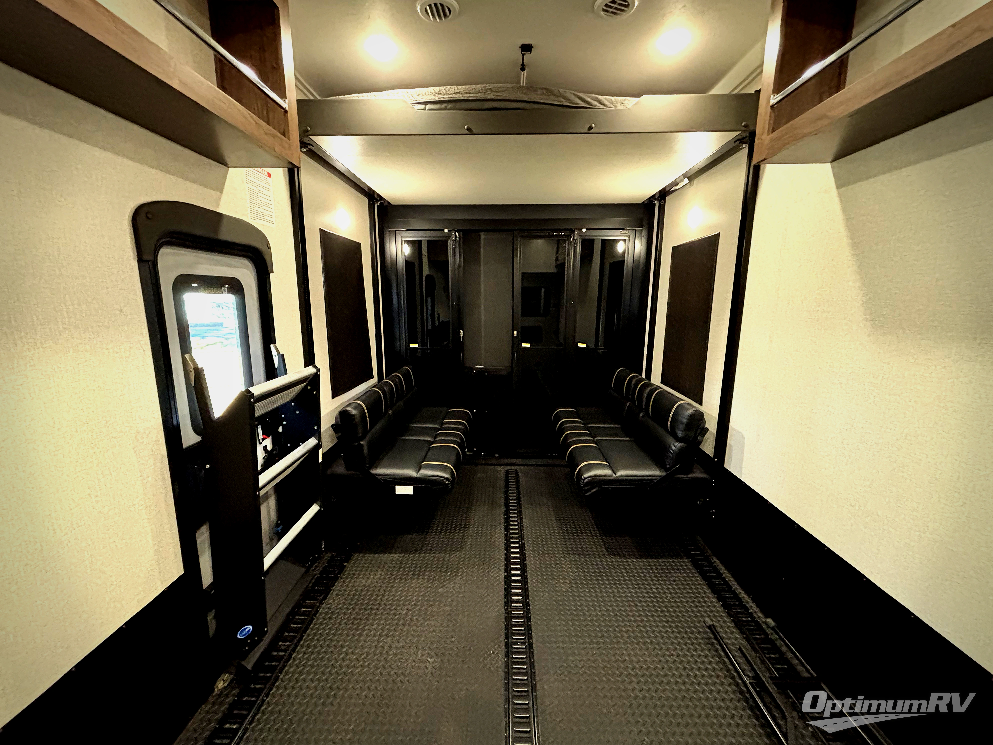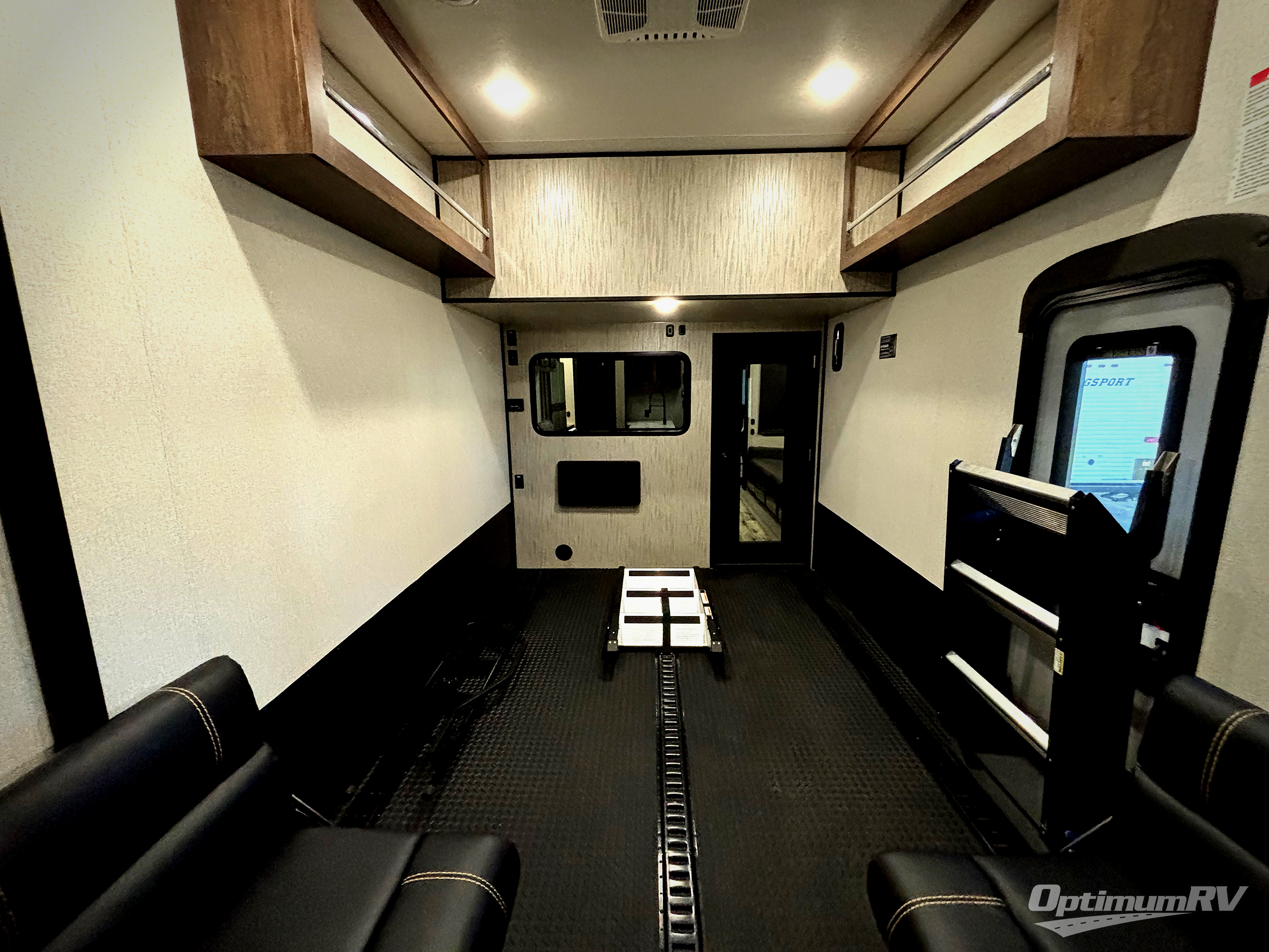 Spacious, luxurious and convenient are a few words you will be thinking each trip you take with this fifth wheel in tow! From the 15'9" separate garage to load up every toy you want, and the dual slides in the main living and kitchen area to the front master bedroom with a slide out wardrobe, there is lots of floor space. The garage also offers storage, access to the loft bed, plus the option to add a power bed with Sit and Sleep making this space a great area to relax after the rides. The 30 gallon fuel tank will keep the toys running, and the side man door is handy when you have the ramp cargo door closed. In the main living and kitchen area you can relax on the four-person super sofa with footrests, dine at the table with booth and chair seating, and watch the 43" Smart LED TV. The cook will love the counter peninsula to prepare and serve meals, and all the kitchen appliances in the slide out. Everyone can take turns getting cleaned up in the full bathroom, and you can retire to the master bedroom with a walk-around electric-tilt king bed or choose the queen option, and there is plenty of storage for your clothing plus a closet prepped for a washer/dryer option. You will find even more storage in the pass-through compartment along the exterior.