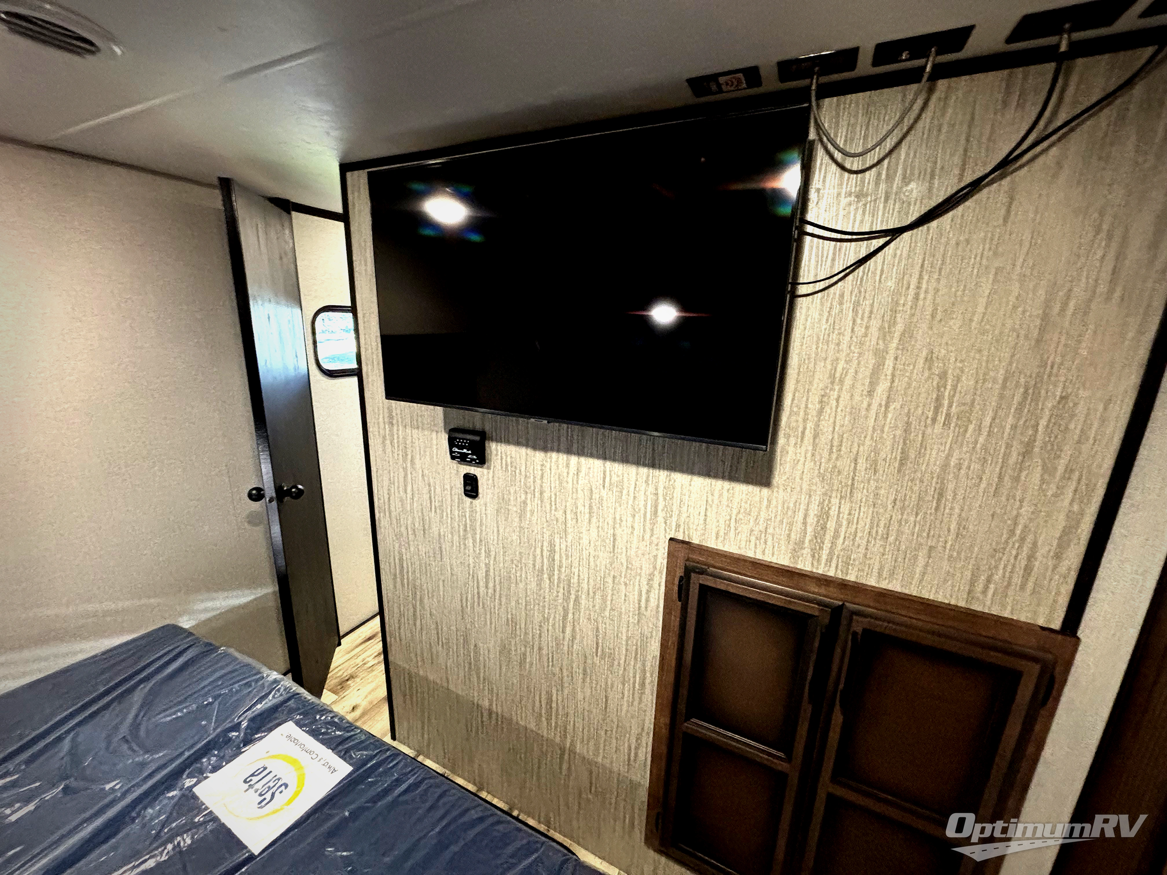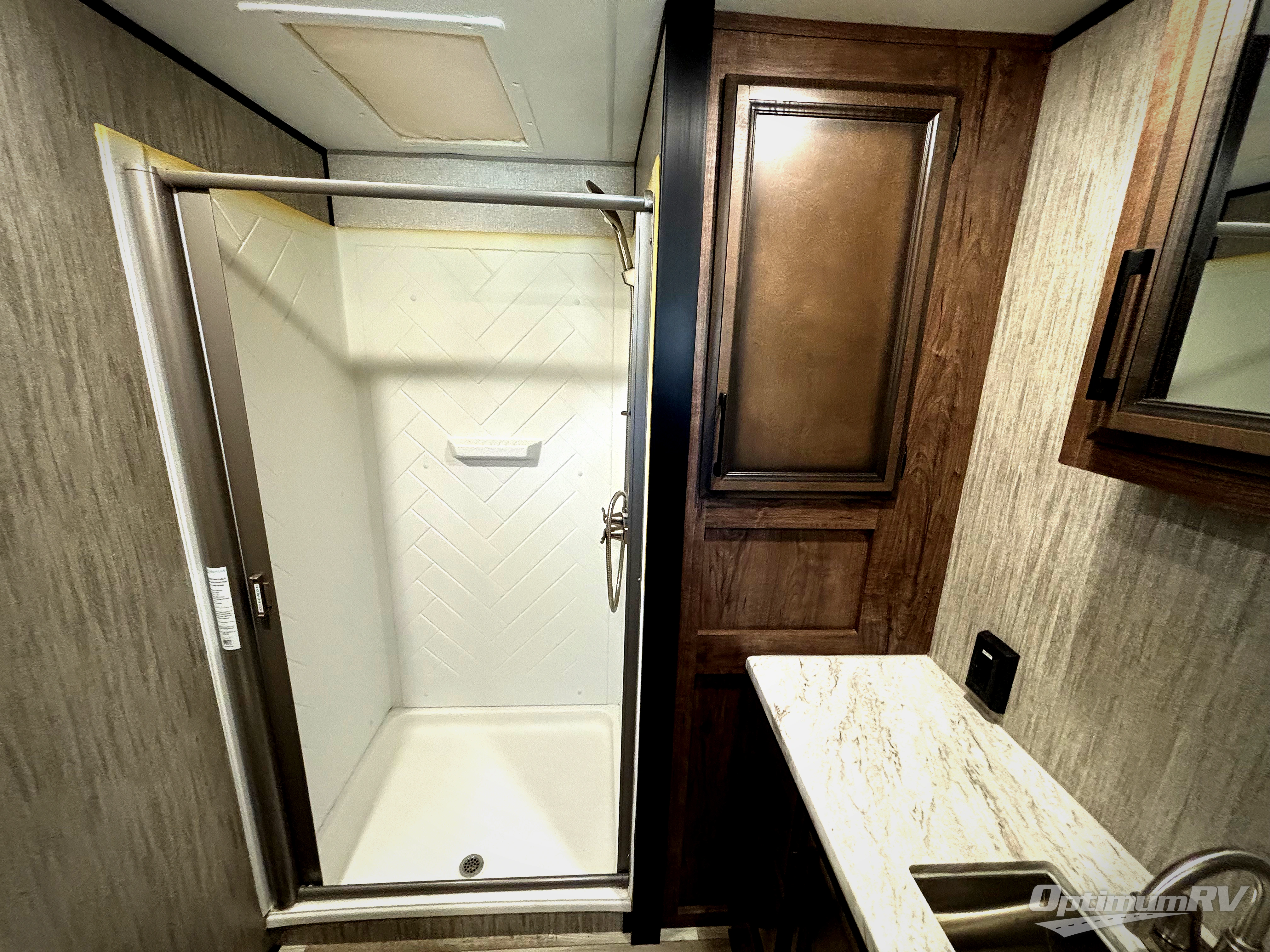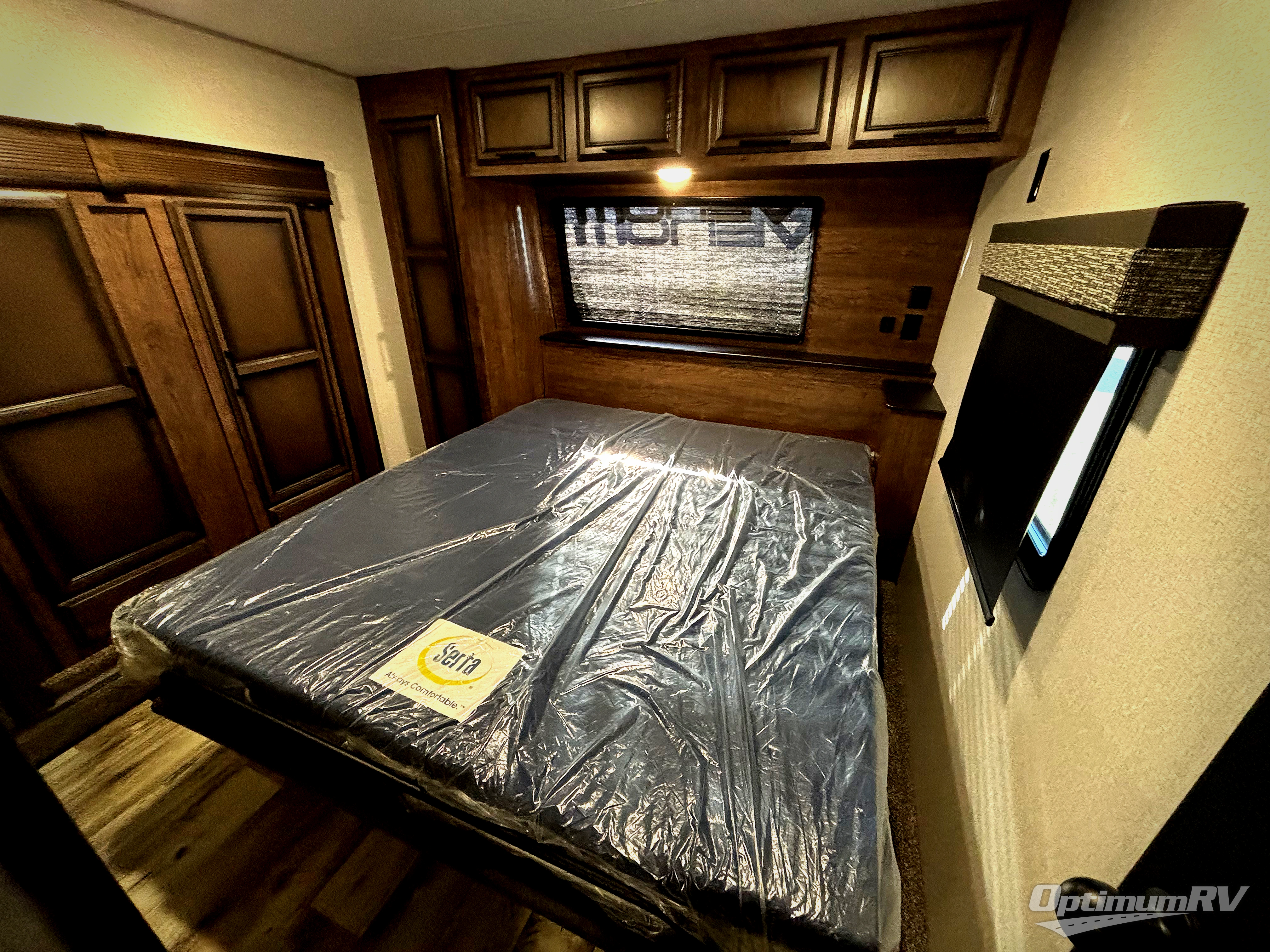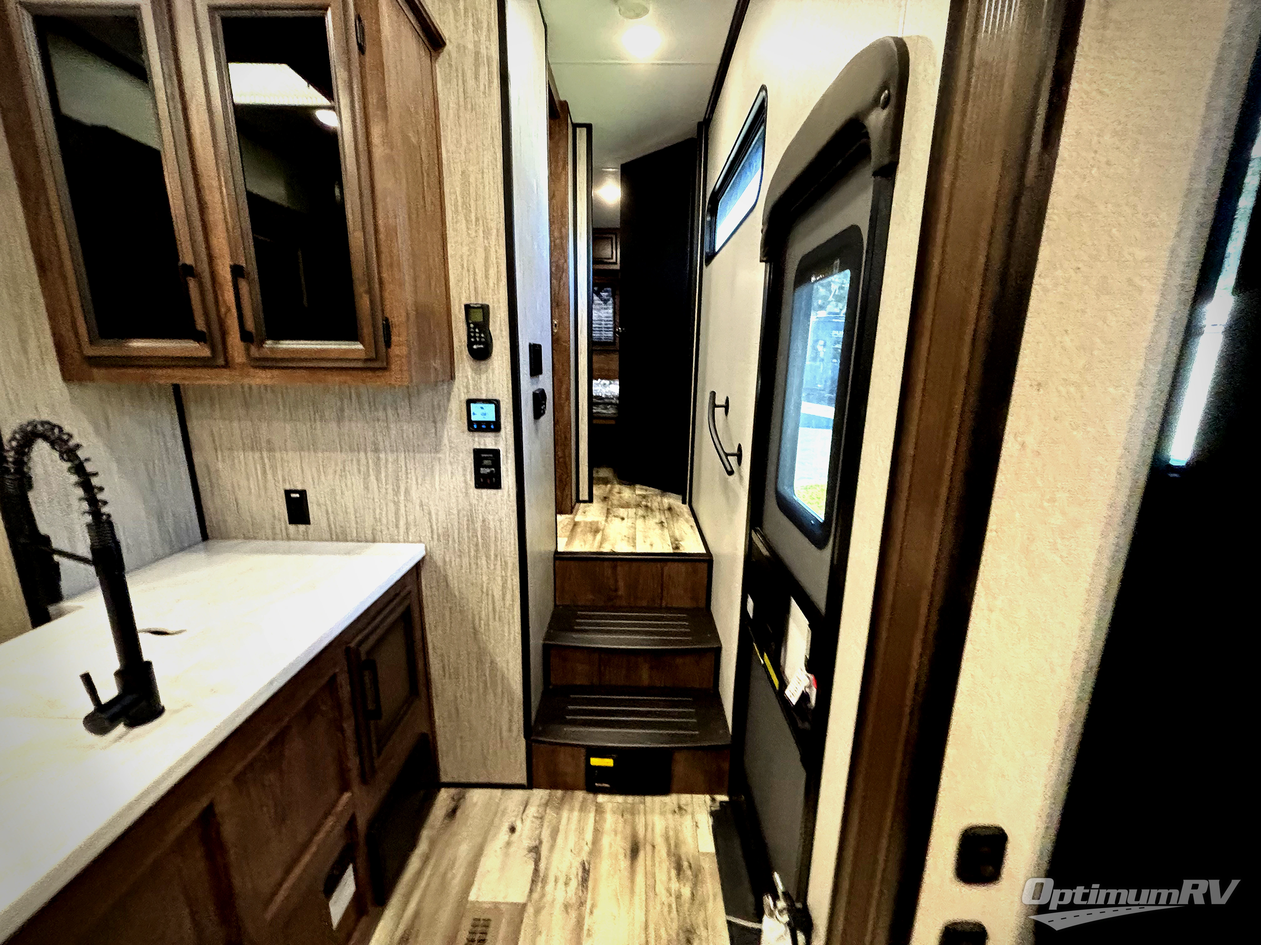 Spacious, luxurious and convenient are a few words you will be thinking each trip you take with this fifth wheel in tow! From the 15'9" separate garage to load up every toy you want, and the dual slides in the main living and kitchen area to the front master bedroom with a slide out wardrobe, there is lots of floor space. The garage also offers storage, access to the loft bed, plus the option to add a power bed with Sit and Sleep making this space a great area to relax after the rides. The 30 gallon fuel tank will keep the toys running, and the side man door is handy when you have the ramp cargo door closed. In the main living and kitchen area you can relax on the four-person super sofa with footrests, dine at the table with booth and chair seating, and watch the 43" Smart LED TV. The cook will love the counter peninsula to prepare and serve meals, and all the kitchen appliances in the slide out. Everyone can take turns getting cleaned up in the full bathroom, and you can retire to the master bedroom with a walk-around electric-tilt king bed or choose the queen option, and there is plenty of storage for your clothing plus a closet prepped for a washer/dryer option. You will find even more storage in the pass-through compartment along the exterior.