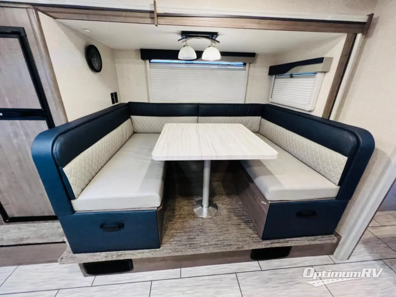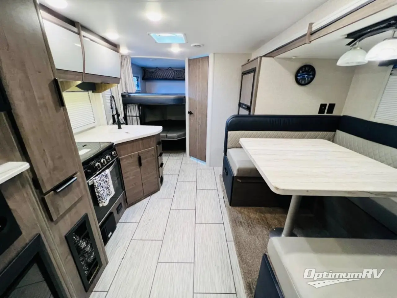 You can take the whole family to a new location with this Lance travel trailer! This trailer has space to sleep eight people with the help of the front queen bed, the U-shaped dinette, and the set of double-size bunks. You'll also have an easy time feeding everyone when you add the optional exterior kitchen because it will give you two kitchens to use. Now you can grill chicken outside and make quick meals inside in the stainless steel microwave. A large slide keeps the interior comfortable with enough space to walk from the front to the back, and the full bathroom is right next to the bunks for late-night bathroom breaks.