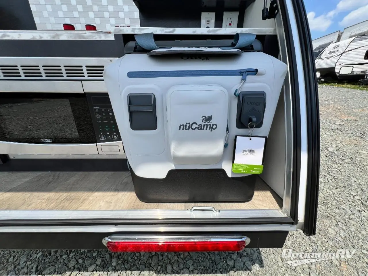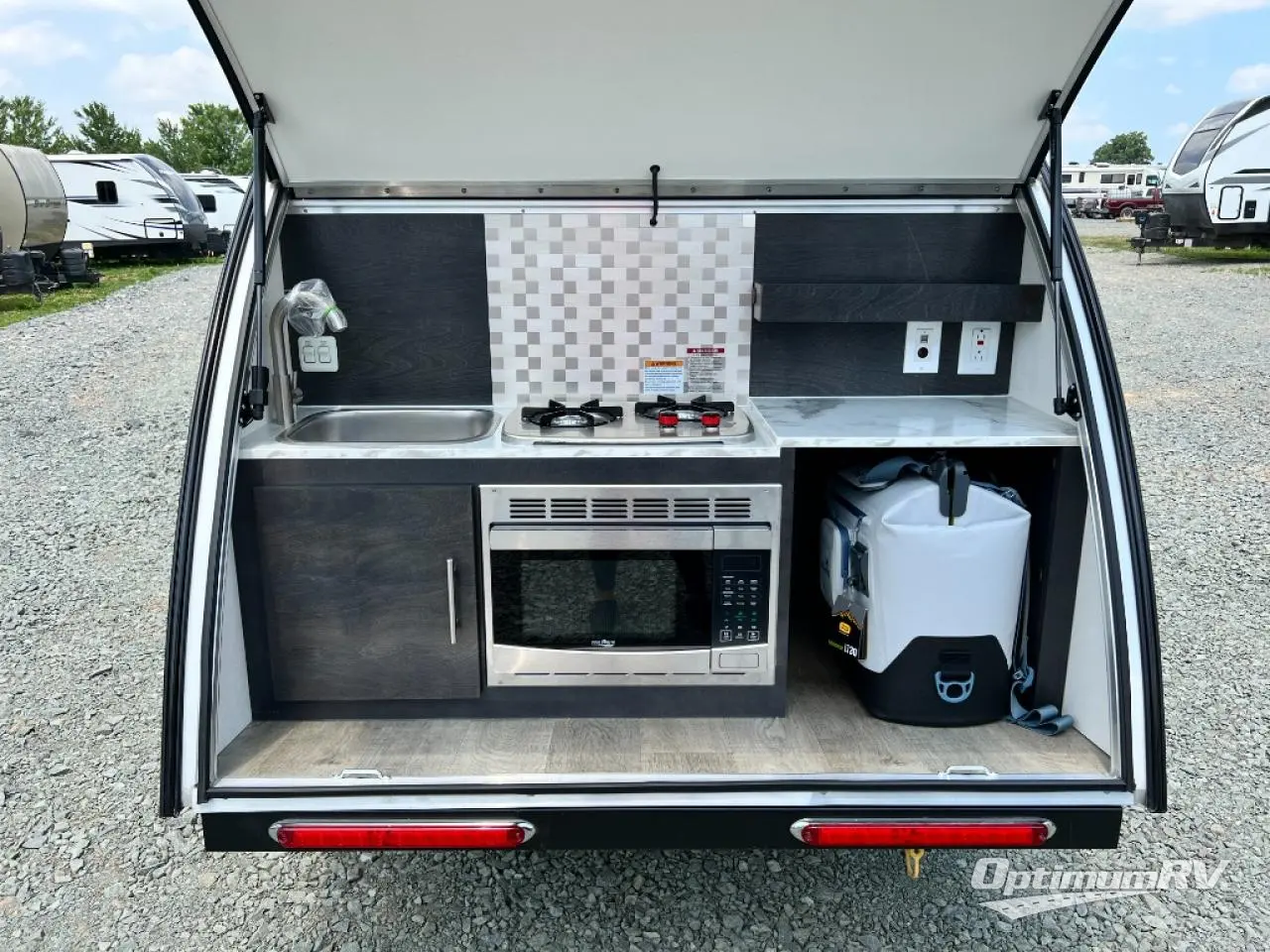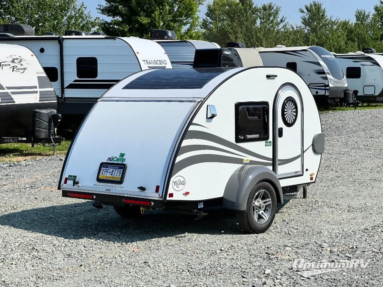 With any nuCamp RV TAG teardrop trailer, you can bring some of the comforts of home with you as you easily tow this lightweight trailer to the campgrounds or off-grid location thanks to the solar roof package. The outdoor kitchen includes a sink, stove, microwave, and removable cooler plus counter space. And the interior offers a composite floor, custom Ohio-Amish cabinetry, a Bluetooth speaker, sleeping accommodations, and a screen/shade system. Get ready for adventure in a TAG!