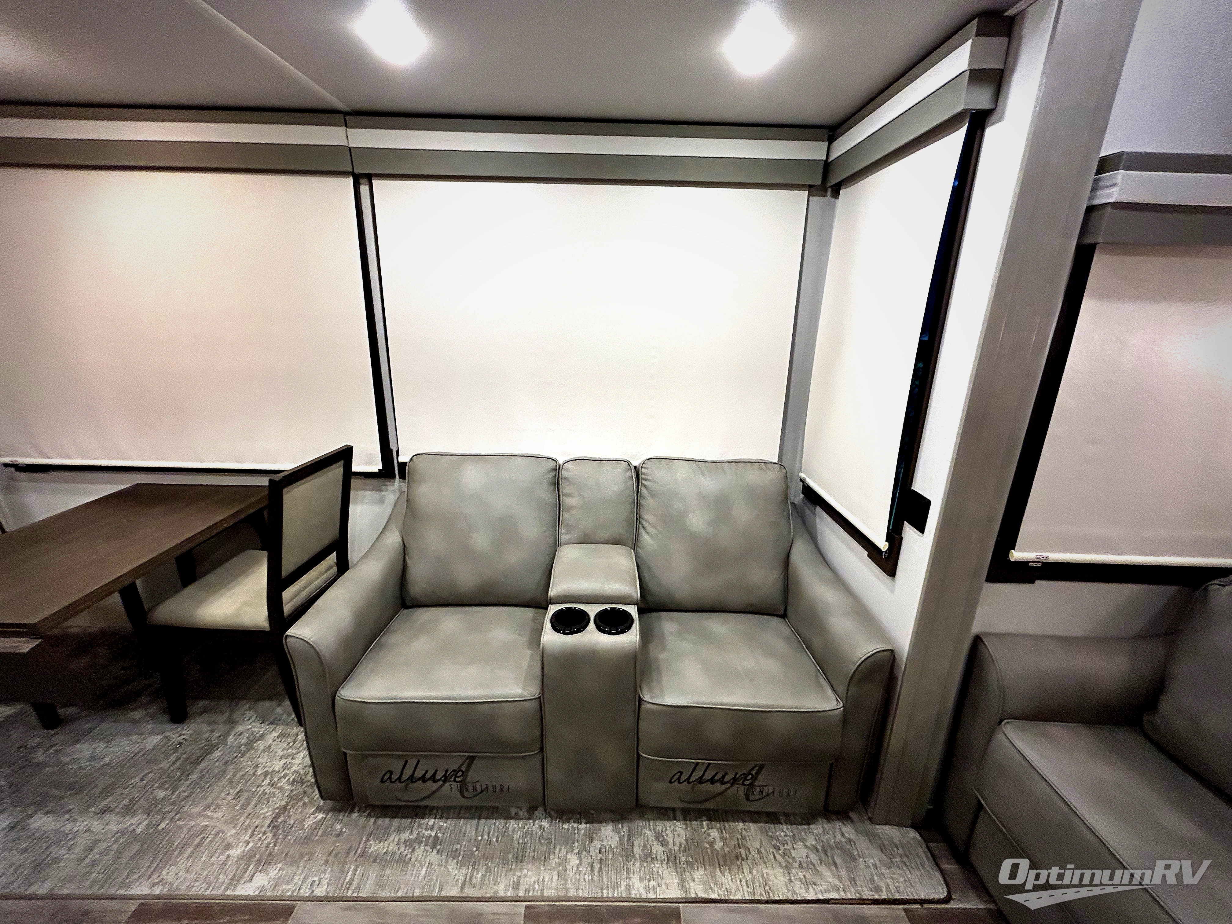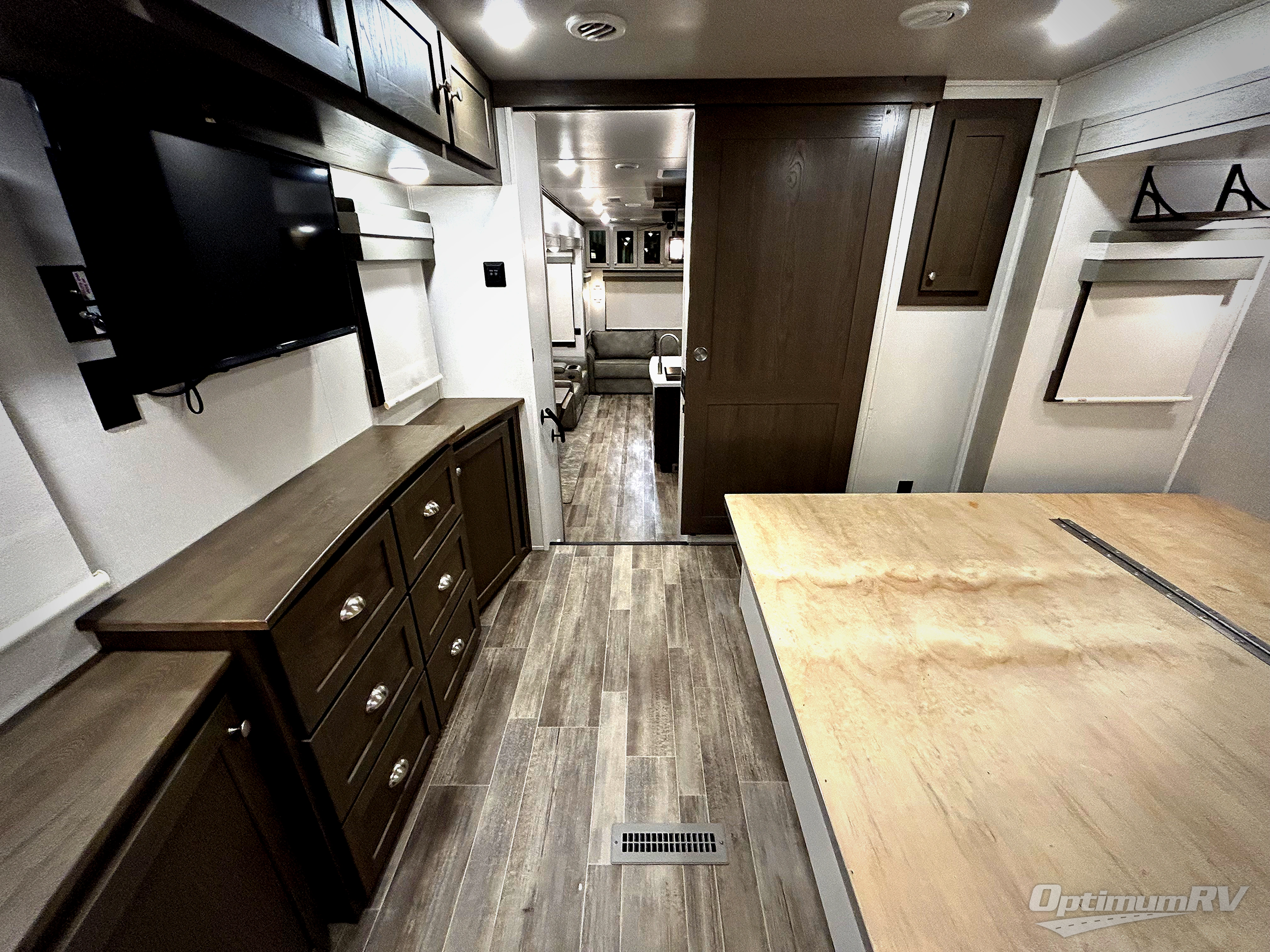 Everyone will stay clean with a bath and a half in this fifth wheel! The kitchen has a pantry big enough for everyone's favorite snacks, a four burner Insignia cooktop, and a kitchen island to prepare your best meals. You can have game night indoors at the table and chairs or set up a table and chairs underneath the two power awnings. The rear living area offers a comfortable place to watch the big game too with a 88" split tri-fold sofa and 65" power theater seating directly across from the entertainment center which has overhead cabinets with hidden storage, an electric fireplace, and a 50" TV with JBL sound system. Two can get ready at once in the front bathroom with the dual sink vanity and you can even add an optional washer and dryer!