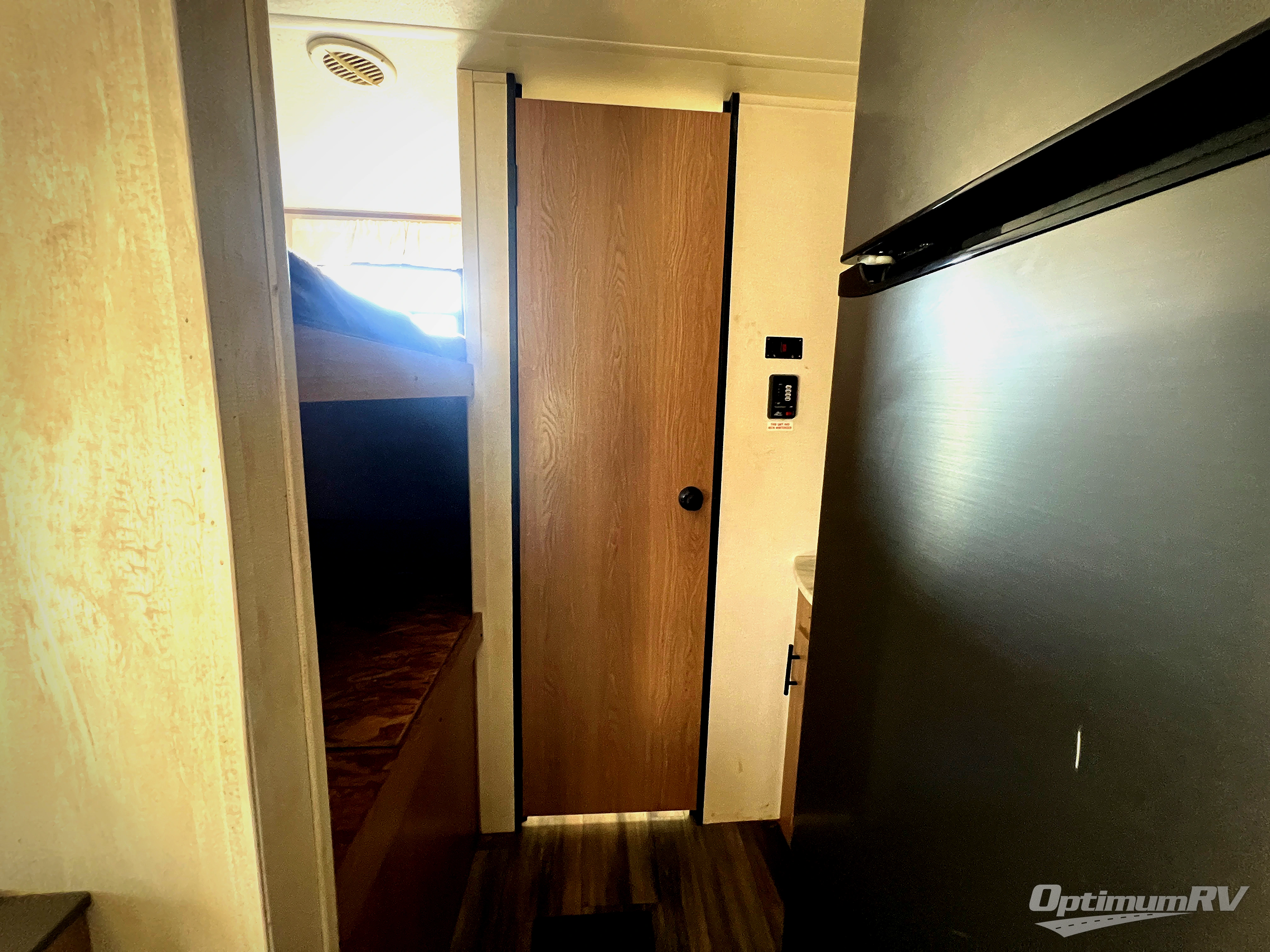 The cook is going to enjoy having choices for every meal, whether to use the full kitchen amenities inside or the outdoor kitchen while visiting with others relaxing under the 13' power awning. With the inclusion of a walk-around queen bed in the front bedroom, plus the sofa and booth dinette in the combined kitchen and living area, and the double-size bunks next to the bathroom sink and private toilet and toilet room, there is plenty of room to sleep eight or nine people each night. And the power awnings plus outdoor speakers give you an additional living area for everyone.