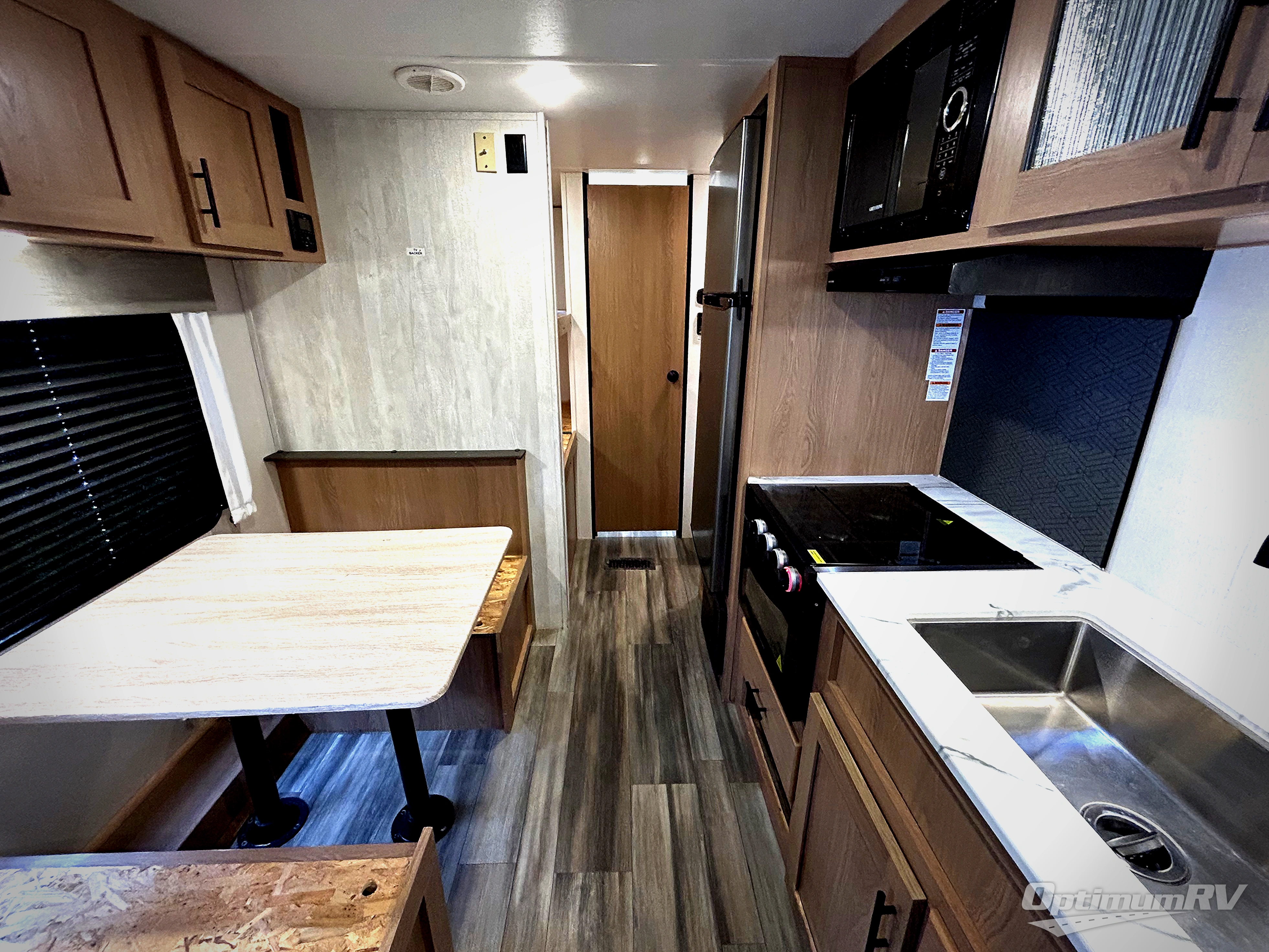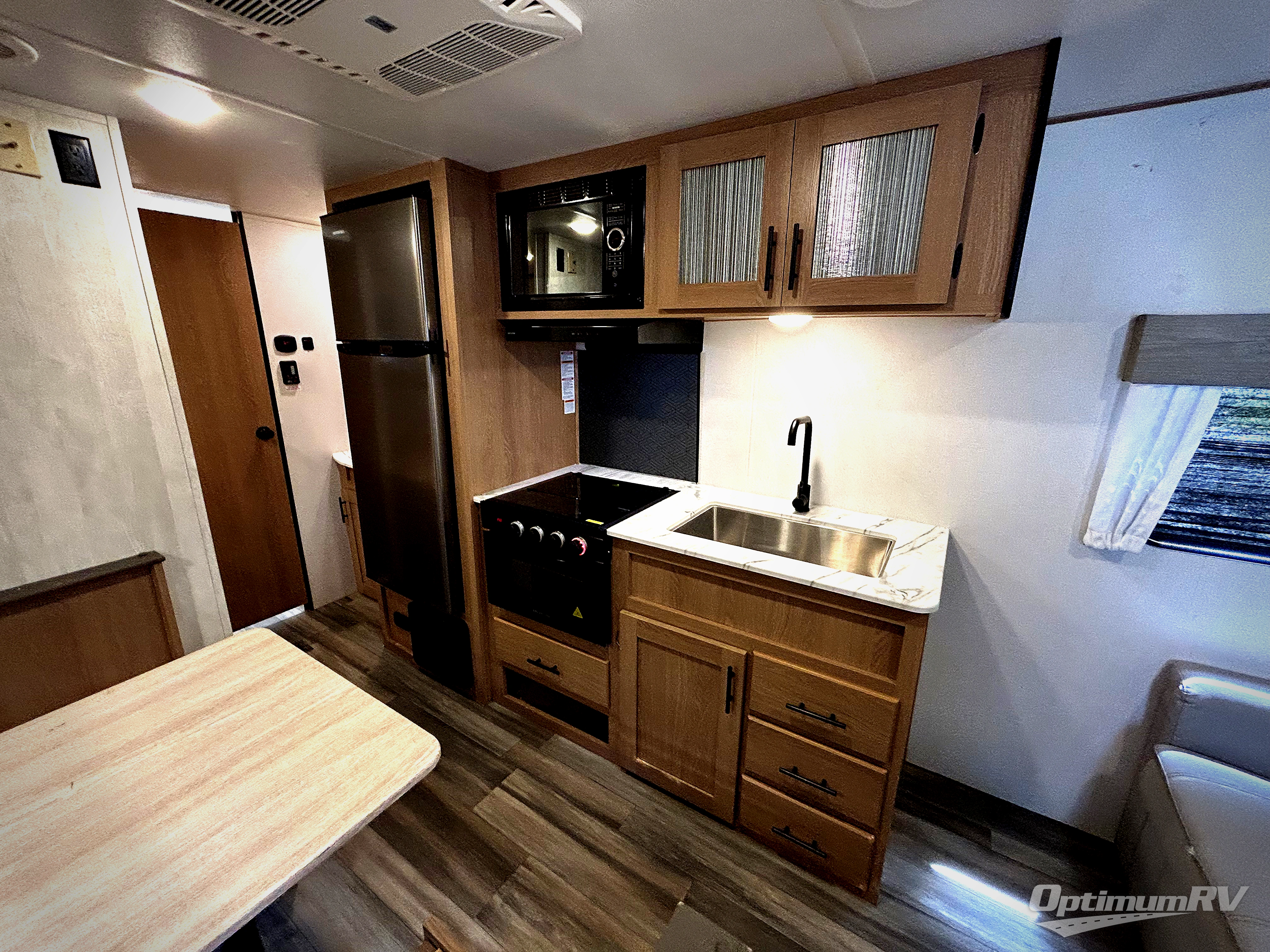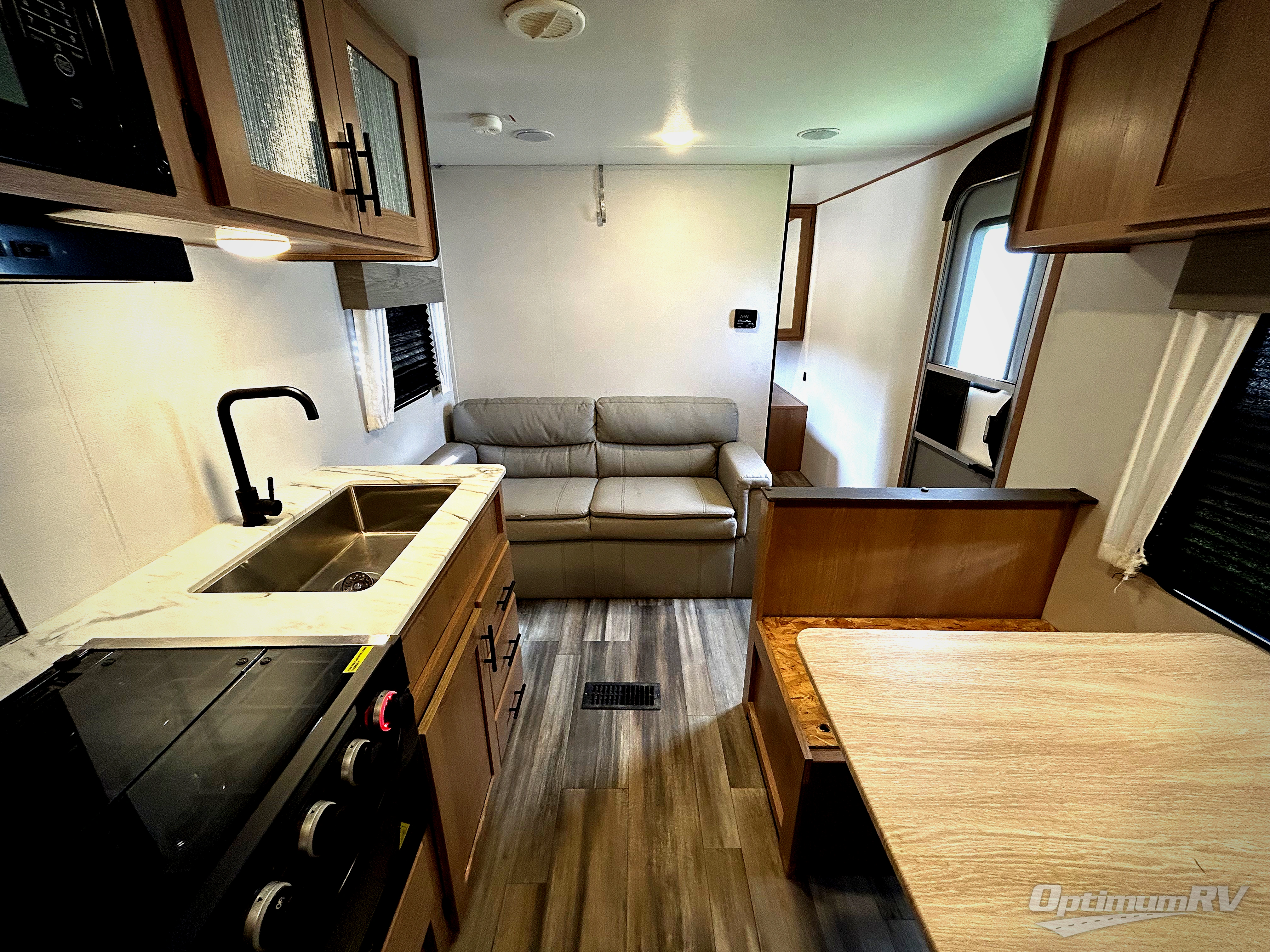 The cook is going to enjoy having choices for every meal, whether to use the full kitchen amenities inside or the outdoor kitchen while visiting with others relaxing under the 13' power awning. With the inclusion of a walk-around queen bed in the front bedroom, plus the sofa and booth dinette in the combined kitchen and living area, and the double-size bunks next to the bathroom sink and private toilet and toilet room, there is plenty of room to sleep eight or nine people each night. And the power awnings plus outdoor speakers give you an additional living area for everyone.