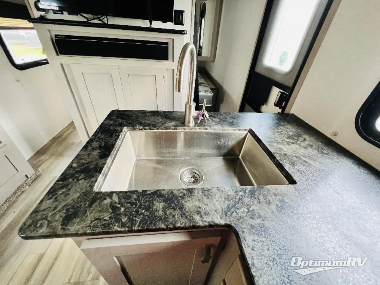 Head to the campsite with this Tracer in tow to enjoy comforts inside after you explore outside! Beginning with the front bedroom which includes a queen bed with a partial wall for separation to the U-shaped dinette slide that offers windows and plenty of seating and dining space, you might complain every time you have to return home. The well-equipped kitchen offers everything you need, and the pantry gives you more storage, and the farm-style sink makes cleaning up easy. You can also make meals using the outside kitchen while others relax under the 19' power awning.
