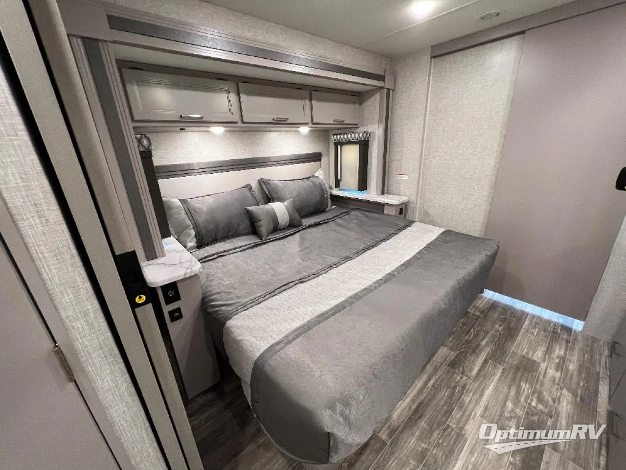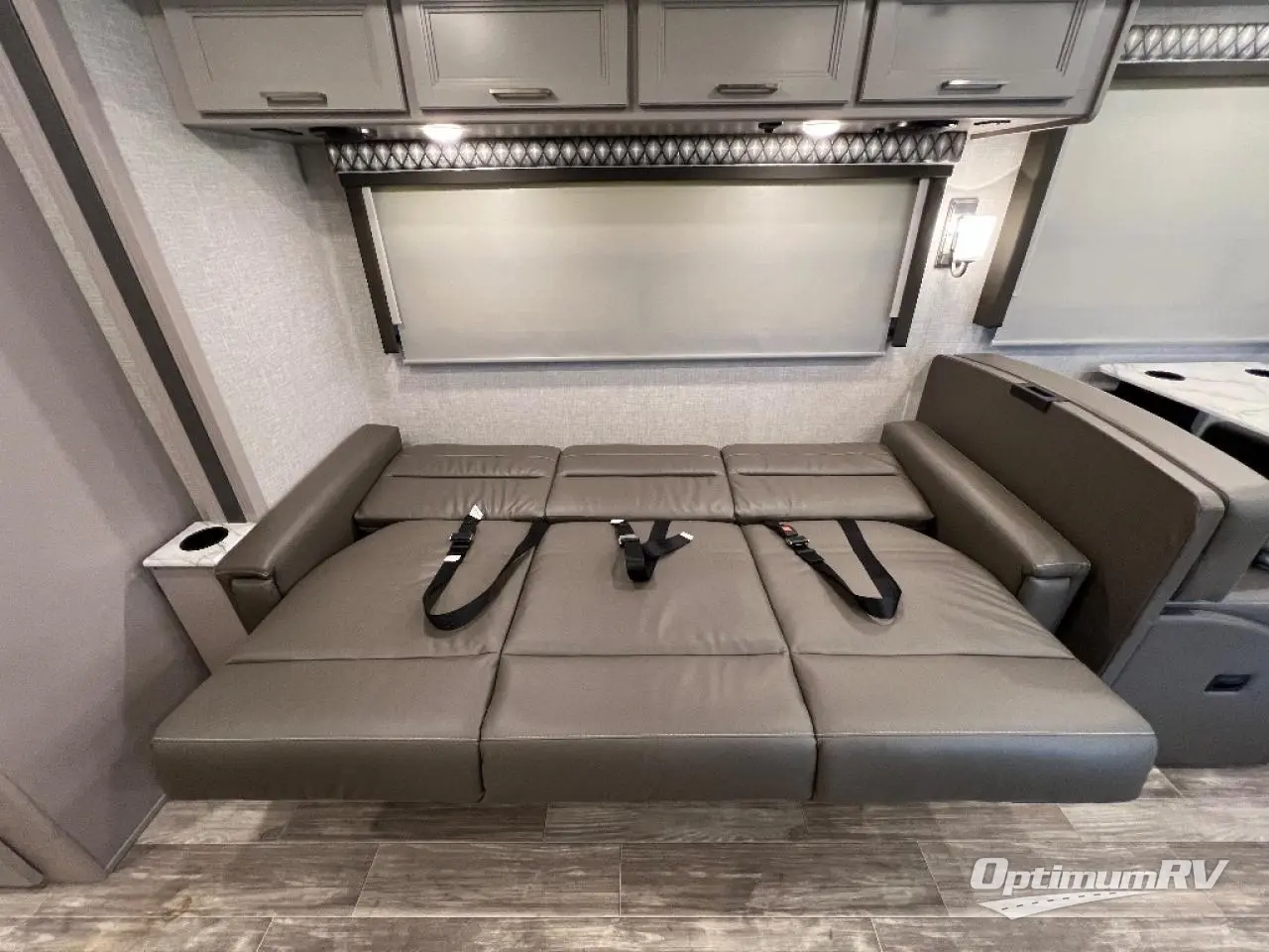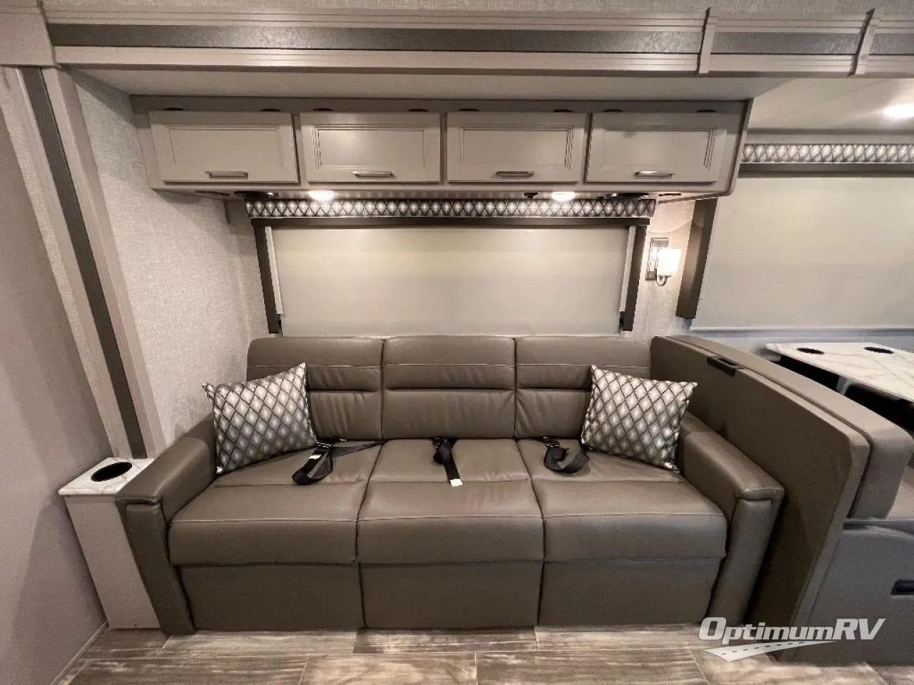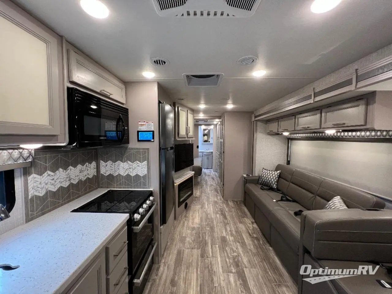 With any Hurricane Class A gas motorhome by Thor Motor Coach you will appreciate solid construction materials, like the welded tubular steel floor and the Vacu-Bond laminated roof, walls, and floor with block foam insulation. Each model sits on a Ford F-53 chassis with a 7.3L Triton V8 engine for power you can feel, plus there is an 8,000 lb. trailer hitch with a 7-pin round connector to pull your car along. The Rapid Camp+ multiplex system with Bluetooth will allow you to easily set up camp from the convenient 7" touchscreen provided, and the Winegard ConnecT WiFi extender +4G will let you catch up on work if needed. The Hurricane includes pressed laminated countertops inside, as well as residential vinyl flooring, decorative glass and tile backsplash in the kitchen, and many more at-home comforts.