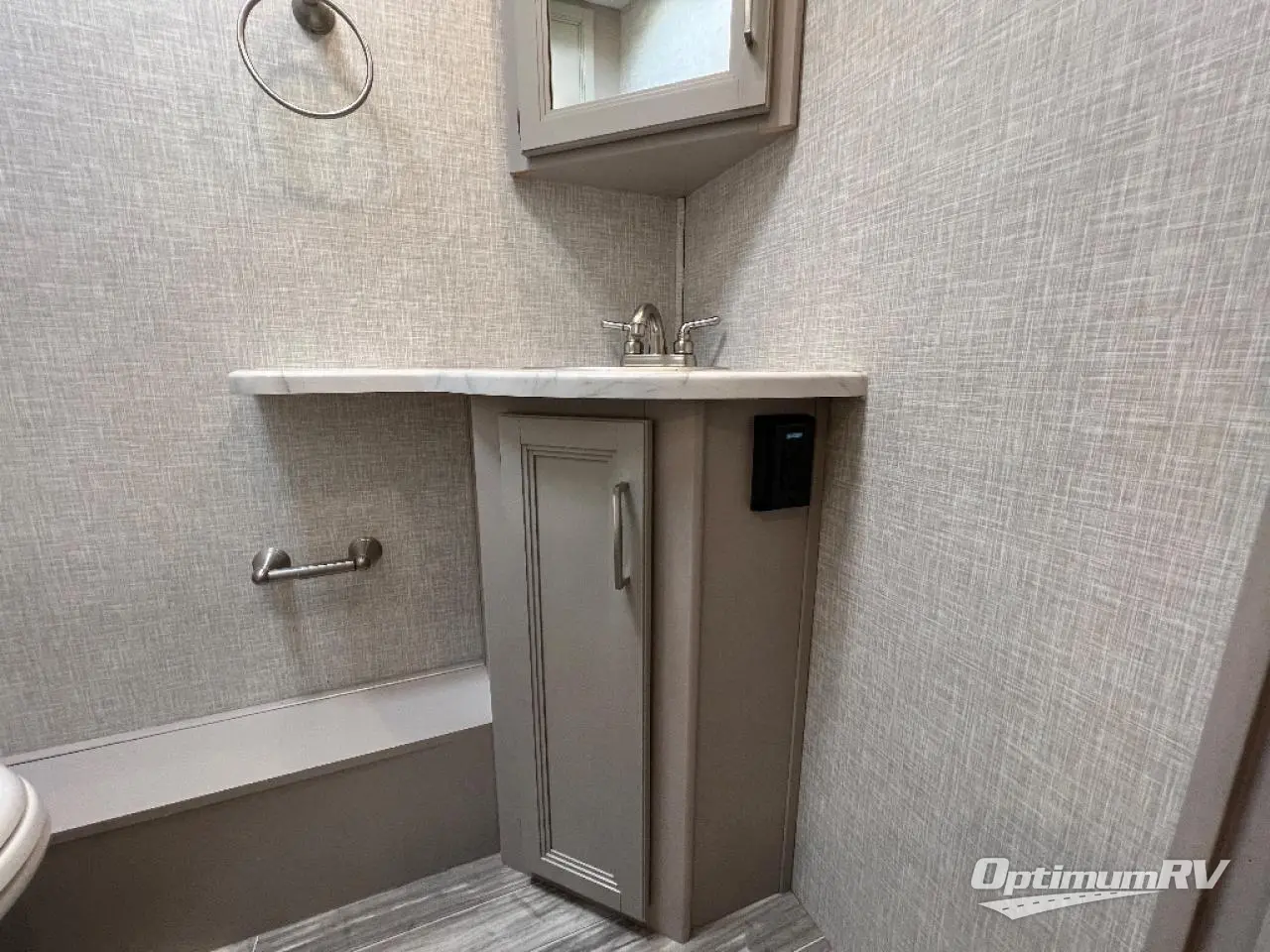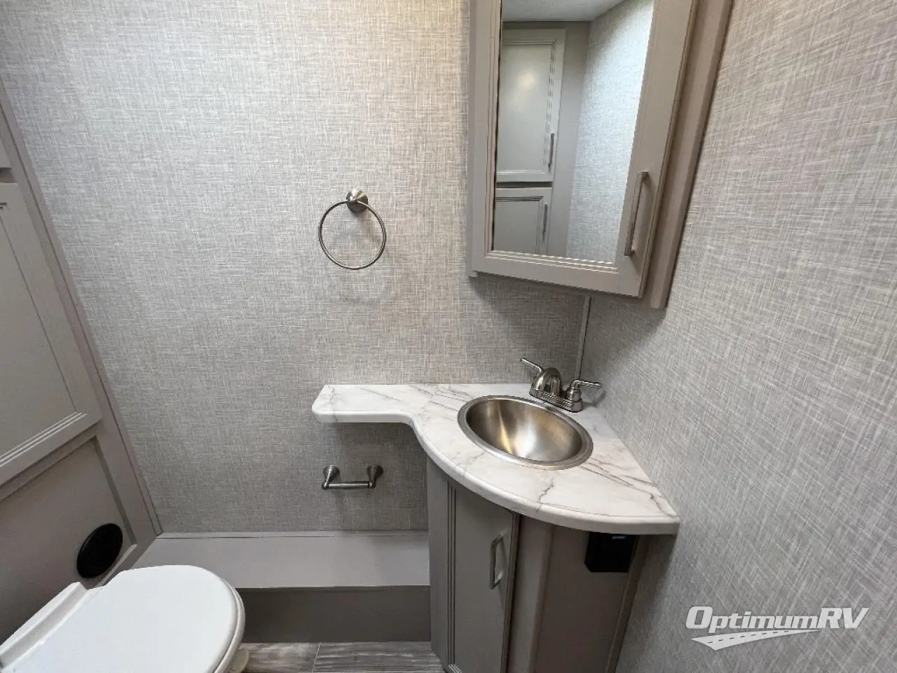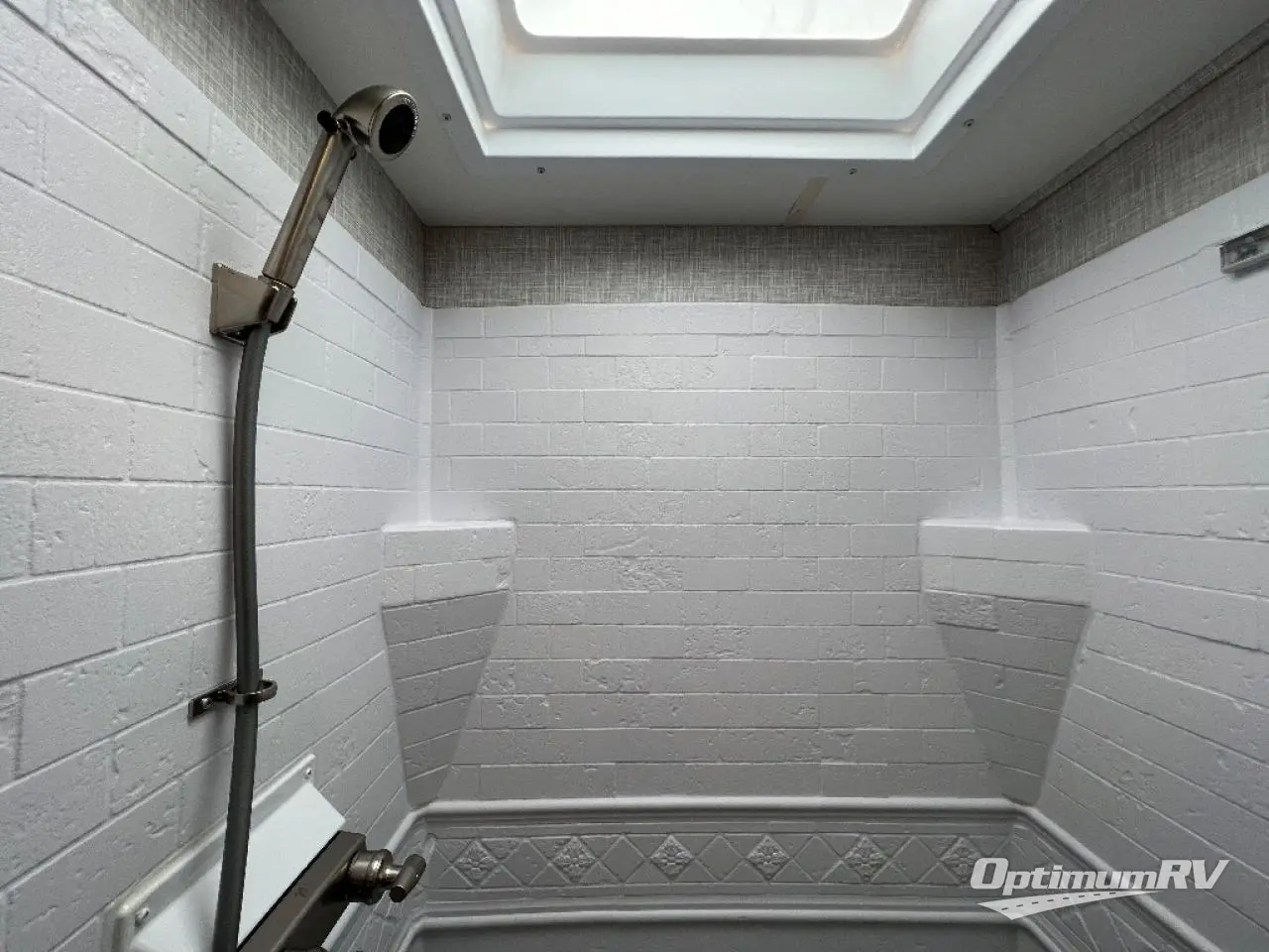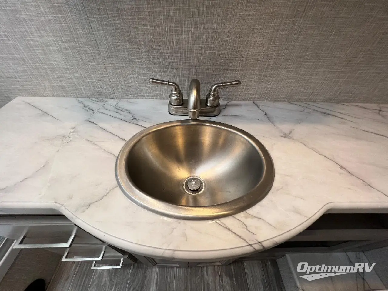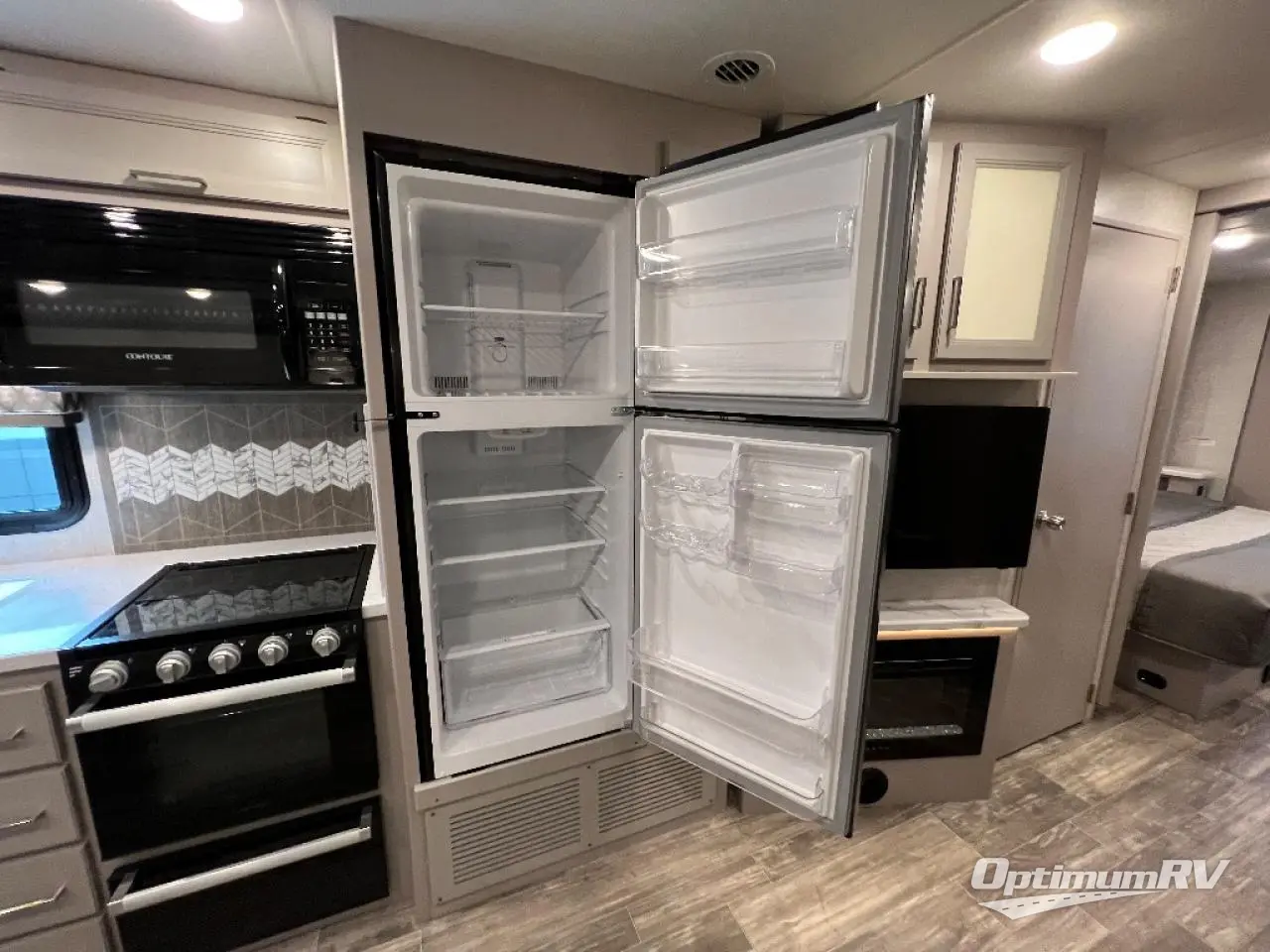 A bath and a half in this coach make it perfect for trips with friends and family. You will have tons of space provided by the two slide outs, plus a sleeping capacity of six to seven people each night. The expanding sofa bed has a great view of the 39" TV, and the Dream Dinette will be great for meals times and game night. Whip up a hearty meal on the three burner gas cooktop, or use the convenient over-the-range microwave oven. There is also a 12 cu. ft. residential refrigerator and a pantry for food storage. You'll be very pleased with the master bedroom that includes a king bed, a 32" TV, and a closet to keep your clothes wrinkle-free. There is even a second closet with stackable washer and dryer prep to make life on the road easier than ever.