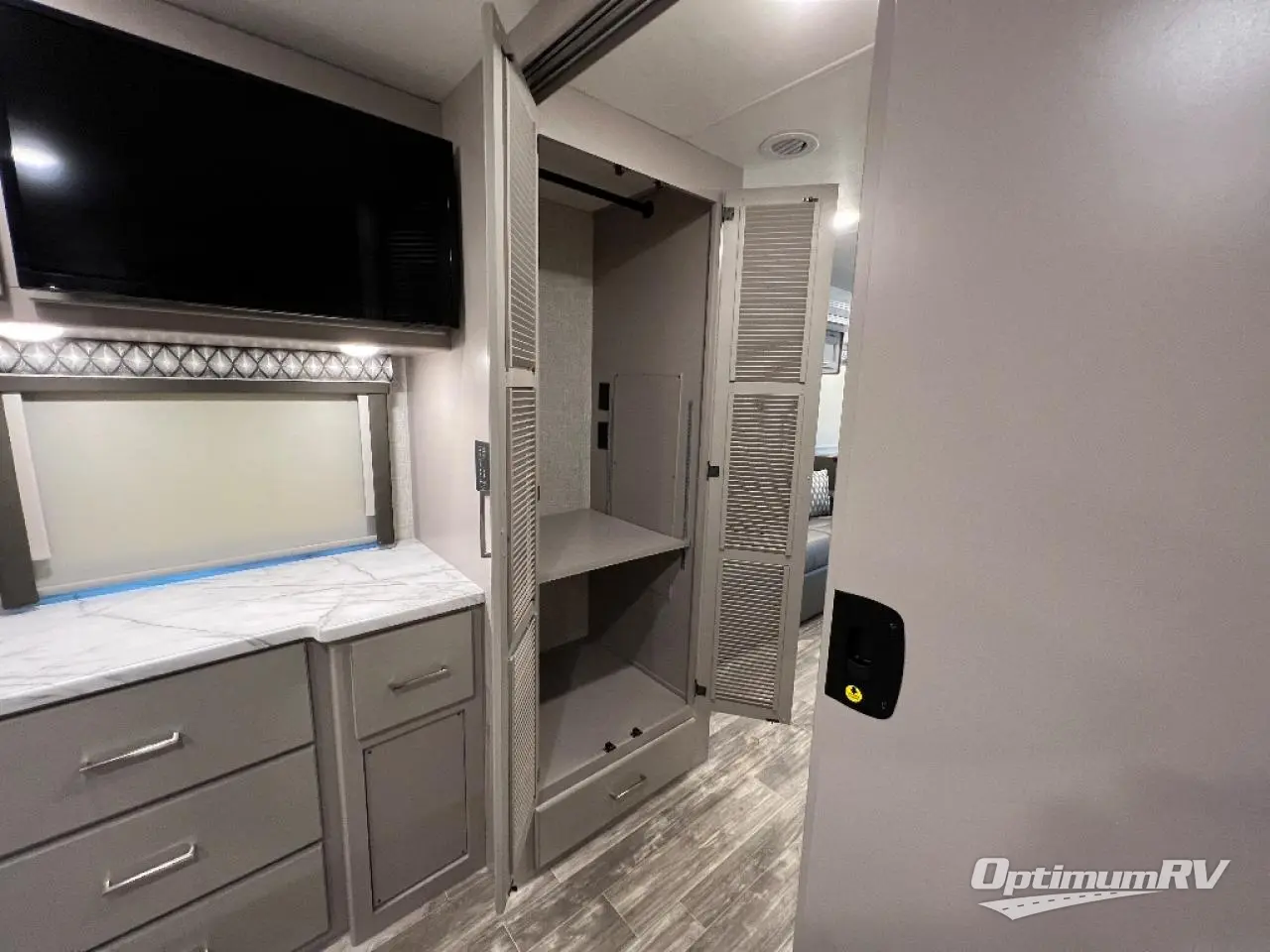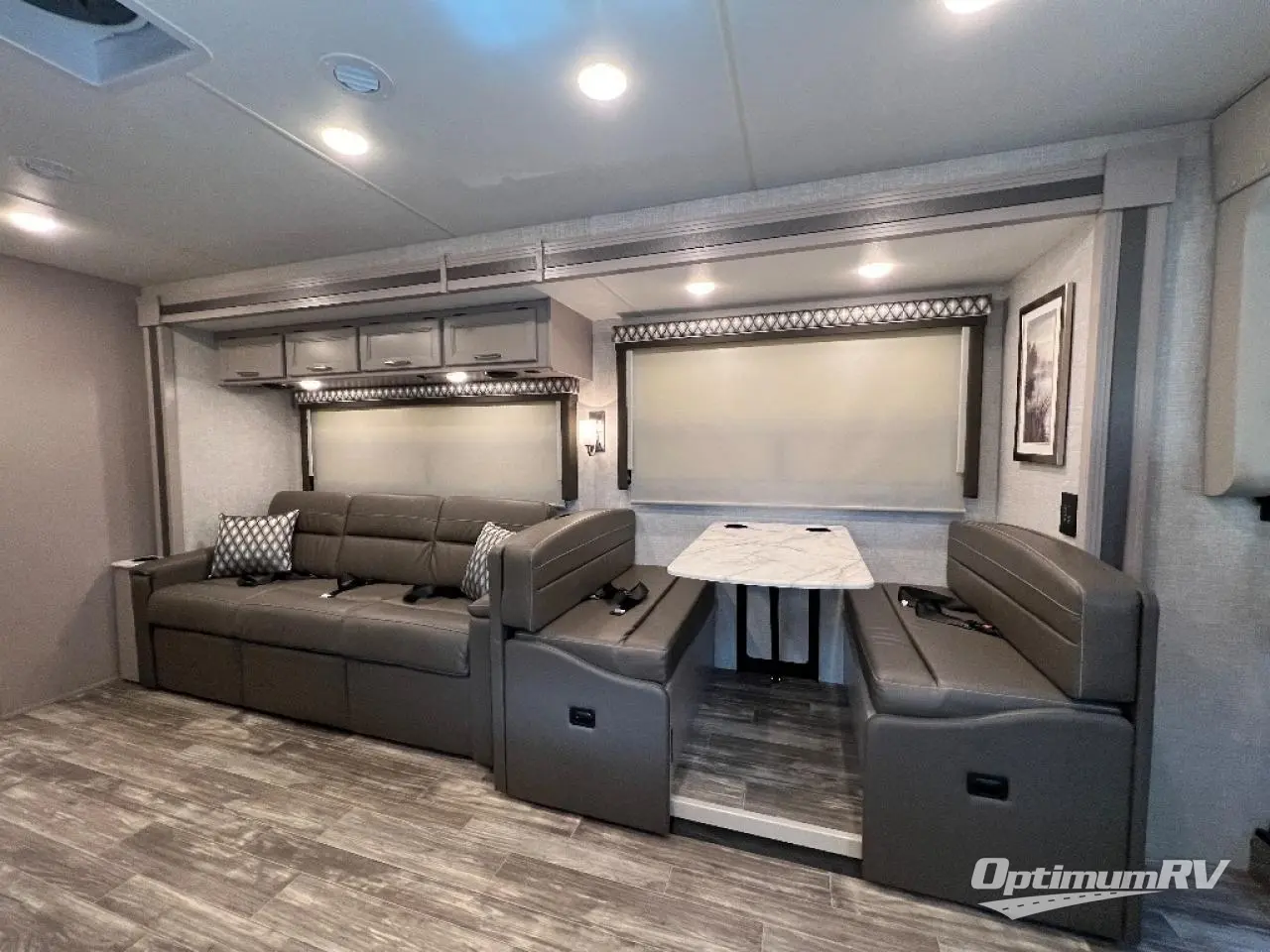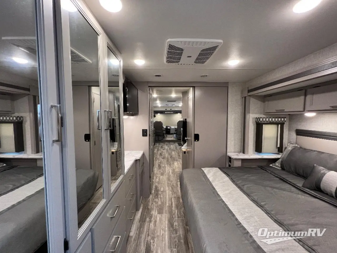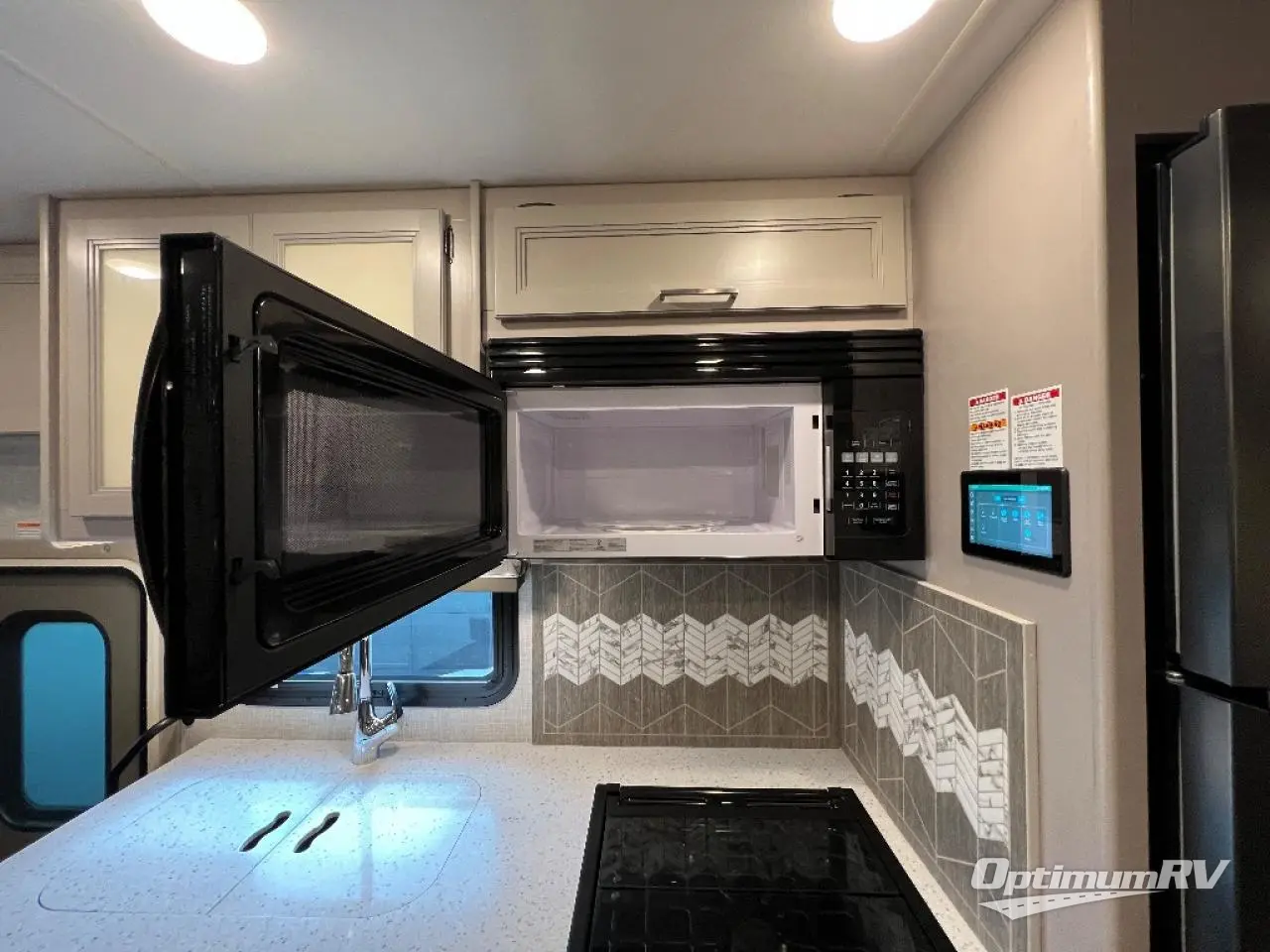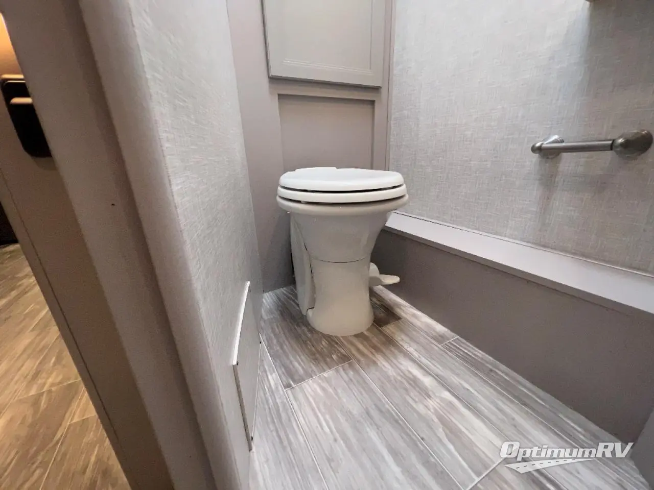 A bath and a half in this coach make it perfect for trips with friends and family. You will have tons of space provided by the two slide outs, plus a sleeping capacity of six to seven people each night. The expanding sofa bed has a great view of the 39" TV, and the Dream Dinette will be great for meals times and game night. Whip up a hearty meal on the three burner gas cooktop, or use the convenient over-the-range microwave oven. There is also a 12 cu. ft. residential refrigerator and a pantry for food storage. You'll be very pleased with the master bedroom that includes a king bed, a 32" TV, and a closet to keep your clothes wrinkle-free. There is even a second closet with stackable washer and dryer prep to make life on the road easier than ever.
