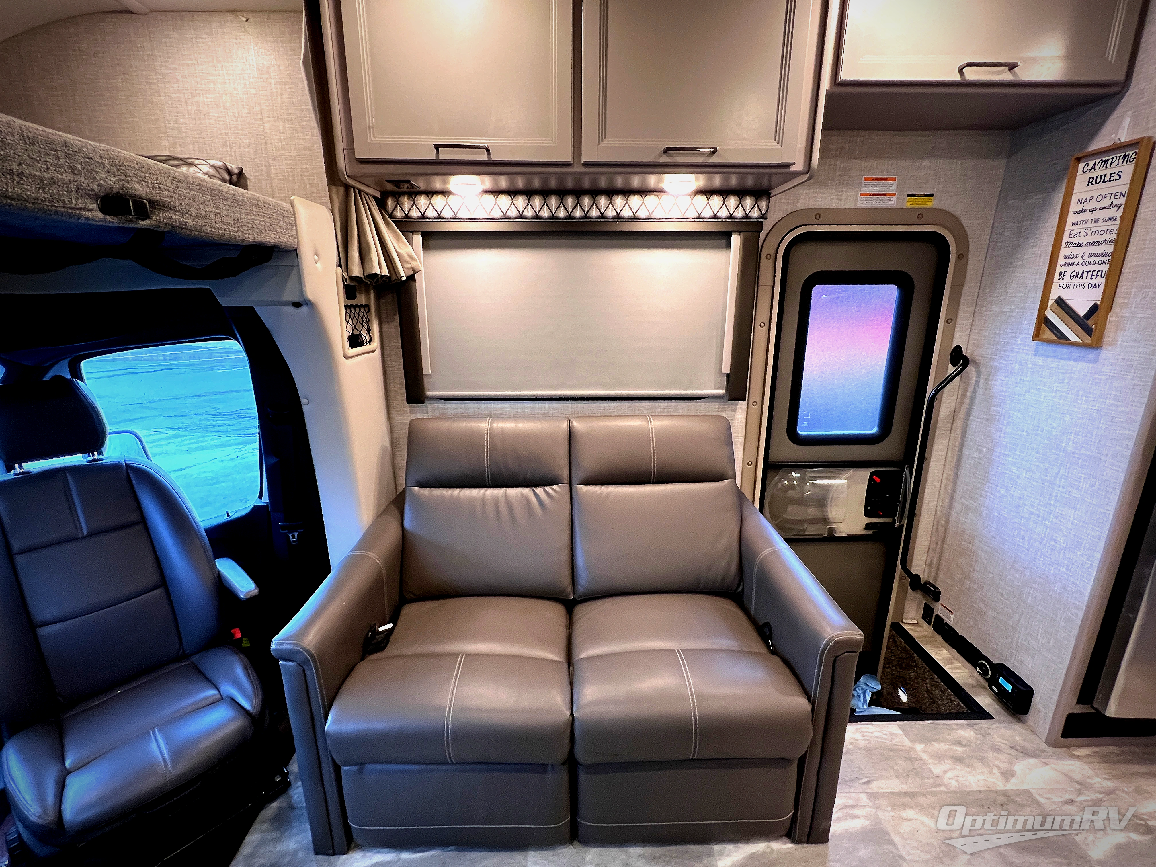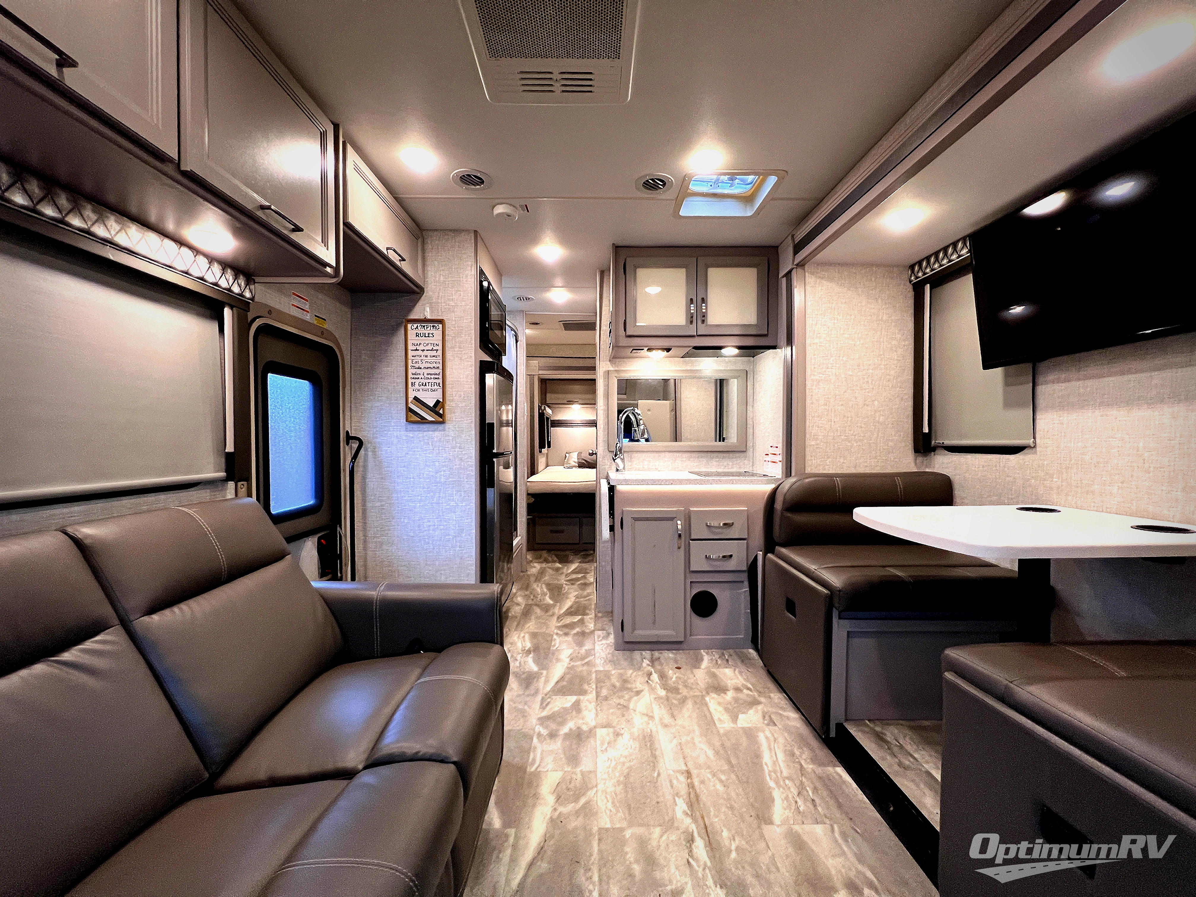 It won't take long to feel right at home in this cozy motorhome. Once you arrive at your destination, you can swivel your captain's seats around to the living area, and enjoy a cold drink with the removable cockpit table. There is also theater seating with footrests and a 39" TV in perfect view so you can watch your favorite movies. The chef of your group can prepare lunch on the two burner gas cooktop, while someone else is preparing a fresh salad on the flip-up countertop. This model includes a booth dinette to dine at each day, or you can take your plate outdoors to sit under the 14' power awning. The private toilet and sink with the shower across the hall allow two people to fresh up at once, and this model includes a rear bedroom you are sure to love. Here, you can rest soundly on the full-size bed, watch a late-night movie on 32" bedroom TV, and store your clothes in the large closet!