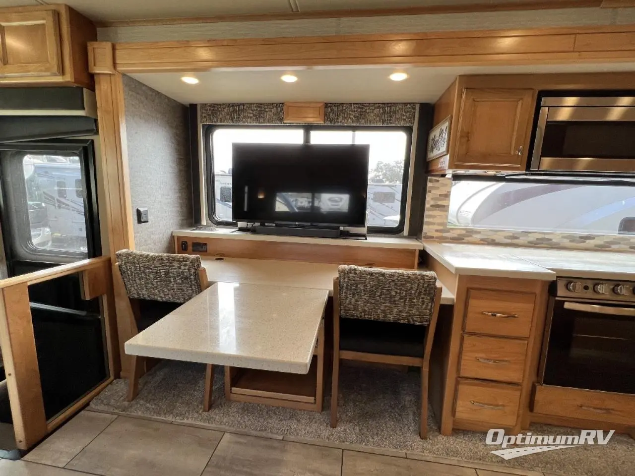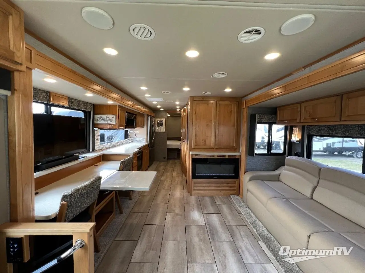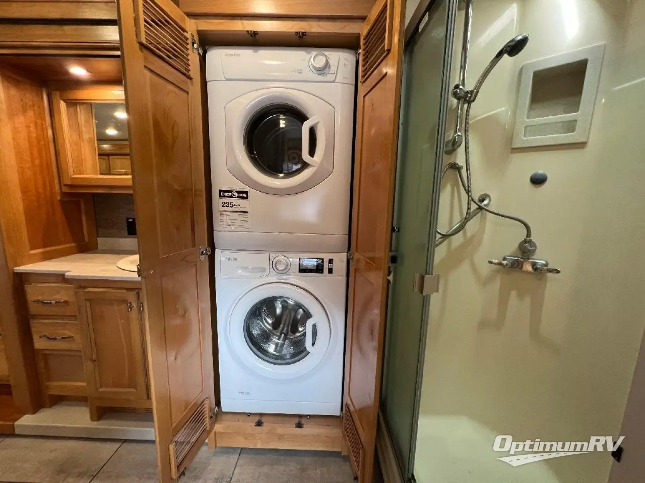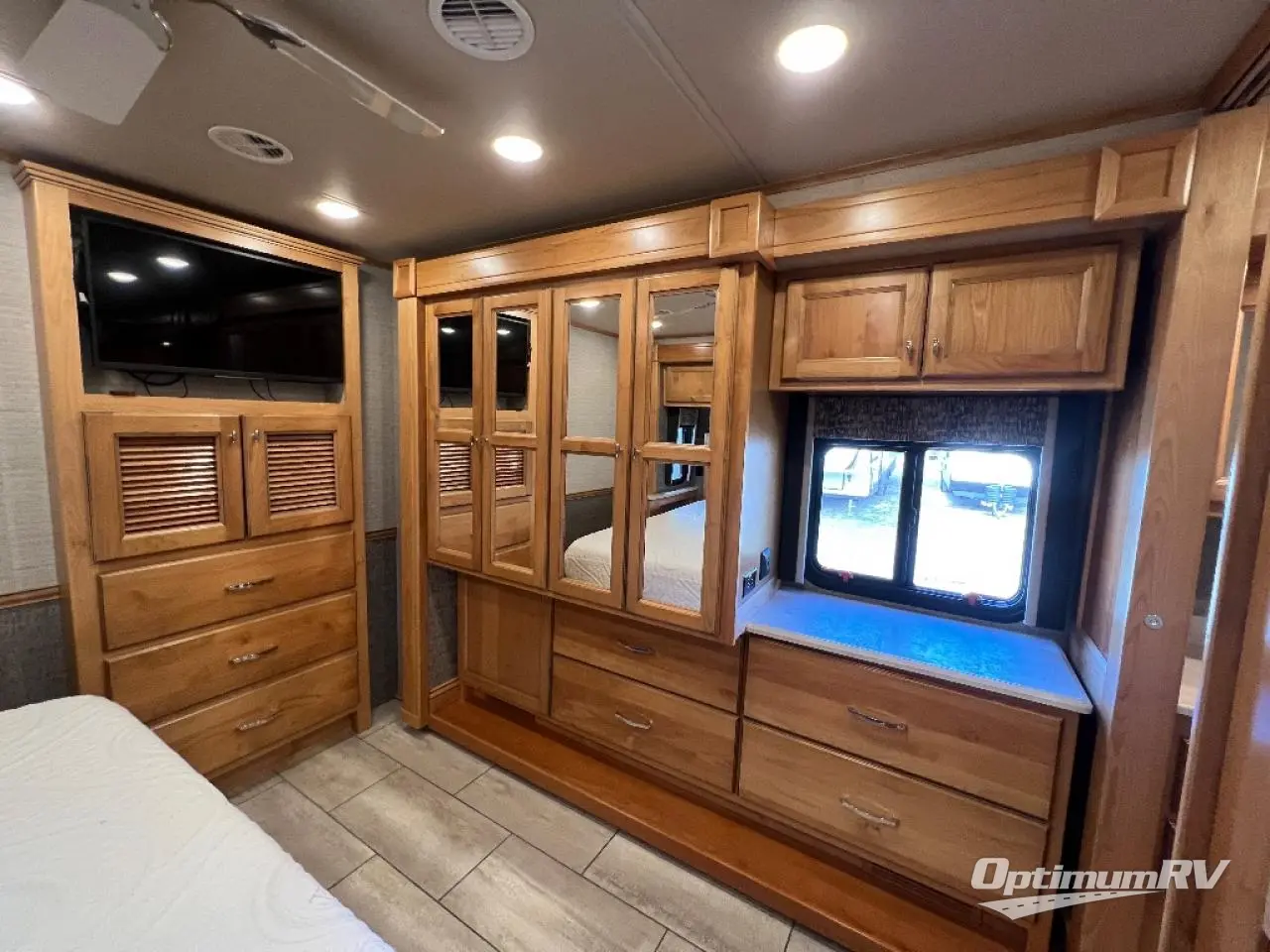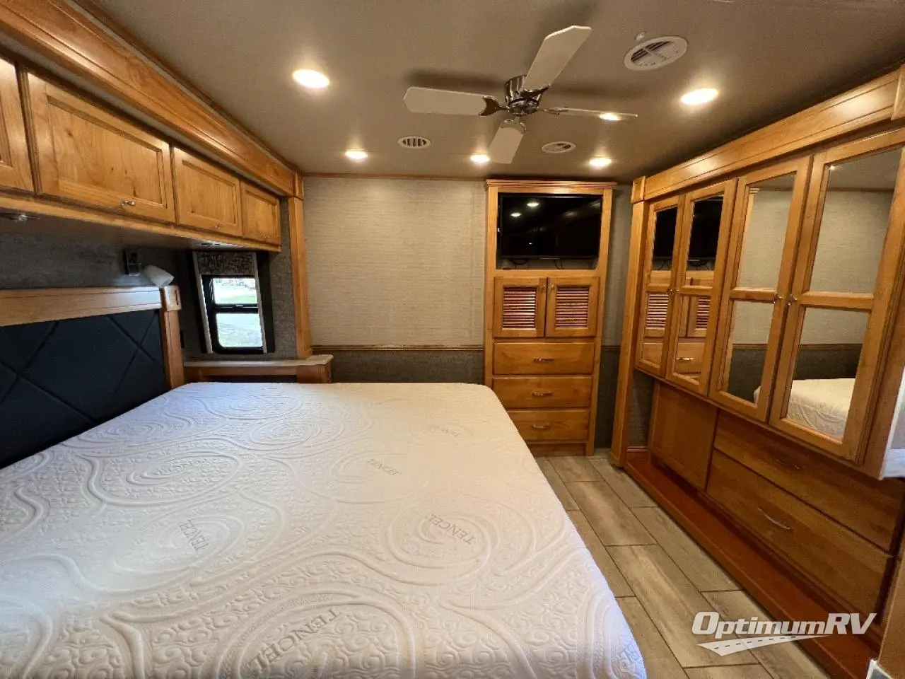 There are many standard luxurious features you will love about this motorhome! It also has many optional features you can add like the optional drop-down front bunk, the super sofa, the air coil sofa bed, the dinette with computer work station, and the dining bar with cabinet, printer, shelf, and file drawer below for an office on wheels. The king bed slide in the rear private bedroom offers a comfortable place to sleep, as well as the ultraleather flip and fold sofa bed and even the booth dinette once converted. The bedroom has lots of places to store your clothes between the bank of drawers below the single cabinet with TV, the wardrobe with drawers below, and the overhead cabinet with drawers below it. Plus, it has an entrance into the dual entry bathroom which has a shower with a seat and an area prepped to add an optional washer and dryer so you can extend your trip with clean clothes!