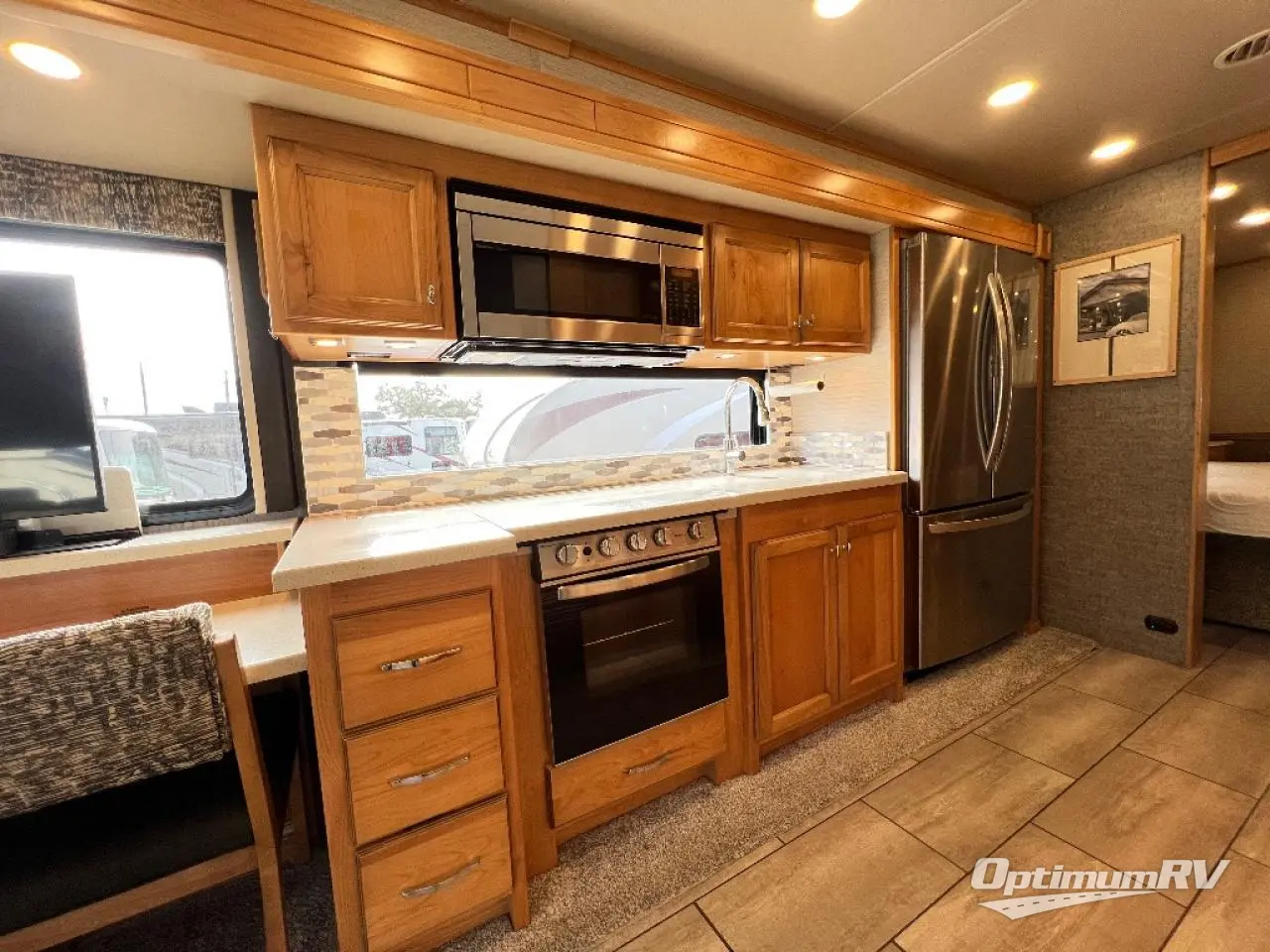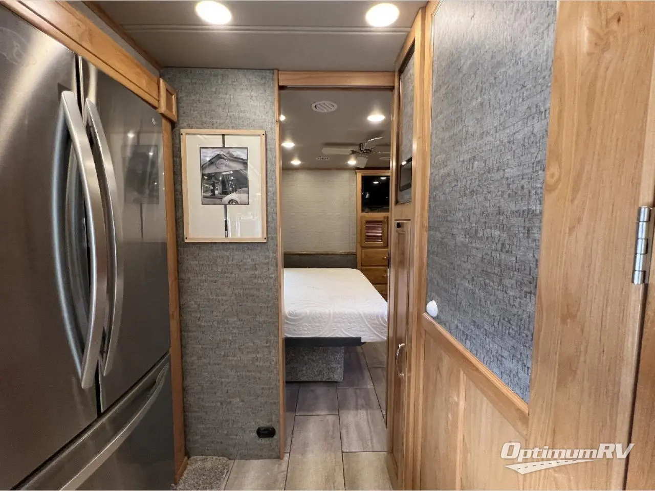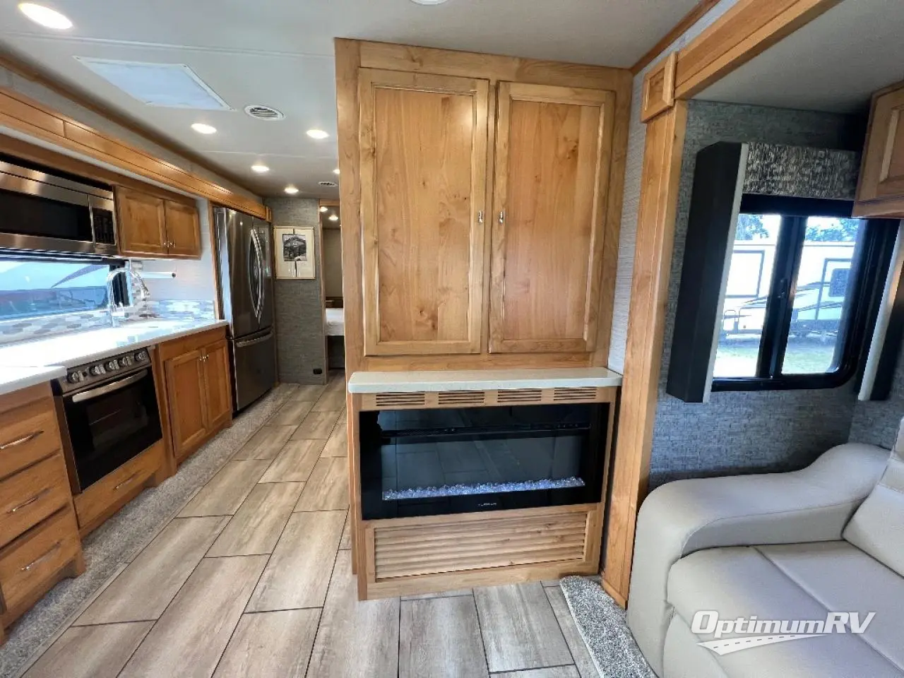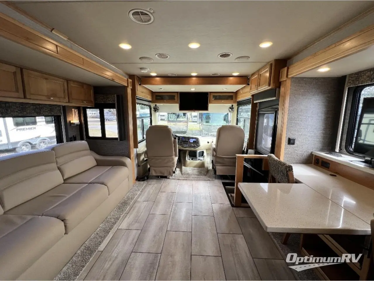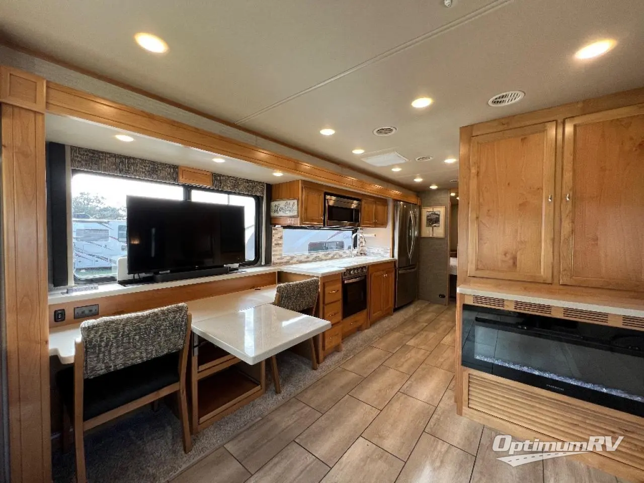 There are many standard luxurious features you will love about this motorhome! It also has many optional features you can add like the optional drop-down front bunk, the super sofa, the air coil sofa bed, the dinette with computer work station, and the dining bar with cabinet, printer, shelf, and file drawer below for an office on wheels. The king bed slide in the rear private bedroom offers a comfortable place to sleep, as well as the ultraleather flip and fold sofa bed and even the booth dinette once converted. The bedroom has lots of places to store your clothes between the bank of drawers below the single cabinet with TV, the wardrobe with drawers below, and the overhead cabinet with drawers below it. Plus, it has an entrance into the dual entry bathroom which has a shower with a seat and an area prepped to add an optional washer and dryer so you can extend your trip with clean clothes!