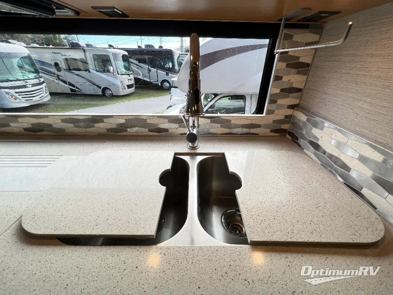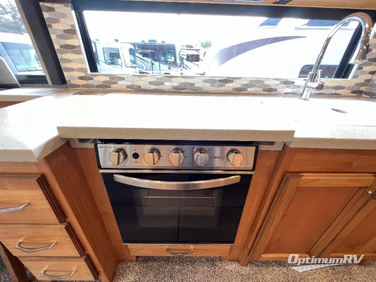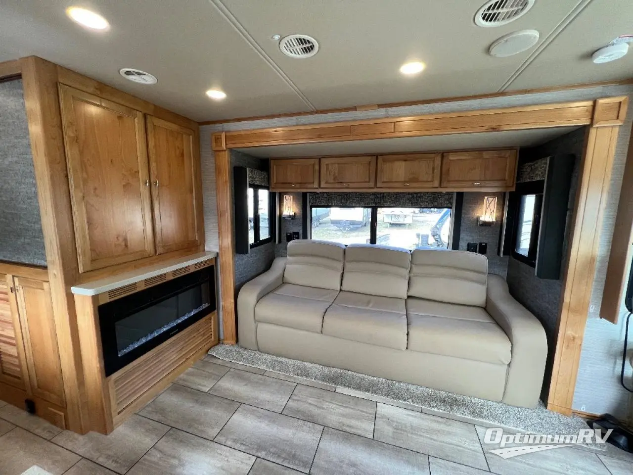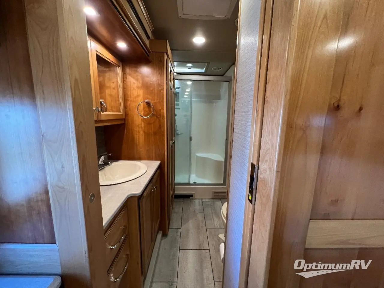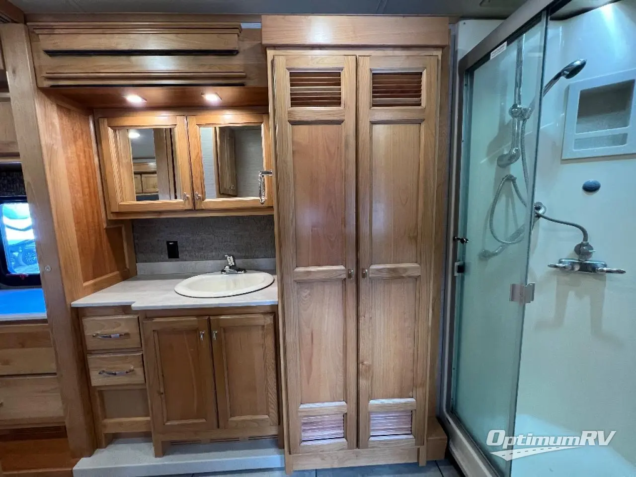 There are many standard luxurious features you will love about this motorhome! It also has many optional features you can add like the optional drop-down front bunk, the super sofa, the air coil sofa bed, the dinette with computer work station, and the dining bar with cabinet, printer, shelf, and file drawer below for an office on wheels. The king bed slide in the rear private bedroom offers a comfortable place to sleep, as well as the ultraleather flip and fold sofa bed and even the booth dinette once converted. The bedroom has lots of places to store your clothes between the bank of drawers below the single cabinet with TV, the wardrobe with drawers below, and the overhead cabinet with drawers below it. Plus, it has an entrance into the dual entry bathroom which has a shower with a seat and an area prepped to add an optional washer and dryer so you can extend your trip with clean clothes!