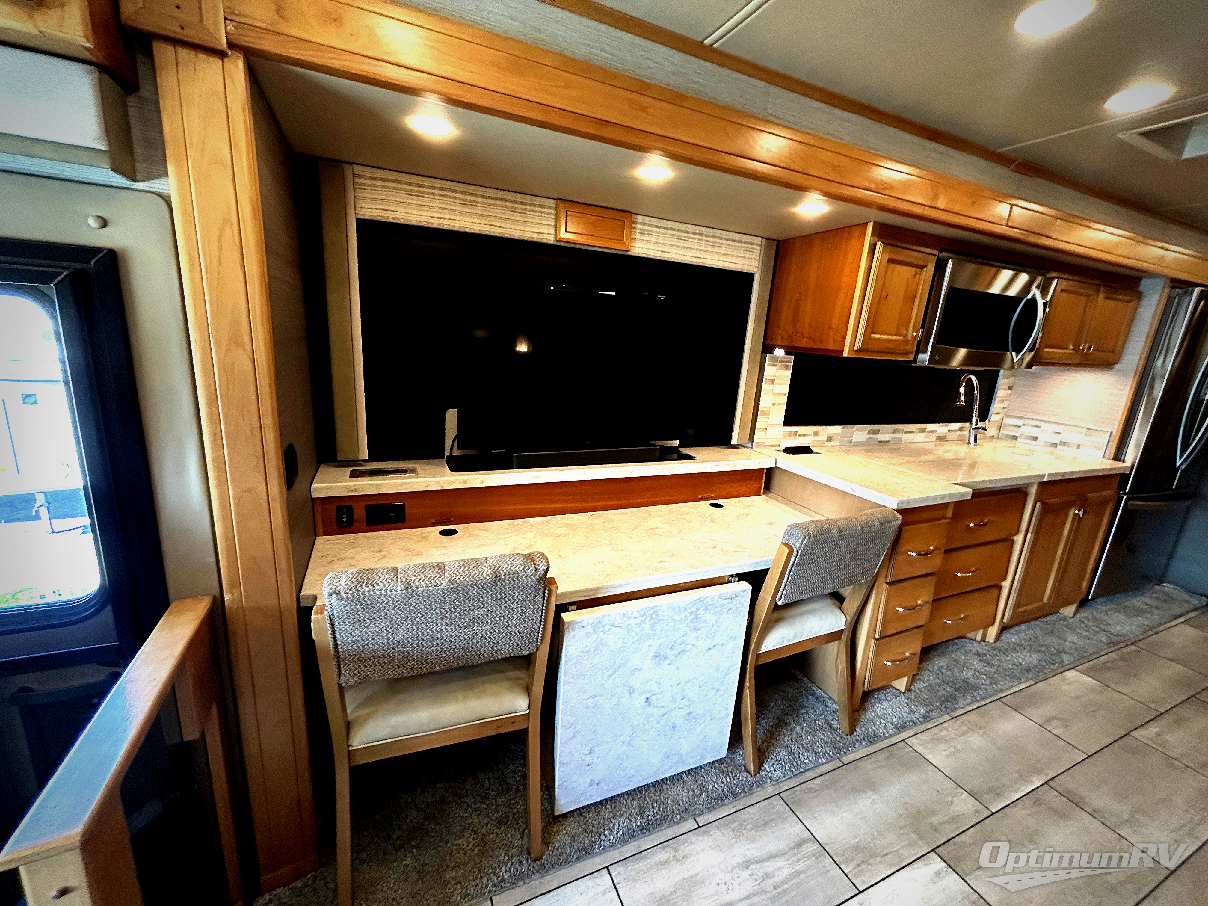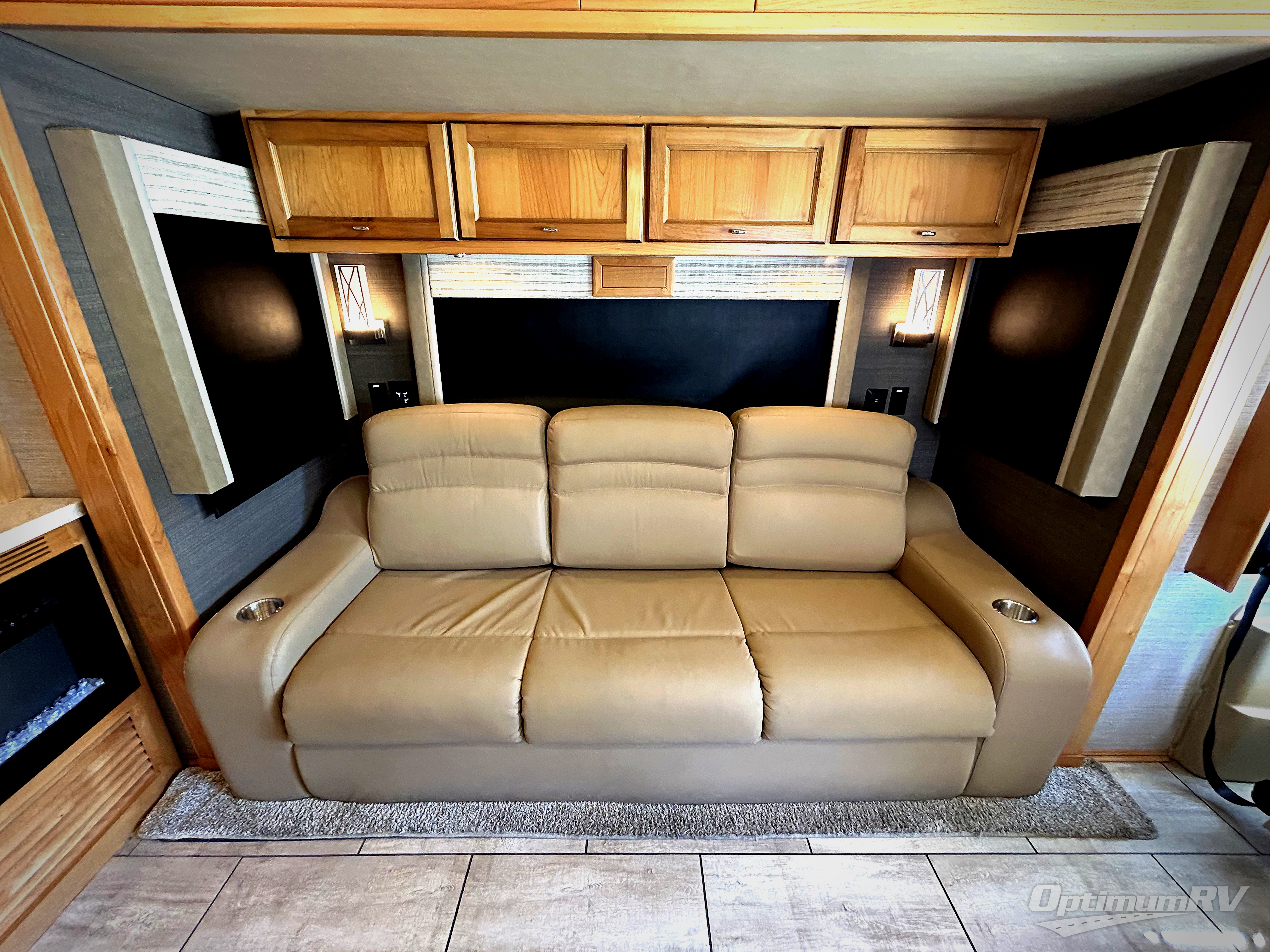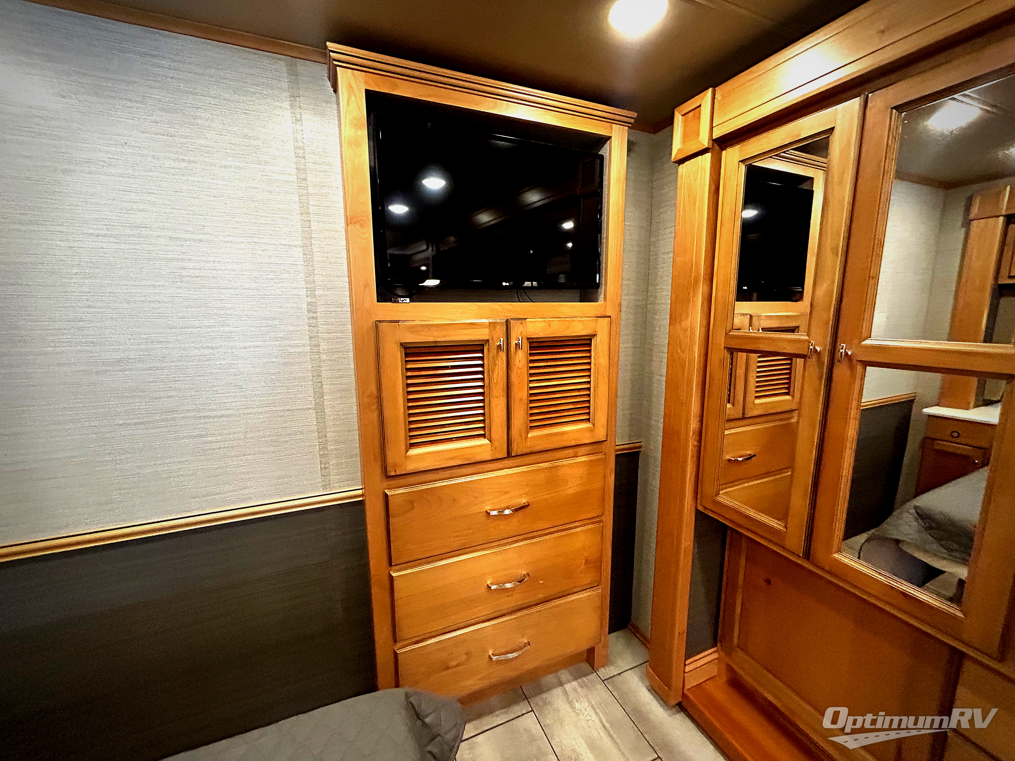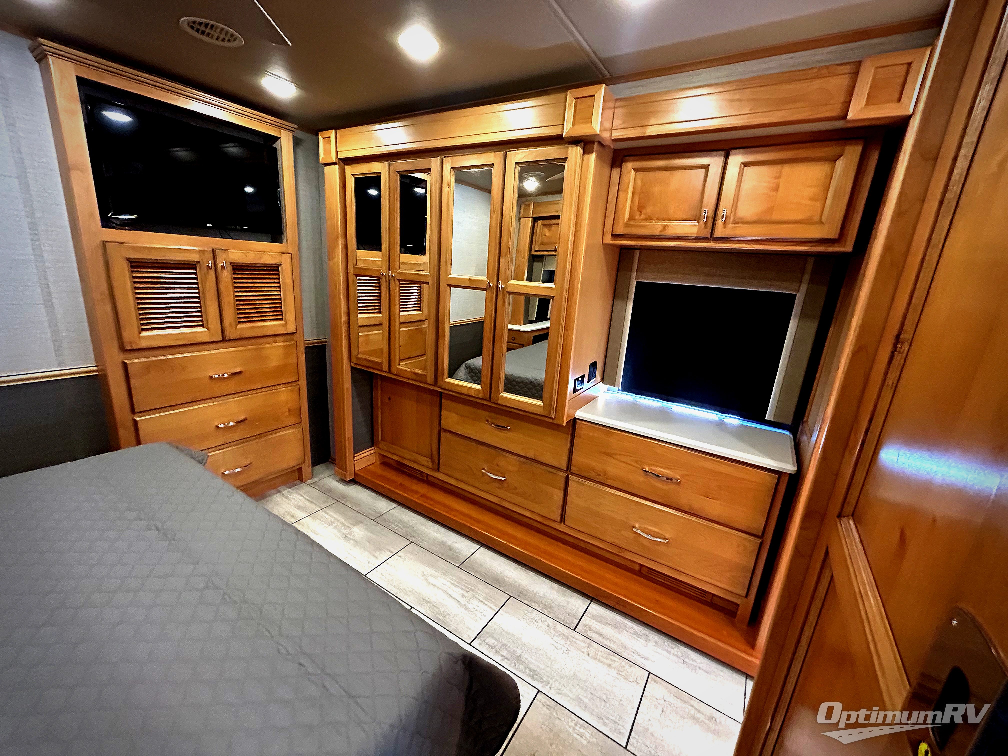 There are many standard luxurious features you will love about this motorhome! It also has many optional features you can add like the optional drop-down front bunk, the super sofa, the air coil sofa bed, the dinette with computer work station, and the dining bar with cabinet, printer, shelf, and file drawer below for an office on wheels. The king bed slide in the rear private bedroom offers a comfortable place to sleep, as well as the ultraleather flip and fold sofa bed and even the booth dinette once converted. The bedroom has lots of places to store your clothes between the bank of drawers below the single cabinet with TV, the wardrobe with drawers below, and the overhead cabinet with drawers below it. Plus, it has an entrance into the dual entry bathroom which has a shower with a seat and an area prepped to add an optional washer and dryer so you can extend your trip with clean clothes!