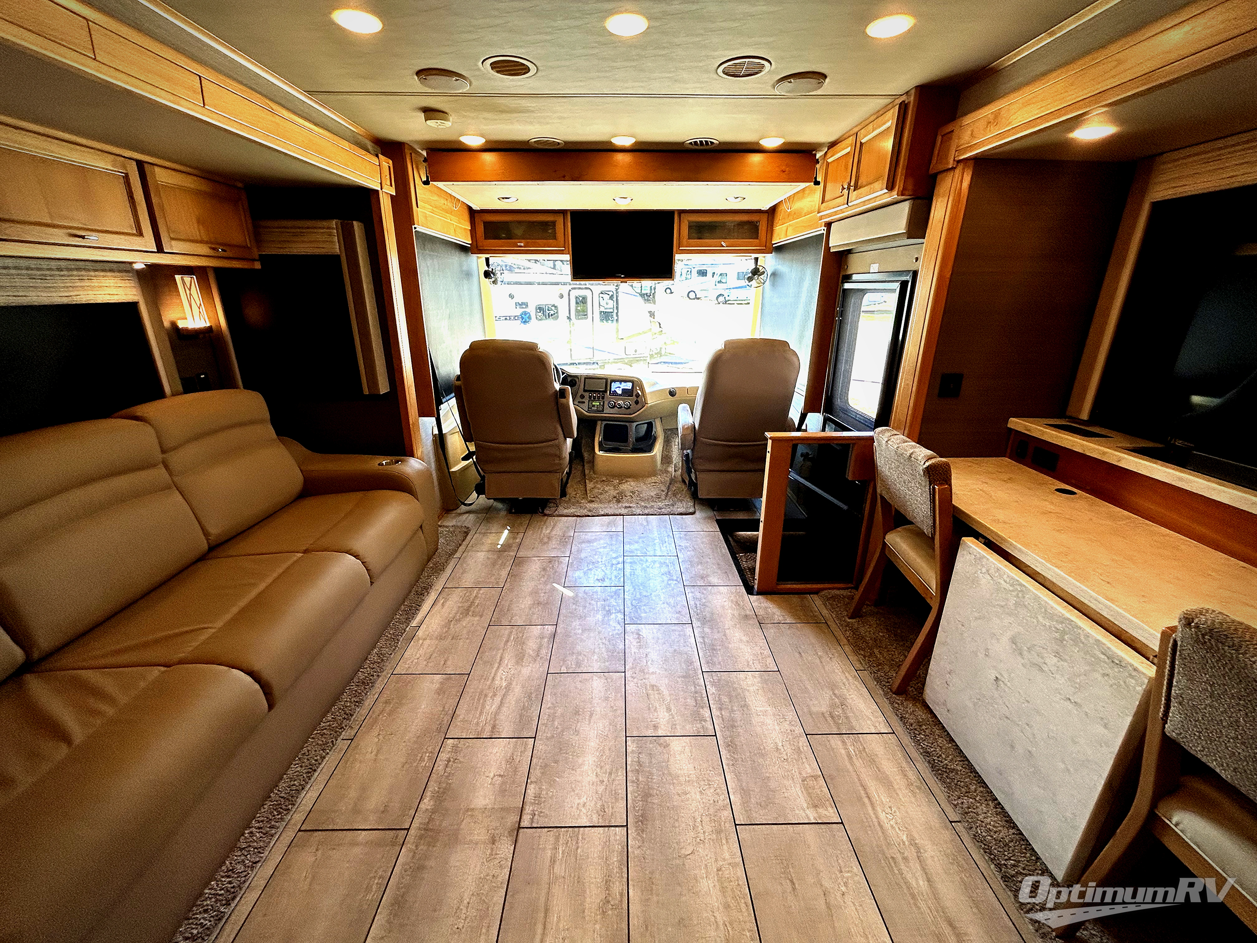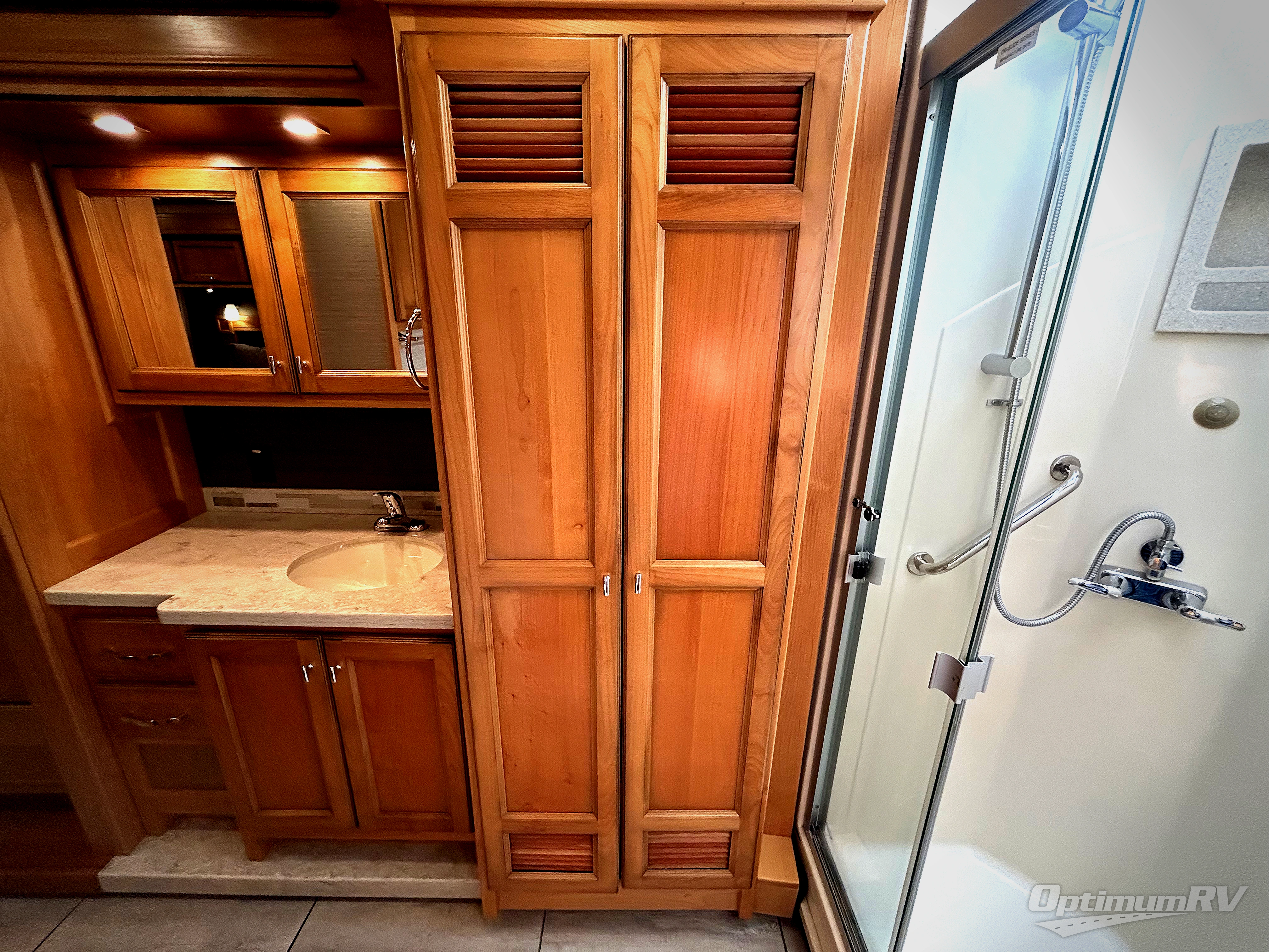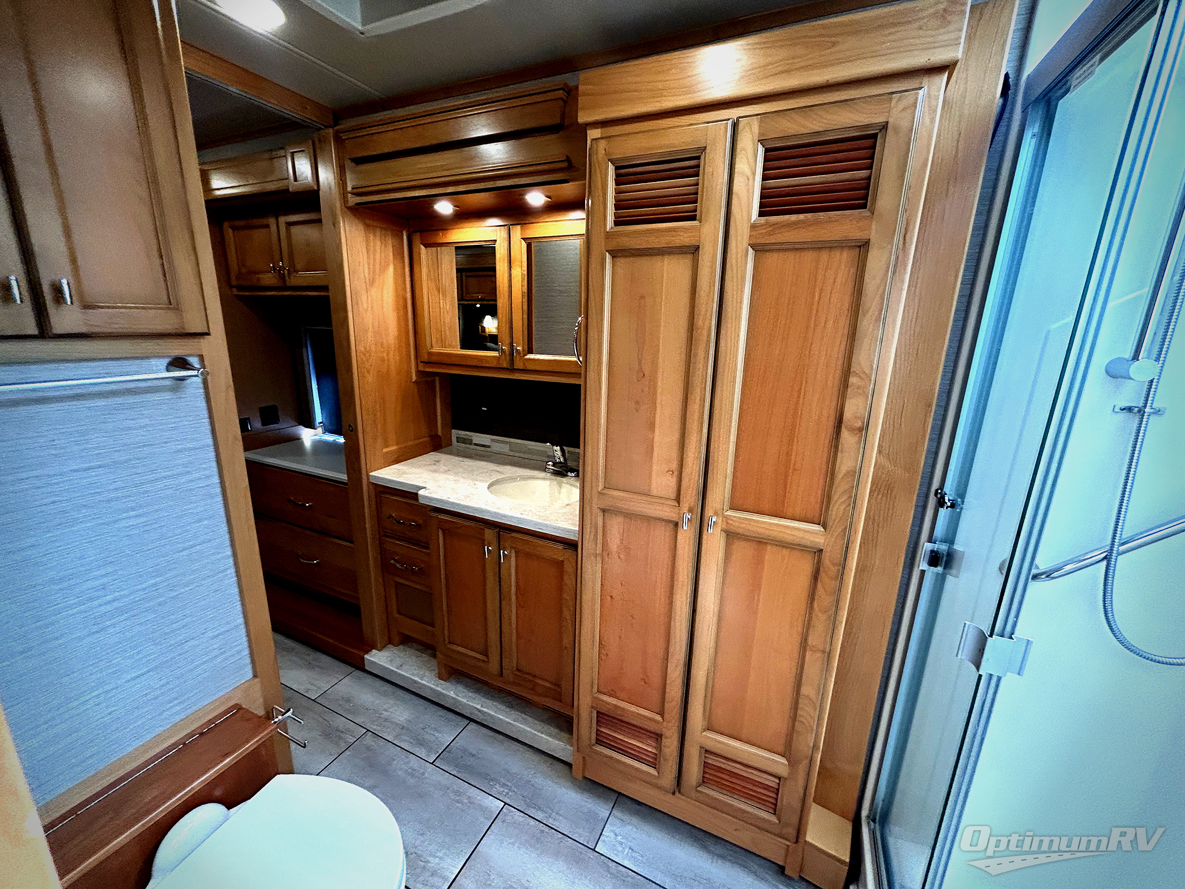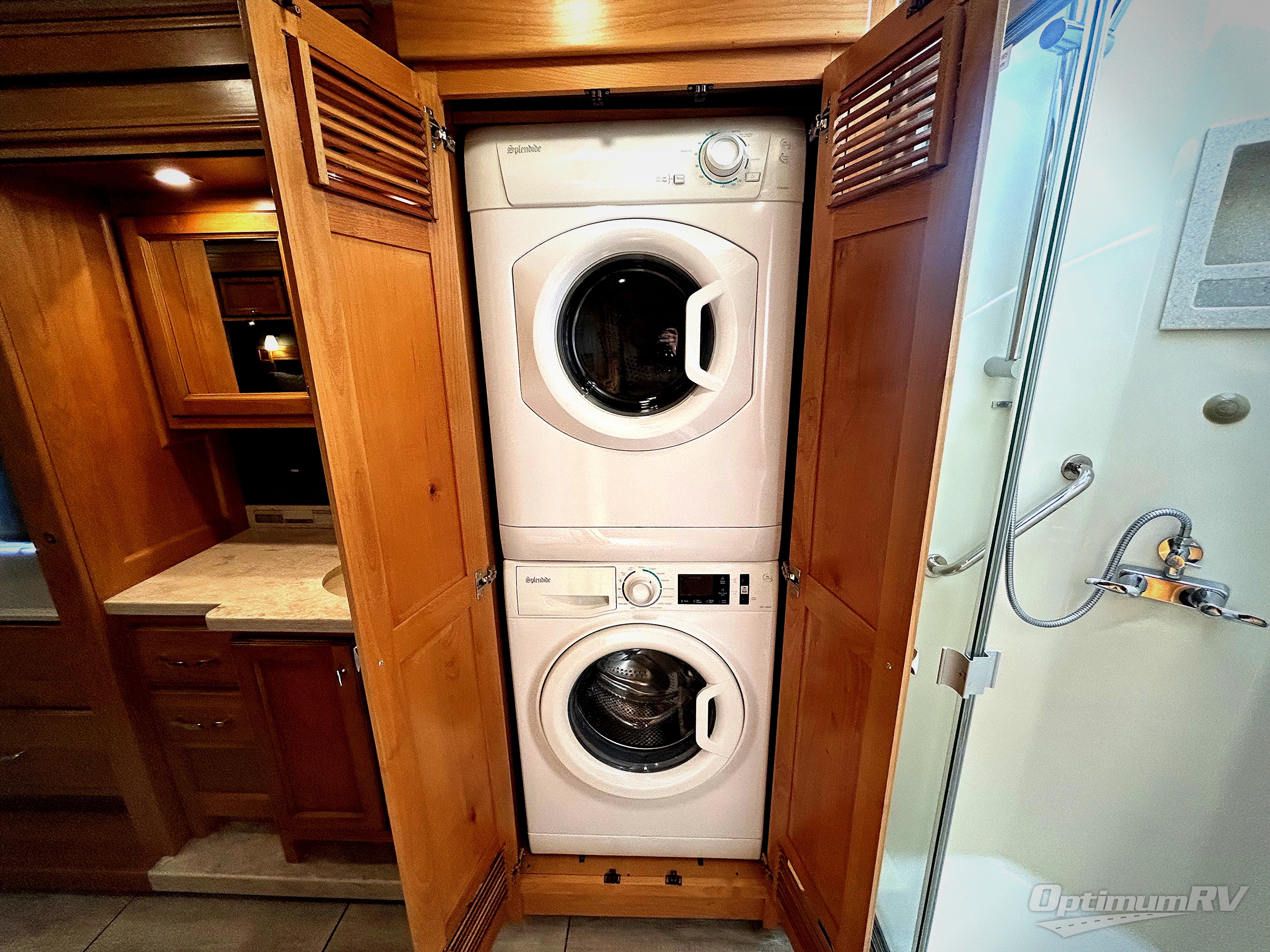 There are many standard luxurious features you will love about this motorhome! It also has many optional features you can add like the optional drop-down front bunk, the super sofa, the air coil sofa bed, the dinette with computer work station, and the dining bar with cabinet, printer, shelf, and file drawer below for an office on wheels. The king bed slide in the rear private bedroom offers a comfortable place to sleep, as well as the ultraleather flip and fold sofa bed and even the booth dinette once converted. The bedroom has lots of places to store your clothes between the bank of drawers below the single cabinet with TV, the wardrobe with drawers below, and the overhead cabinet with drawers below it. Plus, it has an entrance into the dual entry bathroom which has a shower with a seat and an area prepped to add an optional washer and dryer so you can extend your trip with clean clothes!